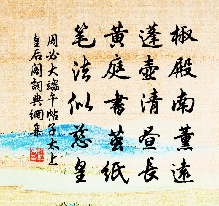 詩詞名句歷史字典書法欣賞書法字典國語詞典說文解字康熙字典古漢語字典標 題 作 者 詩 句 端午帖子太上皇后閣作者:周必大 朝代:宋代端午帖子太上皇后閣原文椒殿南薰遠,蓬壺清晝長。黃庭書繭紙,筆法似慈皇。詩詞問答問:端午帖子太上皇后閣的作者是誰?答:周必大問:端午帖子太上皇后閣寫於哪個朝代?答:宋代周必大端午帖子太上皇后閣書法欣賞端午帖子太上皇后閣書法作品詩詞推薦江州重別薛六柳八二員外劉長卿〔唐代〕生涯豈料承優詔,世事空知學醉歌。江上月明胡雁過,淮南木落楚山多。寄身且喜滄洲近,顧影無如白髮何。今日和利州鮮于轉運公劇八詠間燕亭司馬光〔宋代〕吏治正倥傯,夫君何燕間。蠶絲既雲寡,符移皆可刪。印封人事散,躡屐升東山。放杖坐危亭,清嘯出去間。無私渭村退居寄禮部崔侍郎翰林錢舍人詩一百韻白居易〔唐代〕新地元和歲,閒居渭水陽。不才甘命舛,多幸遇時康。朝野分倫序,賢愚定否臧。重文疏卜式,尚少棄馮唐。由是四疊劉克莊〔宋代〕帶雨折來如有恨,被風催去最關情。面垂玉筯居然白,身著銖衣直是輕。滿江紅張孝祥〔宋代〕秋滿漓源,瘴雲淨、曉山如簇。動遠思、空江小艇,高丘喬木。策策西風雙鬢底,暉暉斜日朱欄曲。試側身、回首所學吟邵雍〔宋代〕人之所學,本學人事。人事不修,無學何異。喜李翰自越至劉長卿〔唐代〕南浮滄海上,萬里到吳台。久別長相憶,孤舟何處來。春風催客醉,江月向人開。羨爾無羈束,沙鷗獨不猜。魏漕彥成昔宰弋陽政績上聞召對改秩予適當詞胡寅〔宋代〕紹興乙卯選賢時,弋水鳴琴有去思。文石對敭言動聽,演綸無愧改官詞。意緒韓偓〔唐代〕絕代佳人何寂寞,梨花未發梅花落。東風吹雨入西園,銀線千條度虛閣。臉粉難勻蜀酒濃,口脂易印吳綾薄。嬌饒歸途馬上二首趙蕃〔宋代〕兀兀真成去,悠悠莫自嫌。陽光施德惠,風力霽威嚴。不待投醪賜,端同挾纊兼。山林從爾老,歲月豈余淹。楞嚴六根非眼能見釋慧遠〔宋代〕阿那律陀天眼觀,大千攝入一毫端。掌中謾說庵摩勒,無限蒼生被熱謾。寄劉伯山趙蕃〔宋代〕魁梧任嘲劇,短少蓋風流。邂逅為頤解,殷勤成刺投。遙知江夏閣,不減仲宣樓。頗願相從去,湖南兵未休。念奴嬌張榘〔宋代〕三閭何在,把離騷細讀,幾番擊節。蘺蕙椒蘭紛江渚,較以艾蕭終別。清濁同流,醉醒一夢,此恨誰能說。忠魂耿偶掇野蔬寄襲美有作陸龜蒙〔唐代〕野園煙里自幽尋,嫩甲香蕤引漸深。行歇每依鴉舅影,挑頻時見鼠姑心。凌風藹彩初攜籠,帶露虛疏或貯襟。欲助布袋腳跡石上現釋智朋〔宋代〕名與長江萬古流,當時狼藉若為收。腳跟只為不點地,又涴橋邊塊石頭。酬樂天勸醉元稹〔唐代〕神曲清濁酒,牡丹深淺花。少年欲相飲,此樂何可涯。沉機造神境,不必悟楞伽。酡顏返童貌,安用成丹砂。劉伶題大明寺仲並〔宋代〕招提隱松桂,遠在城一隅。我來歲雲暮,天寒氣象殊。寓目得佳趣,百念如滌除。及此齋時鐘,簞瓢慰吾臞。丈室勤政樓觀樂賈至〔唐代〕銀河帝女下三清,紫禁笙歌出九城。為報延州來聽樂,須知天下欲昇平。次韻瑞蓮方岳〔宋代〕得種初非相府蓮,誰令連蒂擢山泉。東西玉已幾相屬,大小喬今雙欲仙。塢早荷嘉真是矣,人言花是豈其然。山居舟中作偈釋楚圓〔宋代〕長江行不盡,帝里到何時。既得涼風便,休將艣棹施。名句推薦君子以言有物而行有恆。佚名《易傳·象傳下·家人》 對瀟瀟暮雨灑江天,一番洗清秋。柳永《八聲甘州·對瀟瀟暮雨灑江天》 君子不器。孔子弟子《論語·為政篇》 忽然更作漁陽摻,黃雲蕭條白日暗。李頎《聽安萬善吹觱篥歌》 曲徑穿花尋蛺蝶,虛闌傍日教鸚鵡。岳珂《滿江紅·小院深深》 人而無信,不知其可也。孔子弟子《論語·為政篇》 南山與秋色,氣勢兩相高。杜牧《長安秋望》 漢寢唐陵無麥飯,山溪野徑有梨花。趙鼎《寒食》 佳人應怪我,別後寡信輕諾。柳永《尾犯·夜雨滴空階》 家必自毀,而後人毀之。孟子《孟子·離婁章句上·第八節》