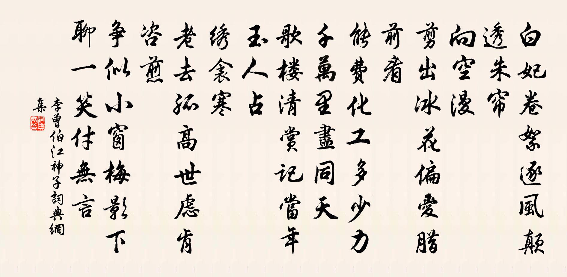 詩詞名句歷史字典書法欣賞書法字典國語詞典說文解字康熙字典古漢語字典標 題 作 者 詩 句 江神子/江城子作者:李曾伯 朝代:宋代江神子/江城子原文白妃卷絮逐風顛。透朱簾。向空漫。剪出冰花,偏愛臘前看。能費化工多少力,千萬里,盡同天。歌樓清賞記當年。玉人占。繡衾寒。老去孤高,世慮肯咨煎。爭似小窗梅影下,聊一笑,付無言。詩詞問答問:江神子/江城子的作者是誰?答:李曾伯問:江神子/江城子寫於哪個朝代?答:宋代問:江神子/江城子是什麼體裁?答:詞李曾伯江神子/江城子書法欣賞江神子/江城子書法作品詩詞推薦送淨道人徐鉉〔唐代〕北阜與西山,前期夢寐間。羨師乘興去,應擬此生閒。喬木人誰在,鱸魚我未還。歸心寄秋水,東去日潺潺。瓜洲道中送李端公南渡後,歸揚州道中寄劉長卿〔唐代〕片帆何處去,匹馬獨歸遲。惆悵江南北,青山欲暮時。偶成蕭元之〔宋代〕少年鞍馬疾如飛,賣盡儒衣買戰衣。老去不知筋力減,夜闌猶夢解重圍。西江月(遁齋生日,有以喜神之軸來為壽者,懸之照壁,遂作。)郭應祥〔宋代〕此老誰描拙狀,今朝持獻生辰。一人能變作三人。說與兒曹未信。坐者行者立者,化身報身法身。且須辨取假和真別子才司令方岳〔宋代〕不如意事常 * ,可與語人無二三。自識荊門子才甫,夢馳鐵馬戰城南。送簡賀州五首舒邦佐〔宋代〕我作送行詩,勤終鋪美意。吾君方急賢,侍從有虛位。兩府多故人,東閣欠奇士。如送鄭尚書,韻必以來字。吳姬曲 其五王冕〔元代〕吳姬醉,對面接花作嬌態。腰柔頸軟未成眠,斜倚東風說憔悴。坐中狂客不勝情,笑拍香肩呼小妹。呼小妹,明日偈二十二首釋洵〔宋代〕昔人三箭定天山,自謂英雄蓋世間。何似雪峰一隻箭,等閒穿過石門關。張運判□□之母呂宜人輓詩魏了翁〔宋代〕昔在傷皇辟,子行猶不歸。嫠居言有則,喪事禮無違。軻母三遷教,萊兒七十衣。至今霜月夜,松竹帶芳徽。好時光·寶髻偏宜宮樣李隆基〔唐代〕寶髻偏宜宮樣,蓮臉嫩,體紅香。眉黛不須張敞畫,天教入鬢長。莫倚傾國貌,嫁取個,有情郎。彼此當年少,莫秋屏作趙師秀〔宋代〕凡有欄乾處,秋來遍往還。就中惟此地,全得見西山。雁落遙沙小,人登廢壘閒。因憐一州景,皆在夕陽間。答句曲陶先生詩范雲〔南北朝〕終朝吐祥霧。薄晚孕奇煙。洞澗生芝草。重崖出醴泉。中有懷真士。被褐守沖玄。石戶棲十金壇謁九仙。乘鵷方履答友人招游姚合〔唐代〕不來知盡怪,失意懶春遊。聞鳥寧驚夢,看花怕引愁。賭棋招敵手,沽酒自扶頭。何似華筵上,推辭候到籌。河間府居庸疊翠〔元代〕斷崖萬仞如削鐵,鳥飛不度苔石裂。嵯岈枯木無碧柯,六月太陰飄急雪。寒沙茫茫出關道,駱駝夜吼黃雲老。征鴻頌古釋道顏〔宋代〕舉起竹篦子,如何便道家。秘魔岩不會,隨後便擎叉。水龍吟(丙辰生日)劉克莊〔宋代〕兒童不識樗翁,挽衣借問年今幾。少如彥國,大如君實,披襟高比。德業天淵,有些似處,鬚眉而已。願老身無事過曹娥江葛紹體〔宋代〕依舊臨江鎮廟門,參差江樹帶春雲。男兒愧死知多少,我欲重招孝女魂。霜後紀園中草木十二絕范成大〔宋代〕清霜染柿葉,荒園有佳趣。留連伴歲晚,莫作流紅去。王倅成老輓詩二首王炎〔宋代〕末俗輕浮甚,斯人有古風。持身無表襮,為吏極清通。學似武平一,仕如張長公。龜趺宜篆刻,潛德照無窮。清平樂程節齋〔宋代〕吾家三母。先後相為壽。管領諸郎盡明秀。都是婺女星宿。華筵今日居先。適逾甲子周天。敬以莊椿為祝,舉觴我名句推薦明月松間照,清泉石上流。王維《山居秋暝》 黃鶯百舌正相呼,玉樹後庭花帶雨。牛殳《琵琶行》 愔愔坊陌人家,定巢燕子,歸來舊處。周邦彥《瑞龍吟·大石春景》 卻憶安石風流,東山歲晚,淚落哀箏曲辛棄疾《念奴嬌·登建康賞心亭呈史致道留守》 綴玉聯珠六十年,誰教冥路作詩仙。李忱《吊白居易》 三五年時三五月,可憐杯酒不曾消。黃景仁《綺懷》 望斷金馬門,勞歌采樵路。孟浩然《田園作》 因思杜陵夢,鳧雁滿回塘。溫庭筠《商山早行》 憑空怒浪兼天涌,不盡六朝聲。歸莊《錦堂春·半壁橫江矗起》 春水滿四澤,夏雲多奇峰。陶淵明《四時》
