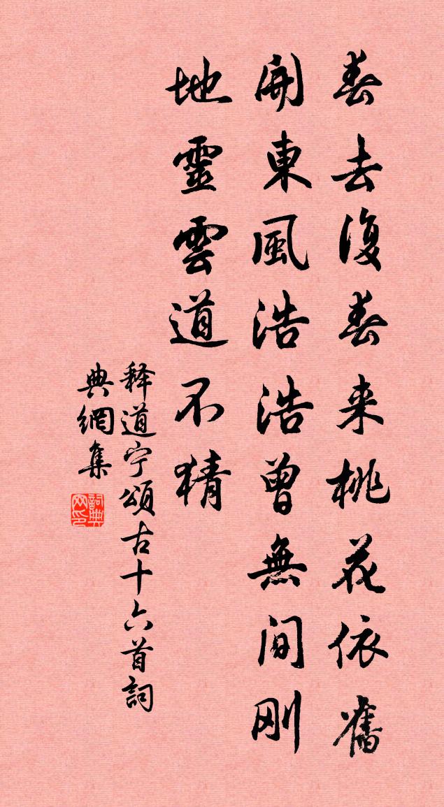 詩詞名句歷史字典書法欣賞書法字典國語詞典說文解字康熙字典古漢語字典標 題 作 者 詩 句 頌古十六首作者:釋道寧 朝代:宋代頌古十六首原文春去復春來,桃花依舊開。東風浩浩曾無間,剛地靈雲道不猜。詩詞問答問:頌古十六首的作者是誰?答:釋道寧問:頌古十六首寫於哪個朝代?答:宋代釋道寧頌古十六首書法欣賞頌古十六首書法作品詩詞推薦下第後上李中丞趙嘏〔唐代〕落第逢人慟哭初,平生志業欲何如。鬢毛灑盡一枝桂,淚血滴來千里書。谷外風高摧羽翮,江邊春在憶樵漁。唯應題江南程氏家清風閣宋庠〔宋代〕臨波飛閣迓層飈,溽暑狂酲此並銷。客至自同仙寇御,舟歸不減鄭公樵。雲明別島朝虹飲,月碎前溪夜鯉跳。借問孤山寺林逋〔宋代〕雲峰水樹南朝寺,祇隔叢篁作並鄰。破殿靜披虀臼古,齋房閒試酷奴春。白公睡閣幽如畫,張祜詩牌妙入神。乘興小山歌萬楚〔唐代〕人說淮南有小山,淮王昔日此登仙。城中雞犬皆飛去,山上壇場今宛然。世人貴身不貴壽,共笑華陽洞天口。不知荷沼趙方〔宋代〕露珠顆顆盪青荷,雲錦重重鋪碧波。外直中通心獨苦,擬諸君子待如何。春江曲二首張仲素〔唐代〕家寄征河岸,征人幾歲游。不如潮水信,每日到沙頭。乘曉南湖去,參差疊浪橫。前洲在何處,霜里雁嚶嚶。其三李賀〔唐代〕南山何其悲,鬼雨灑空草。長安夜半秋,風前幾人老。低迷黃昏徑,裊裊青櫟道。月午樹無影,一山唯白曉。漆炬送文瘦牛釋智愚〔宋代〕一味清寒骨拄皮,且無心力去扶犁。江湖儘儘有閒地,況是春風草長時。梅亭戴表元〔宋代〕東海窮詩客,西風古驛亭。發從殘歲白,山入故鄉青。世事徒三窟,兒童且一經。丁寧速賒酒,煮粟試沙瓶。端午帖子太上皇帝閣周必大〔宋代〕寶箑裁新樣,團團玉柄寒。御書真翥鳳,仙女莫乘鸞。效阮公詩江淹〔南北朝〕擾擾當途子。毀譽多埃塵。朝生輿馬間。夕死衢路濱。藜藿應見棄。勢位乃為親。華屋爭結綬。朱門競彈巾。徒羨光頃為諸生嘗受經於錢丈學賦於張丈今乃叨忝司馬光〔宋代〕疇昔勝冠日,曾為絳賬生。九言聞善教,一顧得虛聲。不意叨嚴近,於今接老成。寧須詩酒賜,侍坐已知榮。向歸仁砌下看。思黯歸仁宅亦有小灘。白居易〔唐代〕為憐清淺愛潺湲,一日三回到水邊。若道歸仁灘更好,主人何故別三年?郭處士擊甌歌溫庭筠〔唐代〕佶栗金虬石潭古,勺陂瀲灩幽修語。湘君寶馬上神雲,碎佩叢鈴滿煙雨。吾聞三十六宮花離離,軟風吹春星斗稀。送程左史以右撰知夔州分韻得重字魏了翁〔宋代〕菸草暝江湖,霜風纈郊壟。黎明北門道,雜遝冠蓋擁。程侯倦左墄,引去何太勇。滬江春信回,書殿星極捧。帝念新年書感陸游〔宋代〕早歲西遊賦子虛,暮年負耒返鄉閭。殘軀未死敢忘國?病眼欲盲猶愛書。朋舊何勞記車笠,子孫幸不廢菑畲。新年奉挽靈泉明府東叔學士度正〔宋代〕西州文物起雷霆,四海一家仰聚星。五鳳翱翔橫碧落,雙鳧朝謁墮青冥。疑歸天上修仙史,恥向人間駕說鈴。長嘆新月危拱辰〔宋代〕未審初三月,嫦娥怨阿誰。嬾開十分鏡,祇畫一邊眉。清曉捲簾歐陽玭〔唐代〕清曉意未愜,捲簾時一吟。檻虛花氣密,地暖竹聲深。秀色還朝暮,浮雲自古今。石泉驚已躍,會可洗幽心。送饒州張使君朱慶餘〔唐代〕白頭為郡清秋別,山水南行豈覺賒。楚老只應思入境,吳兒從此去移家。館依高嶺分樟葉,路出重江見葦花。務退名句推薦玉屏風冷愁人。醉爛漫、梅花翠雲。吳文英《柳梢青·與龜翁登研意觀雪懷癸卯歲臘朝斷橋並馬之游》 萬里歸船弄長笛,此心吾與白鷗盟。黃庭堅《登快閣》 多情卻被無情惱。蘇軾《蝶戀花·春景》 夫有尤物,足以移人左丘明《左傳·昭公·昭公二十八年》 東山老,可堪歲晚,獨聽桓箏。葉夢得《八聲甘州·壽陽樓八公山作》 巧言令色,鮮矣仁。孔子弟子《論語·學而篇》 香非在蕊,香非在萼,骨中香徹。晁補之《鹽角兒·亳社觀梅》 四百年來成一夢,堪愁。王安石《南鄉子·自古帝王州》 暖風熏得遊人醉,直把杭州作汴州。林升《題臨安邸》 俱懷逸興壯思飛,欲上青天攬明月。李白《宣州謝朓樓餞別校書叔雲》