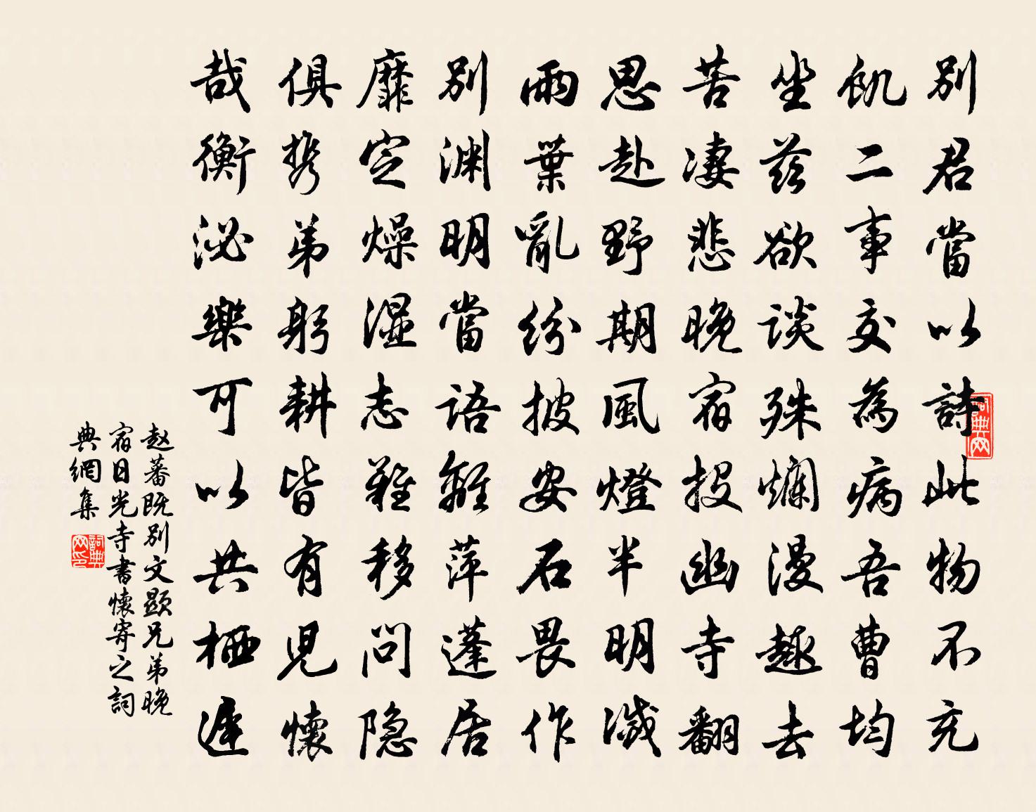 詩詞名句歷史字典書法欣賞書法字典國語詞典說文解字康熙字典古漢語字典標 題 作 者 詩 句 既別文顯兄弟晚宿日光寺書懷寄之作者:趙蕃 朝代:宋代原文別君當以詩,此物不充飢。二事交為病,吾曹均坐茲。欲談殊爛漫,趣去苦淒悲。晚宿投幽寺,翻思赴野期。風燈半明滅,雨葉亂紛披。安石畏作別,淵明當語離。萍蓬居靡定,燥濕志難移。問隱俱攜弟,躬耕皆有兒。懷哉衡泌樂,可以共棲遲。詩詞問答問:《既別文顯兄弟晚宿日光寺書懷寄之》的作者是誰?答:趙蕃問:該詩寫於哪個朝代?答:宋代書法欣賞既別文顯兄弟晚宿日光寺書懷寄之書法作品詩詞推薦紹興以後蜡祭四十二首佚名〔宋代〕蕩蕩鴻明,稱秩群祀。配以昔帝,式重農事。潔史圭瓉,黃流在中。靈其監茲,肸鄉豈融。石孫受命方岳〔宋代〕聖澤如春雨露寬,棄遺猶不絕衣冠。萬釘寶帶翁無分,一幅花綾孫有官。得免白丁何啻足,親曾黃甲不堪看。九經自淇涉黃河途中作十三首高適〔唐代〕川上常極目,世情今已閒。去帆釣魚落日,征路隨長山。親友若雲霄,可望不可攀。於茲任所愜,浩蕩風波間。清次韻張部門湖上二首項安世〔宋代〕已作西湖爛漫遊,北山蘭若更深幽。驊騮蹀變青林下,舴艋夷猶古渡頭。花滿楊坡桃不語,聲喧陰壑水爭投。可憐秦樓月/憶秦娥黎廷瑞〔宋代〕醒人眼。一枝玉雪疏籬晚。疏籬晚。精神曠逸。風姿凝遠。幽香零亂無人管。依依春恨天涯滿。天涯滿。霜城戍角題野店壁陸游〔宋代〕斷稿投衣橐,殘壺掛馬鞍。寺荒尋店久,橋敗涉溪寒。道里逢人問,題名拂壁看。平生慣行役,隨處得加餐。清風十韻李宗諤〔宋代〕閒館琴方回暑,琴商飈乍應琴金。天高初起籟,松澹更宜琴。汾棹傳歌遠,班詩托興深。東陽仁自琴,西顥氣還侵晚臥二首趙蕃〔宋代〕軒小才堪置竹床,晚來新浴快初涼。掃除諸妄歸真想,檐卜林中聞妙香。御賜真贊師演成四偈釋宗杲〔宋代〕隨物現處,廓清軍宇。不動神情,氣蠶項羽。望京謠劉子翬〔宋代〕雙鑾窗北狩淹歸窗轂,寂寞窗梁園春草綠。猶傳故老守孤城,官軍不到黃河曲。遲雲樓櫓已灰爐,更倚窗扉防箭鏃秋日詠樓感懷二首強至〔宋代〕公逾四十氣方強,未怕秋風作鬢霜。人物此時仍富樂,襟懷無事可悲涼。嚴塗行取青氈物,末路寧同白首郎。滿目會將作崔監東園姚合〔唐代〕牆北走紅塵,牆東接白雲。山光衣上見,藥氣酒中聞。此會誠堪惜,窮秋日又曛。人間唯有醉,醉後復何雲。用元韻答清老王炎〔宋代〕篆車創始自稚輪,筦簟從初但蒲稿。詩到晚唐非不佳,少似國風能理到。嗟予耄矣棄潁泓,臥病終年長卻掃。客無上巳日洛岸獨游寄陳永寧張耒〔宋代〕風雩感賢游,嘉節偶乘興。人稀好鳥語,麥秀春野靜。澄波漾清洛,遊子渡明鏡。南山夜來雨,雲日淡相應。解鞍過潤陂橋三首楊萬里〔宋代〕潤陂初上板橋時,欲入江東尚未知。忽見橋心界牌子,腳根一半出江西。重陽李石〔宋代〕得得浮家帝里游,西歸節物共南州。群鷗自得水空闊,遠客肯因船滯留。千頃白苹風掠岸,一年 * 雨深秋。醉名宗兄端叟年七十六來訪二首方回〔宋代〕年才逾壯早相知,北騎南船幾別離。二老皆鄰八旬壽,一生誰賦萬篇詩,特承枉顧元無說。獲侍同行識者誰,流水和張可投詩十首王洋〔宋代〕聲猶在耳鳥關關,過眼庭陰作午班。香篆靜中便細看,綠蘿新處得高攀。送陳秀才還沙上省墓高啟〔明代〕滿衣血淚與塵埃,亂後還鄉亦可哀。風雨梨花寒食過,幾家墳上子孫來?次韻子夷兄弟十首張耒〔宋代〕金馬聊代耕,淺郎亦為官。何必歌五噫,遭非如伯鸞。物生各自遂,蕭艾與芝蘭。詩人亦多事,屑屑計鶉貆。名句推薦杜漸防萌,慎之在始。房玄齡《晉書·列傳·第六十八章》 霜風搗盡千林葉,閒倚筇枝數鸛巢。范成大《冬日田園雜興》 小酌酒巡銷永夜,大開口笑送殘年。白居易《雪夜小飲贈夢得》 天地玄黃,宇宙洪荒。周興嗣《千字文·全文》 彩線輕纏紅玉臂,小符斜掛綠雲鬟。蘇軾《浣溪沙·端午》 煙塵犯雪嶺,鼓角動江城。杜甫《歲暮》 青青河畔草,綿綿思遠道。佚名《飲馬長城窟行》 昨夜笙歌容易散,酒醒添得愁無限馮延巳《鵲踏枝·梅落繁枝千萬片》 卦也者,著天下之時也。爻也者,效天下之動也。王通《中說·卷七·述史篇》 相見易得好,久住難為人。佚名《增廣賢文·上集》