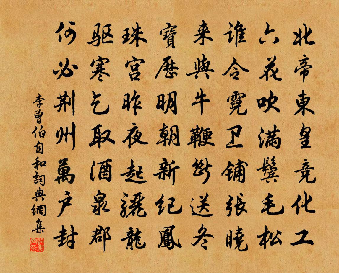 詩詞名句歷史字典書法欣賞書法字典國語詞典說文解字康熙字典古漢語字典標 題 作 者 詩 句 自和作者:李曾伯 朝代:宋代自和原文北帝東皇競化工,六花吹滿鬢毛松。誰令霓衛鋪張曉,來與牛鞭斷送冬。寶曆明朝新紀鳳,珠宮昨夜起驪龍。驅寒乞取酒泉郡,何必荊州萬戶封。詩詞問答問:自和的作者是誰?答:李曾伯問:自和寫於哪個朝代?答:宋代李曾伯自和書法欣賞自和書法作品詩詞推薦題李銳父所藏陳所翁龍軸姚勉〔宋代〕所翁先生人中龍,豪氣下吞江海空。當其得意作龍首,老手直與神天通。雄辭妙語層層出,醉中千幅筆一息。不遇送月蓬道人南遊寄呈陽岩侍讀直院侍郎六言三劉克莊〔宋代〕昔燕見沉香亭,今送老破茅屋。醉翁之耳雖白,坡仙之鬢已禿。袁州路遇晴楊萬里〔宋代〕晴意久不果,天容今一新。如何半輪日,銷卻許多雲。積雨還休雨,小春真是春。客心君莫問,山烏亦欣欣。二十一日同韓持國陳和叔騏驥院遇雪往李廷老梅堯臣〔宋代〕雪游如梨園,風撼梨花落。驊騮驤首時,杳杳聞天樂。樓觀何參差,仙居倚寥廓。群朋思飲酒,飲舉北斗杓。公子即事章甫〔宋代〕門靜悠悠日,春愁淡淡天。風塵殊未已,形影自相憐。有客還詩債,無人與酒錢。感時歌慷慨,憂國淚潺湲。答句曲陶先生詩范雲〔南北朝〕終朝吐祥霧。薄晚孕奇煙。洞澗生芝草。重崖出醴泉。中有懷真士。被褐守沖玄。石戶棲十金壇謁九仙。乘鵷方履戍邕州鄭獬〔宋代〕兵符下西州,將軍催部伍。鳴鑼張大旗,早發邕州戍。家家送出城,走哭遮行路。邕州萬里餘,北人那可去。毒草重酬前寄劉禹錫〔唐代〕邊烽寂寂盡收兵,宮樹蒼蒼靜掩扃。戎羯歸心如內地,天狼無角比凡星。新成麗句開緘後,便入清歌滿坐聽。吳苑憩楹塘驛二首楊萬里〔宋代〕松鳴竹嘯響千崖,為底炎蒸吹不開。自是筍輿趍北去,薰風不是不南來。聽吳畢聞講杜詩今夕行因郊釋子偈體成一絕陳藻〔宋代〕春秋皆貶事無褒,莊子思之意若保。下筆便為齊物論,大家命酒且高歌。宮詞張公庠〔宋代〕長樂疏鍾常送月,靈和垂柳只從風。不知天上人難老,顏色年年不減紅。和柳子玉共城新開御河過所居牆下蘇轍〔宋代〕卜築共山功欲成,新河入縣巧相縈。誰將畚鍤千夫力,添上園林一倍清。生長魚蝦供晚饌,噶鵝鴨放春聲。為鄰有正月三日宿范氏莊四首楊萬里〔宋代〕酒名忘憂物,未盡酒所長。醉後忘我身,安得憂可忘。我飲初不多,不可無一觴。平生難為酒,甘醴斷不嘗。要與句徐似道〔宋代〕北風萬籟自宮徵,南日一軒真袴襦。使北文天祥〔宋代〕自說家鄉古相州,白麻風旨出狂酋。中書盡出降元表,北渡黃河衣錦游。飯後登東山陸游〔宋代〕飯已茶未成,褰裳步山徑。雖雲筋力衰,掛杖猶濟勝。天高樓塔麗,霜落溝港淨。豈惟野實丹,已覺林筍迸,井桐長思仙侯善淵〔元代〕妙中玄。汞和鉛。進火功夫鼎沸煎。靈砂顆顆圓。內功全。外登仙。神水淵流逆上天。輕乘一葉蓮。林文節參候帖贊岳珂〔宋代〕平甫之與荊公,蓋當同而異,而公則當異而同者也。當刺謁之相從,以朋友之切磋,極兄弟之友恭。使契約異之見和率齋王簾使三首劉鑒〔宋代〕試手東風第一杯,南冠久掛市門梅。賢遣在野時曾閉,道大如天運復開。江左人傳茂弘相,河汾士喜仲淹來。深衣瑪瑙坡即事釋智圓〔宋代〕瑪瑙坡前住,清幽絕世緣。湖澄秋夜月,山碧晚晴天。了性方成佛,燒丹漫學仙。會逢溫伯雪,目擊道還全。名句推薦村北村南布穀忙,村前村後稻花香。方向《詠儋耳二首》 若有知音見采,不辭遍唱陽春。晏殊《山亭柳·贈歌者》 無端聽畫角,枕畔紅冰薄。納蘭性德《菩薩蠻·朔風吹散三更雪》 潭州官舍暮樓空,今古無端入望中。李商隱《潭州》 願君多採擷,此物最相思。王維《相思》 池邊釣女日相隨,妝成照影竟來窺孟浩然《高陽池送朱二》 良禽擇木而棲,賢臣擇主而事。羅貫中《三國演義·第三回》 將順其美,匡救其惡,故上下能噲親也司馬遷《史記·管晏列傳》 得成比目何辭死,願作鴛鴦不羨仙。盧照鄰《長安古意》 日晚江南望江北,寒鴉飛盡水悠悠。嚴維《丹陽送韋參軍》