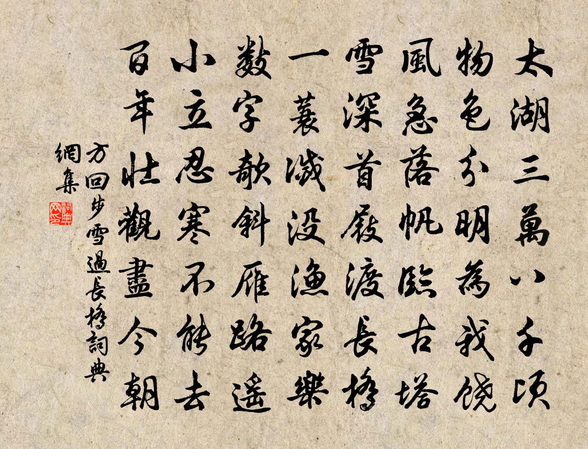 詩詞名句歷史字典書法欣賞書法字典國語詞典說文解字康熙字典古漢語字典標 題 作 者 詩 句 步雪過長橋作者:方回 朝代:宋代步雪過長橋原文太湖三萬八千頃,物色分明為我饒。風急落帆臨古塔,雪深首屐渡長橋。一蓑滅沒漁家樂,數字欹斜雁路遙。小立忍寒不能去,百年壯觀盡今朝。詩詞問答問:步雪過長橋的作者是誰?答:方回問:步雪過長橋寫於哪個朝代?答:宋代方回步雪過長橋書法欣賞步雪過長橋書法作品詩詞推薦代元城吳令暗為答李商隱〔唐代〕背闕歸藩路欲分,水邊風日半西曛。荊王枕上原無夢,莫枉陽台一片雲。偈三首釋守淨〔宋代〕若欲正提綱,直須大地荒。欲來沖雪刃。未免露鋒芒。湖山遣興吳芾〔宋代〕我在小西湖,浩渺仍清曠。大旱未嘗枯,久雨亦不漲。灌溉數千頃,無欠亦無長。中有十里荷,花開密相傍。疑若故諫議大夫鮮于公欲作新堂以傳世譜名曰卓絕李廌〔宋代〕諸孤皆妙稟,況乃承義方。世濟商人美,各是萬夫望。拳拳奉先志,誅茆建崇堂。豈徒輪奐美,卓絕當未央。答李成季賀授直秘閣李復〔宋代〕絕域經秋自乞還,粉闈春得綴星班。詔趨龍幄登文陛,恩拜芝函入道山。曲學豈知新說美,蒼顏難伴後生閒,聞君毗陵天慶觀畫龍自題姑蘇羽士李懷仁醉筆詩呈戴復古〔宋代〕姑蘇道士天酒星,醉筆寫出雙龍形。墨跡從橫奪造化,蜿蜒滿壁令人驚。一龍翻身出雲表,口吞八極滄溟小。手弄句王奇〔宋代〕不拜春官為座主,親逢天子作門生。贈答晁次膺黃庭堅〔宋代〕次膺豪健如霜鶻,空拳誤掛田犬牙。果輸司空城旦作,付與步兵廚人家。野馬橫郊作凝水,牽牛引竹上寒花。無酒寓陳雜詩十首張耒〔宋代〕秦子死南海,旋骨還故墟。辛勤一生事,空得數編書。琅琅巧言語,玉佩聯瓊琚。知者能幾人,憎者頗有餘。書生和張屯田雪中朝拜天慶觀文同〔宋代〕簌簌遙空墮碎瓊,一街寒色曉風清。題輿想入簫台下,似駕飈輪向玉京。謝餘子京驤惠詩陳藻〔宋代〕乃翁催我傳春秋,乃我書成已合眸。有子傳家何可憾,夜深燈火問東周。南樓晚望李彌遜〔宋代〕海角長安望爾賒,日邊雲影更橫斜。身閒夢覺俱成蝶,眼病朝昏只見花。可但陶潛能避俗,不應范蠡便浮家。君恩句吳璋〔宋代〕龍肝雉尾瓜蓴好,玉核金槌棗柰香。只有牛心猶未割,願如逸少得先嘗。和原甫見送韓維〔宋代〕德義良所慕,風霜輕此行。放歌留客醉,高詠見公情。祖帳重開席,郊原少駐旌。還知別後意,寂寞對柴扃。偈頌一百零一首釋慧性〔宋代〕鳥牙絕頂,結制安居。包羅萬有,吞卻十虛。切忌從它覓,迢迢與我疏。唐鐃歌鼓吹曲十二篇。突厥之大古夷狄莫強…鐵山碎第八柳宗元〔唐代〕鐵山碎,大漠舒。二虜勁,連穹廬。背北海,專坤隅。歲來侵邊,或傅於都。天子命元帥,奮其雄圖。破定襄,降石留趙文〔宋代〕江流湯湯,日夜不休。瞿塘灩澦,屹然不流。人心人心,反覆難任。昨日朱絲琴,今日白頭吟。送僧見泉不庵釋智愚〔宋代〕大阿橫按血淋淳,鐵作心肝也皺眉。入得門來翻死款,不庵未必得饒伊。舟中作偈釋楚圓〔宋代〕長江行不盡,帝里到何時。既得涼風便,休將艣棹施。寄暢當李端〔唐代〕麥秀草芊芊,幽人好晝眠。雲霞生嶺上,猿鳥下床前。顏子方敦行,支郎久住禪。中林輕暫別,約略已經年。名句推薦知而好問,然後能才。荀子《荀子·儒效》 蓋鍾子期死,伯牙終身不復鼓琴。班固《漢書·傳·司馬遷傳》 贈君明月滿前溪,直到西湖畔。毛滂《燭影搖紅·送會宗》 過五關,斬六將馮夢龍《喻世明言·卷三十一》 人事有代謝,往來成古今。孟浩然《與諸子登峴山》 有兼聽之明,而無矜奮之容;有兼覆之厚,而無伐德之色。荀子《荀子·正名》 一條藤徑綠,萬點雪峰晴。李白《冬日歸舊山》 無事不登三寶殿馮夢龍《警世通言·卷二十八》 路人借問遙招手,怕得魚驚不應人。胡令能《小兒垂釣》 驪山四顧,阿房一炬,當時奢侈今何處?張養浩《山坡羊·驪山懷古》