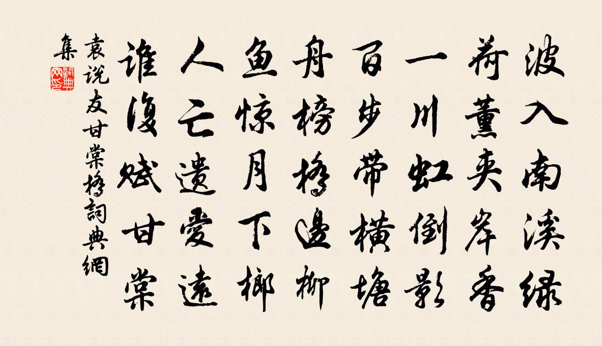 詩詞名句歷史字典書法欣賞書法字典國語詞典說文解字康熙字典古漢語字典標 題 作 者 詩 句 甘棠橋作者:袁說友 朝代:宋代甘棠橋原文波入南溪綠,荷薰夾岸香。一川虹倒影,百步帶橫塘。舟榜橋邊柳,魚驚月下榔。人亡遺愛遠,誰復賦甘棠。詩詞問答問:甘棠橋的作者是誰?答:袁說友問:甘棠橋寫於哪個朝代?答:宋代袁說友甘棠橋書法欣賞甘棠橋書法作品詩詞推薦擬寒山拾得二十首王安石〔宋代〕有一種貧兒,不能自營生。若不作客走,即須隨賊行。復有一種貧,常時腹彭亨。若有亦不畜,若無亦不營。種竹了題愛山亭范成大〔宋代〕灑掃宣華舍此君,煙中月下綠生塵。他年葉葉清風滿,莫忘今年借宅人。塞上行作劉得仁〔唐代〕鄉井從離別,窮邊觸目愁。生人居外地,塞雪下中秋。雁舉之衡翅,河穿入虜流。將軍心莫苦,向此取封侯。和錢處和大資四首曹勛〔宋代〕曹源一滴鑒雲開,便覺星蟾動地來。君去我方專此興,只應空照話誠哉。傷畫松道芬上人(因畫釣台江山而逝)徐凝〔唐代〕百法驅馳百年壽,五勞消瘦五株松。昨來聞道嚴陵死,畫到青山第幾重。安溪李新〔宋代〕岸草綿綿一葉舟,野煙開盡水光浮。寺連野竹微茫見,溪出寒山自在流。愁里詩情隨浩渺,鳥邊春夢入鉤輈。泉嘶宿淮陰作陳羽〔唐代〕秋燈點點淮陰市,楚客聯檣宿淮水。夜深風起魚鱉腥,韓信祠堂明月里。秋夜和韓與玉貢師泰〔元代〕齋居在城西,庭戶頗幽敞。涼風起高樹,落葉時時響。境靜人少來,理悟心自賞。方忻結同盟,慎勿成獨往。故宮使待制侍郎陳公輓詞二首韓元吉〔宋代〕政譽京江口,威名峴首山。折衝章貢外,制勝漢淮間。零落金閨彥,淒涼玉筍班。文章與功業,未老竟長閒。阮郎歸向滈〔宋代〕隔離疏影照橫塘。東風吹暗香。隴頭歸路指蒼茫。江南春興長。扃小院,靜迴廊。有人憑短牆。角聲驚夢月橫窗。寒夜張明府宅宴孟浩然〔唐代〕瑞雪初盈尺,寒宵始半更。列筵邀酒伴,刻燭限詩成。香炭金爐暖,嬌弦玉指清。醉來方欲臥,不覺曉雞鳴。陳無逸張仲實皆授徒城中相望遣悶小詩往問戴表元〔宋代〕間身不用苦咨嗟,隨分風流閱歲華。白日垂簾同賣卜,清流岸幘勝趨衙。飛書漆槧詩無草,夾注高檠眼未花。更喜漁父詞(其二)薛師石〔宋代〕鄰家船上小姑兒。相問如何是別離。雙墜髻,一灣眉。愛看紅鱗比目魚。冬日懷竟陵管氏梅橋四首張耒〔宋代〕堂下幽芳自可人,北風一為屏埃塵。上元簪珥玲瓏玉,卻曳青霞霜女裙。初夏燕堂睡起陸游〔宋代〕歌鳳平生類楚狂,山城遲暮得深藏。洗春雨過清陰合,掠水風生綠藻涼。晨幾硯凹涵墨色,午窗杯麵聚茶香。功名寧宗郊前朝獻景靈宮二十四首真宗〔宋代〕[黃鐘為角]芬枝揚烈,熉珠葉陶。闓珍闡符,展詩舞筲。神哉來下,神哉來知。肅若有承靈心招搖。過鳳山高氏以榴實薦酒張鎡〔宋代〕灣洄綠處昨雞聲,俯檻山宜柳外明。京洛泓塵衣半黑,邯鄲炊黍夢曾驚。榴皮就為翁題好,竹葉能邀我興成。辦此同陳明叔游湖作朱南傑〔宋代〕四月湖邊冷若秋,先賢堂下系扁舟。山頭積翠來新意,波面飄紅憶舊遊。無柰楊花欺倦客,已多荷葉護輕鷗。堤邊九日邀仲屯田為大水所隔以詩見寄次其韻蘇軾〔宋代〕無復龍山對孟嘉,西來河伯意雄夸。霜風可使吹黃帽,(舟人黃帽,土勝水也。樽酒那能泛浪花。漫遣鯉魚傳尺素聞虜人敗於柘皋作口號十首龐謙孺〔宋代〕今年太歲火逢辛,火德炎炎照紫宸。眼看點虜遭天破,未必期廷用一人。名句推薦出必告,反必面。居有常,業無變。李毓秀《弟子規·入則孝》 推手遽止之,濕衣淚滂滂韓愈《聽穎師彈琴》 君不見管鮑貧時交,此道今人棄如土。杜甫《貧交行》 聞道閶門萼綠華,昔年相望抵天涯李商隱《無題二首》 君人者,愛民而安,好士而榮,兩者無一焉而亡。荀子《荀子·君道》 農夫無草萊之事則不比;商賈無市井之事則不比莊子《莊子·雜篇·徐無鬼》 金陵津渡小山樓,一宿行人自可愁。張祜《題金陵渡》 何時倚虛幌,雙照淚痕乾。杜甫《月夜》 暖風熏得遊人醉,直把杭州作汴州。林升《題臨安邸》 奴為出來難,教君恣意憐。李煜《菩薩蠻·花明月暗籠輕霧》