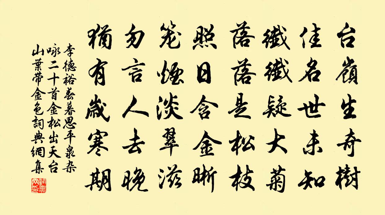 詩詞名句歷史字典書法欣賞書法字典國語詞典說文解字康熙字典古漢語字典標 題 作 者 詩 句 春暮思平泉雜詠二十首。金松(出天台山,葉帶金色)作者:李德裕 朝代:唐代原文台嶺生奇樹,佳名世未知。纖纖疑大菊,落落是松枝。照日含金晰,籠煙淡翠滋。勿言人去晚,猶有歲寒期。詩詞問答問:《春暮思平泉雜詠二十首。金松(出天台山,葉帶金色)》的作者是誰?答:李德裕問:該詩寫於哪個朝代?答:唐代書法欣賞春暮思平泉雜詠二十首。金松(出天台山,葉帶金色)書法作品注釋全唐詩:卷475-82詩詞推薦南堂雜興陸游〔宋代〕奔走當年一念差,歸休別覺是生涯。茆檐喚客家常飯,竹院隨僧自在茶。禪欠遍參寧得髓?詩緣獨學不名家。如今秋興張九成〔宋代〕半夜花驚夢回,花桐葉紛索花索。杖藜花視天宇,雨罷雲收腳。清風拂襟裾,片月墮籬落。嗟我游已倦,悵此久淹奉和四松姚合〔唐代〕四松相對植,蒼翠映中台。擢乾凌空去,移根劚石開。陰陽氣潛煦,造化手親栽。日月滋佳色,煙霄長異材。清音次韻王適上元夜二首蘇轍〔宋代〕燈光欲凝不驚風,月色初睛若發蒙。羈客不眠詩未就,遊人半醉夜方中。荒城熠耀相明滅,野水芙蓉亂白紅。知欲白華佚名〔先秦〕白華菅兮,白茅束兮。之子之遠,俾我獨兮。英英白雲,露彼菅茅。天步艱難,之子不猶。滮池北流,浸彼稻田。病中散步六絕岳珂〔宋代〕池上荷花綠淨時,岸頭楊柳插天垂。倦翁縱步聊行散,早有龜魚聖得知。青玉案曾覿〔宋代〕蒲葵佳節初經雨。正欄檻、薰風度。滿泛香蒲斟醁醑。故人情厚,艷歌嬌舞。總是留賓處。榴花照眼江天暮。醉里宴湖南洪漕樂語口號李曾伯〔宋代〕仗節來從玉筍班,福星甫照舉歡顏。持荷自盍登堯陛,挽粟寧容久漢關。慶集正當萸菊際,交盟喜在芷蘭間。定王憶王孫 秋江送別,集古句辛棄疾〔宋代〕登山臨水送將歸。悲莫悲兮生別離。不用登臨怨落暉。昔人非。惟有年年秋雁飛。木蘭花晏殊〔宋代〕紅絛約束瓊肌穩。拍碎香檀催急袞。壠頭嗚咽水聲繁,葉下間關鶯語近。美人才子傳芳信。明月清風傷別恨。未知鴛鴦湖棹歌 之七十六朱彝尊〔清代〕郎牽百丈上官塘,客倚篷窗晚飯香。黃口近前休賣眼,船頭已入語兒鄉。同張伯子威子季子雉聞子陸及之時子政家弟輔章甫〔宋代〕南城有隱居,靜退我所與。兩窮成邂逅,一笑同出處。翛然五畝園,耕種了寒暑。朱櫻前日栽,茂密已如許。今歲偈頌十二首釋安永〔宋代〕經年不跨雲門路,逐浪隨波恁麽去。而今老大復痴憨,歸來且作村庵主。跨瞎驢,撾毒鼓,百戰場中偃文武。從教懷武陵王廣文趙汝鐩〔宋代〕念子經年別,書嘗寄驛筒。每思談笑隔,或假夢魂通。師範新芹泮,騷情轉蕙風。拿舟訪秦洞,桃雨一川紅。李參政生日二首魏了翁〔宋代〕湖淺霜雁寒,天高老龍蟄。悠悠瀛海間,時運遞訊息。黃鐘一龠回,槁瘁亦敷澤。茹茅趣連征,墐戶同一辟。向來哭?十五章辛棄疾〔宋代〕我痛須自排,汝痴故難忘。何時篆岡竹,重來看眉藏。泊光口楊萬里〔宋代〕風平浪靜不生紋,水面渾如鏡面新。忽有暗流江底出,袞翻水面作車輪。洞仙歌周雲〔宋代〕千崖滴翠。正秋高時侯。橙黃桔綠又重九。有蓬壺仙子、赤鯉來游,風雲會,施展經綸妙手。去年稱壽處,北斗天洞房燕張祜〔唐代〕清曉洞房開,佳人喜燕來。乍疑釵上動,輕似掌中回。暗語臨窗戶,深窺傍鏡台。新妝正含思,莫拂畫梁埃。題雪竹扇姚勉〔宋代〕此君腰不折,玉立有餘清。曉窗擁鼻吟,聽渠落冰聲。名句推薦得寸則王之寸,得尺亦王之尺也。劉向《戰國策·秦三·范睢至秦》 養心莫善於誠。荀子《荀子·不苟》 巧笑倩兮,美目盼兮。佚名《碩人》 貨盡而後知不足,是不知量也,事已,而後知貨之有餘,是不知節也管仲《管子·乘馬》 花片片飛風弄蝶,柳陰陰下水平橋。張先《浣溪沙·樓倚春江百尺高》 不怕慢,只怕站。佚名《增廣賢文·下集》 黃河落天走東海,萬里寫入胸懷間。李白《贈裴十四》 憶君遙在瀟湘月,愁聽清猿夢裡長。王昌齡《送魏二》 有善始者實繁,能克終者蓋寡吳兢《貞觀政要·卷一·論君道》 年年陌上生秋草,日日樓中到夕陽。晏幾道《鷓鴣天·醉拍春衫惜舊香》