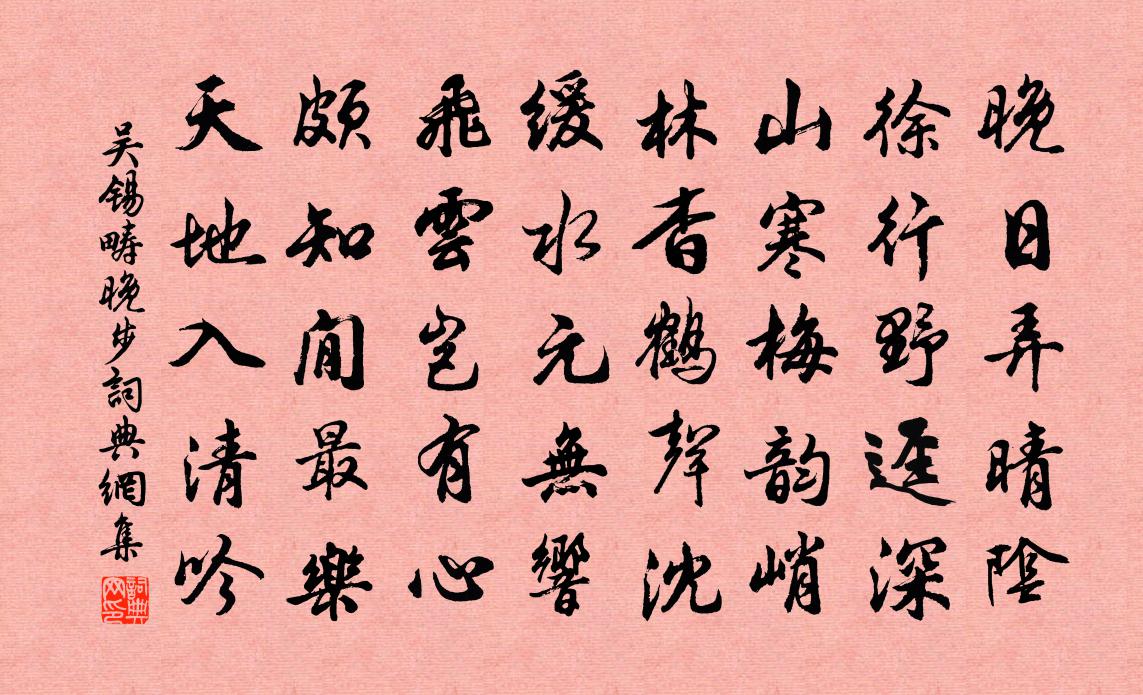 詩詞名句歷史字典書法欣賞書法字典國語詞典說文解字康熙字典古漢語字典標 題 作 者 詩 句 晚步作者:吳錫疇 朝代:宋代晚步原文晚日弄晴陰,徐行野逕深。山寒梅韻峭,林杳鶴聲沈。緩水元無響,飛雲豈有心。頗知閒最樂,天地入清吟。詩詞問答問:晚步的作者是誰?答:吳錫疇問:晚步寫於哪個朝代?答:宋代吳錫疇晚步書法欣賞晚步書法作品詩詞推薦大孤山黃庶〔宋代〕彭蠡百里南國襟,萬頃蒼煙插孤岑。不知天星何時落,春秋不書不可尋。石怪木老鬼所附,茲乃與水同浮沉。鳴鴟答趙景猷曹攄〔魏晉〕守真良難。知德者鮮。歸不悶時。樂在為善。陟彼彌高。流川日遠。無憂不至。敦爾攸踐。白髮賦左思〔魏晉〕星星白髮,生於鬢垂。雖非青蠅,穢我光儀。策名觀國,以此見疵。將拔將鑷,好爵是縻。 白髮將拔,惄然雨晴王安石〔宋代〕晴明山鳥百般催,不待桃花一半開。雨後綠陰空繞舍,總將春色付莓苔。贈李十二白崔成甫〔唐代〕我是瀟湘放逐臣,君辭明主漢江濱。天外常求太白老,金陵捉得酒仙人。賞牡丹劉禹錫〔唐代〕庭前芍藥妖無格,池上芙蕖淨少情。唯有牡丹真國色,花開時節動京城。終南佚名〔先秦〕終南何有?有條有梅。君子至止,錦衣狐裘。顏如渥丹,其君也哉!終南何有?有紀有堂。君子至止,黻衣繡裳。寄李簡夫宮使五首蘇泂〔宋代〕覓得驪龍頷下珠,幾年參請遍江湖。只今同味仍同病,惟有親朋李簡夫。書樓宋庠〔宋代〕{左車右獻}{左車右獻}雕甍傍九衢,藻扃無復蕊函書。徘徊尚有飛軒月,不把孤光照碧疏。在水軍宴贈幕府諸侍御李白〔唐代〕月化五白龍,翻飛凌九天。胡沙驚北海,電掃洛陽川。虜箭雨宮闕,皇輿成播遷。英王受廟略,秉鉞清南邊。雲旗遇風雨作(一作權德輿詩)皇甫曾〔唐代〕草草理夜裝,涉江又登入。望路殊未窮,指期今已促。傳呼戒徒馭,振轡轉林麓。陰雲擁岩端,沾雨當山腹。震雷點絳唇蘇庠〔宋代〕冰勒輕颸,綠痕初漲回塘水。柳洲煙際。白鷺翹沙嘴。箬笠青蓑,未減貂蟬貴。雲濤里。醉眠篷底。不屬人間世。送程建用蘇軾〔宋代〕先生本舌耕,文字浩千頃。空倉付公子,坐待發苕穎。十年困新說,兒女爭捕影。鑿垣種蒿蓬,嘉穀誰復省。空餘雜題四首劉子翬〔宋代〕宿雁猶驚渚,昏鴉已著林。野平雲散亂,江動月浮沈。贈比部蕭郎中十兄杜甫〔唐代〕有美兒童生人傑,兒童由來積德兒童門。漢朝兒童丞相系,梁日帝王孫。蘊藉為郎久,魁梧秉哲尊。詞華傾後輩,岩桂花徐似道〔宋代〕重重簾幕護金猊,小樹花開逼麝臍。寒色十分新疹粟,春心一點暗通犀。香延棋畔仙人斧,影射燈前太乙藜。從此送進士盧棨東歸鄭谷〔唐代〕灞岸草萋萋,離觴我獨攜。流年俱老大,失意又東西。曉楚山雲滿,春吳水樹低。到家梅雨歇,猶有子規啼。日入趙蕃〔宋代〕日出復日入,寢飯但默默。堪哀籠中鳥,欲去飛不得。古意六首艾性夫〔宋代〕佳人買明鏡,意重輕千金。結以雙羅帶,欲照盪子心。盪子渺不歸,鏡影春雲深。金剛隨機無盡頌法界通花分第十九釋印肅〔宋代〕不辭山路遠,要見唐朝面。對面也不識,誰知者方便。名句推薦雪嶺金河獨向東,吳山楚澤意無窮清江《送婆羅門》 除害在於敢斷;得眾在於下人。尉繚《尉繚子·十二陵》 相思相望不相親,天為誰春。納蘭性德《畫堂春·一生一代一雙人》 惟德動天,無遠弗屆。佚名《尚書·虞書·大禹謨》 人攀明月不可得,月行卻與人相隨。李白《把酒問月·故人賈淳令予問之》 何方可化身千億,一樹梅花一放翁。陸游《梅花絕句·其一》 落日照大旗,馬鳴風蕭蕭。杜甫《後出塞五首》 黃埃散漫風蕭索,雲棧縈紆登劍閣。白居易《長恨歌》 淚眼問花花不語,亂紅飛過鞦韆去。歐陽修《蝶戀花·庭院深深深幾許》 過眼年華,動人幽意,相逢幾番春換。王沂孫《法曲獻仙音·聚景亭梅次草窗韻》