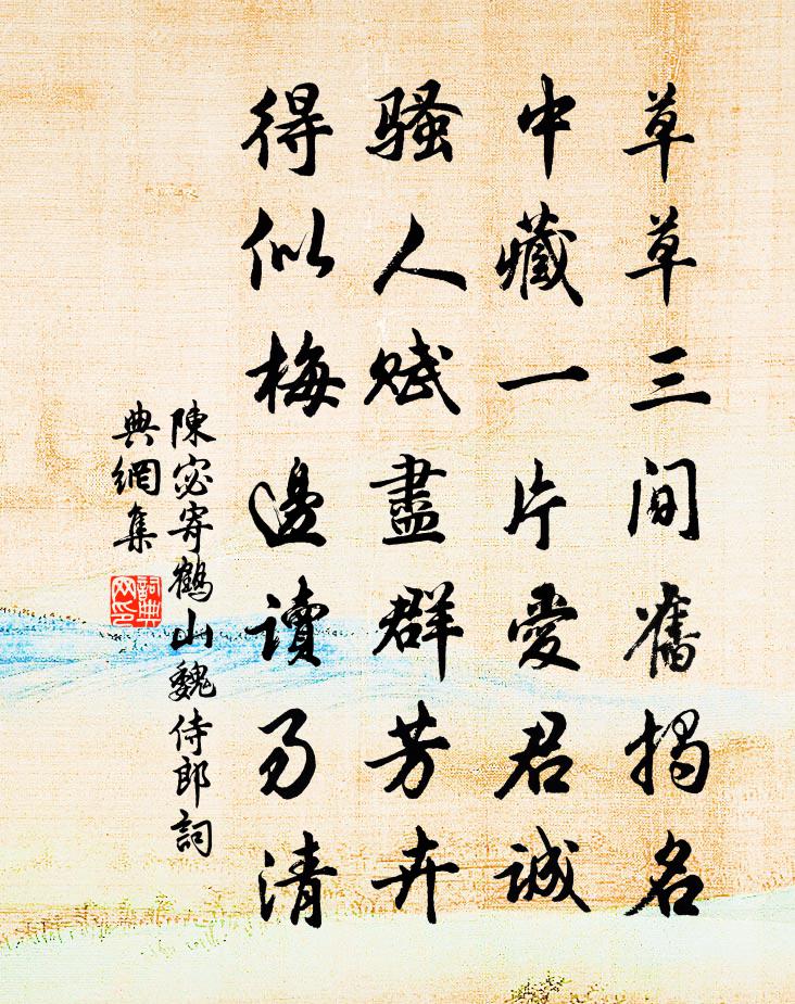 詩詞名句歷史字典書法欣賞書法字典國語詞典說文解字康熙字典古漢語字典標 題 作 者 詩 句 寄鶴山魏侍郎作者:陳宓 朝代:宋代寄鶴山魏侍郎原文草草三間舊揭名,中藏一片愛君誠。騷人賦盡群芳卉,得似梅邊讀易清。詩詞問答問:寄鶴山魏侍郎的作者是誰?答:陳宓問:寄鶴山魏侍郎寫於哪個朝代?答:宋代陳宓寄鶴山魏侍郎書法欣賞寄鶴山魏侍郎書法作品詩詞推薦恭次家大人初抵季海陵官舍之韻孫應符〔宋代〕生於陵者自安陵,可事驅馳較驛程,卻望鄉山千里隔,共看淮月一輪明。官閒足遂吟呼樂,俸薄休形難息聲。最幸香山會王哲〔元代〕白光生,青艷至,紅輝總好。騰玄耀。妙黃深奧。般般彩色,把明珠覆燾。晴空外、來往仙道。封成永號。便受玉青蘿帳女贈穆郎(榕樹)佚名〔唐代〕團圓今夕色光輝,結了同心翠帶垂。此後莫教塵點染,他年長照歲寒姿。微涼余靖〔宋代〕鮫綃蟬翅薄,湘簟水紋流。雨送三金伏,風生一葉秋。檀欒疏影亂,菡萏遠香浮。飛蓋宜清夜,天高掛玉鉤。贈劉神童(六歲及第)鄭谷〔唐代〕習讀在前生,僧談足可明。還家雖解喜,登第未知榮。時果曾沾賜,春闈不掛情。燈前猶惡睡,寤語讀書聲。蓬戶曾協〔宋代〕野客何為戶,編非茅即蓬。松堅難闔辟,竹瘦謾牢籠。疏密殊無準,粗纖任不同。我常知善閉,寧向此矜功。明道元年章獻明肅皇太后朝會十五首佚名〔宋代〕長光居尊,盛容有燈。文王事親,萬國歸美。朝會之則,邦家之紀。受福於天,克昭隆禮。江神子 吳門席上,羅生求賦張翥〔元代〕闔閭城外綠楊枝。一絲絲。比吟髭。比似吟髭,不似少年時。積欲同攜尊酒去,青翰舫,縷金卮。故人相見減風姿沈仲一送菊自言封殖之勞欲得詩為報為賦三絕陳傅良〔宋代〕愁乾手自搭連筒,苦雨丁丁杙小篷。乞得花開急催客,明朝恐已著霜紅。和師文孫應時〔宋代〕筆端陶謝不枝梧,朝食千龍信手屠。天與詩人清氣骨,家傳前輩學工夫。從渠擾擾一丘貉,看我昂昂千里駒。已喜一翦梅 壽俞子中紫之凌雲翰〔元代〕蒼顏白髮稱烏紗。瘦似黃花。清似梅花。窗吟山月樂無涯。知是儒家。知是仙家。紫芝服食勝胡麻。不愛繁華。卻天水牛蘇軾〔宋代〕兩角徒自長,空飛不服箱。為牛竟何事,利吻穴枯桑。論語子貢問君子章陳普〔宋代〕出話誰能敢不仁,未行未足信於人。欲求內外皆無間,兌口終須後艮身。歲杪送同官趨朝周南〔宋代〕異縣飄零興已闌,更來樓上說加餐。不知壯日消磨已,也似中年賦別難。酒盡沙頭悲夜水,書來日腳是春殘。人生句劉旦〔宋代〕紫宸拜賜鳴雙笏,皂蓋頒春佩左符。膺門昔忝登龍客,董墓今悲下馬人。感惻復何言。西江月越娘〔宋代〕一自東君去後,幾多恩愛暌離。頻凝淚眼望鄉畿。客路迢迢千里。顧我風情不薄,與君驛邸相隨。參軍雖死不須悲頌二首釋道行〔宋代〕我不會兮不如你,堪笑千花知碓觜。善才謾說百城游,何曾踏著自家底。送愚卿兼簡魯卿卓卿趙蕃〔宋代〕逢人盡道為官去,為訪名山只有君。屨底沖殘大仰雪,筆頭帶得祝融雲。區區自誓王逸少,歷歷臥遊宗少文。歸見送張無夢歸天台姜嶼〔宋代〕鯤鵬運海涯,豈復顧泥沙。龍虎常為畜,乾坤不定家。玉泉生白石,紫府種黃芽。此境人難到,歸程自有槎。和江平叔游無為山詩韻程公許〔宋代〕夙嗜一邱壑,誓言苦難踐。夢踏西山雲,陟降原復巘。世紛不可耐,道根日以淺。永愧龕中定,三歡涕如霰。君從名句推薦德之不修,學之不講,聞義不能徙,不善不能改,是吾憂也。孔子弟子《論語·述而篇》 芳菲歇去何須恨,夏木陰陰正可人。秦觀《三月晦日偶題》 覆巢毀卵,而鳳皇不翔;刳胎焚夭,而麒麟不至。劉向《戰國策·趙四·秦攻魏取寧邑》 無人解,樹轉午陰涼舒頔《小重山·端午》 缺月掛疏桐,漏斷人初靜。蘇軾《卜運算元·黃州定慧院寓居作》 有三秋桂子,十里荷花。柳永《望海潮·東南形勝》 出犯繁花露,歸穿弱柳風溫庭筠《清明日》 城小賊不屠,人貧傷可憐元結《賊退示官吏》 芙蓉金菊斗馨香。天氣欲重陽。晏殊《訴衷情·芙蓉金菊斗馨香》 為人若此,庶乎近焉。朱柏廬《朱子家訓·全文》