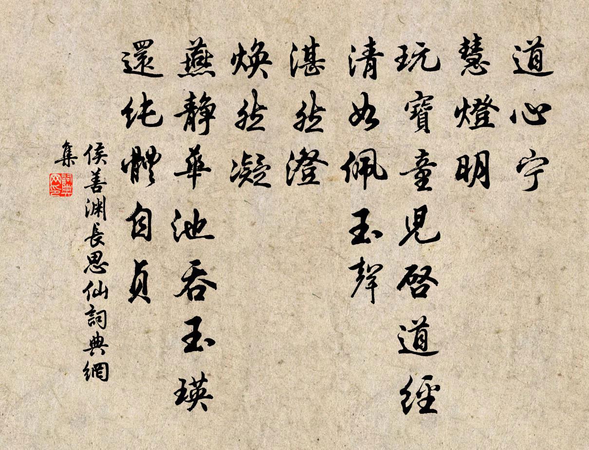 詩詞名句歷史字典書法欣賞書法字典國語詞典說文解字康熙字典古漢語字典標 題 作 者 詩 句 長思仙作者:侯善淵 朝代:元代長思仙原文道心寧。慧燈明。玩寶童兒啟道經。清如佩玉聲。湛然澄。煥然凝。燕靜華池吞玉瑛。還純體自貞。詩詞問答問:長思仙的作者是誰?答:侯善淵問:長思仙寫於哪個朝代?答:元代問:長思仙是什麼體裁?答:詞侯善淵長思仙書法欣賞長思仙書法作品詩詞推薦送王少府歸杭州韓翃〔唐代〕歸舟一路轉青蘋,更欲隨潮向富春。吳郡陸機稱地主,錢塘蘇小是鄉親。葛花滿把能消酒,梔子同心好贈人。早晚東村陸游〔宋代〕塘路東頭烏桕林,偶攜藤杖得幽尋。桃源阡陌自來往,輞口雲山無古今。遠浦過帆供極目,暮天橫雁入微吟。歸來錢塘懷古董師謙〔宋代〕衣帶一條水,靴尖三百州。市朝陳跡在,圖籍別人收。南渡衣冠盡,西湖歌舞休。久知事當爾,曾記五更頭。故樞密簽書贈正議大夫王彥霖輓詞二首蘇轍〔宋代〕試吏有能名,升台擅直聲。雄飛極九載,修路止三城。壯志方凌厲,遺書忽嘆驚。老人殊可念,白首泣新塋。郡齋書事四錫〔宋代〕江天短景莫相催,三度逢花折早梅。仙棹遠歸思李郭,廬山高會憶宗雷。林端忽見孤雲出,池上欣聞好客來。昨夜上制置侍郎度正〔宋代〕堂堂漢使到天涯,覆芘西南億萬家。禮樂化行真有道,強梁氣懾自無譁。坐觀狼狽奔牛角,敢復猖狂犯虎牙。措置吊李肯齊李思衍〔宋代〕天地由來有廢興,義無兩大一身輕。封疆社稷若不死,婦女鬚眉安用生。紐解三網重接續,灰寒萬劫獨光明。便當石壁泉熊禾〔宋代〕一滴流漿石骨穿,於今一掬掃炎氛。鶴仙業已成陳跡,瀑布聲中隱劍痕。懷舊第一百九文天祥〔宋代〕中夜懷友朋,百年見存沒。風吹蒼江樹,寒月照白骨。記牡丹事二首劉克莊〔宋代〕暴骸獨柳冤誰雪,藁葬青山過者悲。甘露殿中空誦賦,沉香亭畔更無詩。山居詩釋延壽〔宋代〕豪貴從他縱勝游,多歡終是後多愁。茅茨舍宇偏安穩,糞埽衣裳最自由。數片雲飛書案上,一條泉路臥床頭。分明水調歌頭向子諲〔宋代〕閏餘有何好,一年兩中秋。補天修月人去,千古想風流。少日南昌幕下,更得洪徐蘇李,快意作清游。送日眺西嶺謝宣賜金襴釋慧開〔宋代〕不是雞足流傳,亦非黃梅分付。九得天上降來,千載臣僧一過。中興佛祖宗風,群魔悉皆驚怖。祝延聖壽無疆,志暮秋言懷魏徵〔唐代〕首夏別京輔,杪秋滯三河。沉沉蓬萊閣,日夕鄉思多。霜剪涼階蕙,風捎幽渚荷。歲芳坐淪歇,感此式微歌。納火禮祀大辰十二首佚名〔宋代〕庶功備矣,休德昭明。天地醣和,在鬯斯清。玉瓚以酌,瑤觴載盈。周流常羊,來燕來寧。太皇太后輓詩王炎〔宋代〕弧矢能天授,詩書德日新。中興扶漢祚,內禪贊堯仁。鏤玉三朝慶,塗椒四世親。乘雲今不返,垂白泣遺民。題和伯僑吳松雪霽圖三首羅椅〔宋代〕天隨漫解理艇,不慣霜後霜前。幸自竹篙閒著,拋來借與鄰船。贈臧文仲四首陳造〔宋代〕始吾泛其觀,中吾固其守。拳拳寶所重,世或輕敝帚。廄馬我所師,家雞誰得有。此心如此用,煩君訂是否。游長安諸寺聯句崇義坊招福院贈諸上人聯段成式〔唐代〕翻了西天偈,燒余梵宇香。撚眉愁俗客,支頰背殘陽。——段成式洲號惟思沃,山名只記匡。辨中摧世智,定里破題趙孟莊楊巨源〔唐代〕管鮑化為塵,交友存如線。升堂俱自媚,得路難相見。懿君敦三益,頹俗期一變。心同襲芝蘭,氣合回霜霰。石門名句推薦雁足無書古塞幽。一程菸草一程愁。史達祖《鷓鴣天·衛縣道中有懷其人》 見碧水丹山,黃蘆苦竹。宋江《滿江紅·喜遇重陽》 琅琅新雨洗湖天,小景六橋邊。張可久《風入松·九日》 至長反短,至短反長,天之道也。呂不韋《呂氏春秋·論·似順論》 夫兵權者,是三軍之司命,主將之威勢。諸葛亮《將苑·卷一·兵權》 扁舟去作江南客,旅雁孤雲。朱敦儒《採桑子·彭浪磯》 命隨年欲盡,身與世俱忘;文天祥《除夜》 蓬門未識綺羅香,擬托良媒益自傷。秦韜玉《貧女》 李白如今已仙去,月在青天幾圓缺?唐寅《把酒對月歌》 平生塞北江南,歸來華發蒼顏。辛棄疾《清平樂·獨宿博山王氏庵》