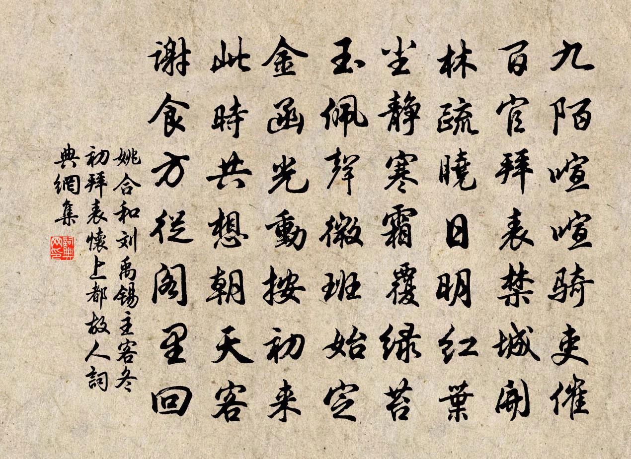 詩詞名句歷史字典書法欣賞書法字典國語詞典說文解字康熙字典古漢語字典標 題 作 者 詩 句 和劉禹錫主客冬初拜表懷上都故人作者:姚合 朝代:唐代原文九陌喧喧騎吏催,百官拜表禁城開。林疏曉日明紅葉,塵靜寒霜覆綠苔。玉佩聲微班始定,金函光動按初來。此時共想朝天客,謝食方從閣里回。詩詞問答問:《和劉禹錫主客冬初拜表懷上都故人》的作者是誰?答:姚合問:該詩寫於哪個朝代?答:唐代問:該詩是什麼體裁?答:七律書法欣賞和劉禹錫主客冬初拜表懷上都故人書法作品注釋全唐詩:卷501-16詩詞推薦早春李中〔唐代〕一種和風至,千花未放妍。草心並柳眼,長是被恩先。吳門別主人(一作吳門月夜與曹太尉話別)李頻〔唐代〕早晚更看吳苑月,小齋長憶落西窗。不知明夜誰家見,應照離人隔楚江。翔泳堂即景釋行海〔宋代〕一池荷蓋綠陰涼,數朵紅蕖浥露香。最是畫橋林薄外,滿湖煙景淡斜陽。夏日登望海亭王珪〔唐代〕藻棟臨流啟,涼飈盪暑回。清如游玉宇,快若在蘭台。海葉吟中下,番航望次來。披襟殊未已,雲外月弦開。御賜真贊師演成四偈釋宗杲〔宋代〕圓覺空明,胡來漢現。一點靈光,萬化千變。期頤堂龔明之〔宋代〕百事如今與世違,十花一木謾兒嬉。莫欺兀兀痴頑老,曾睹昇平元佐時。和陶神釋蘇軾〔宋代〕二子酒本無我,酒其初因物酒著。豈惟酒老變衰,念念不如故。知君非金石,安得長託附。莫從老君言,亦莫用佛清平樂李彌遜〔宋代〕長紅小白。何處尋梅格。日日南山雲滿額。暗老一分春色。廣平賦罷瑤香。細□花蕊商量。留得筆端雨露,後來收太上皇帝靈駕發引輓歌詞六首范成大〔宋代〕文德堯新廟,威靈舊禹山。海門賓羽衛,地軸啟雲關。無路攀仙駕,當年拱聖顏。小臣衰疾淚,空望帝鄉潸。春遊林季謙〔宋代〕寶馬香車正踏青,豈知已自過清明。燕雛告訴花都盡,鳩婦丁寧雨速晴。詠史上主父偃陳普〔宋代〕當年齊趙倚黃昏,曾嘆蒙恬滅子孫。一日上天沾五鼎,依角蜚粟度龍門。詩一首黃瀠〔宋代〕半濃半淡四山景,快雨快晴三月雷。橋影不隨流水去,漁歌偏帶夕陽來。朝中措·清明時節張炎〔宋代〕清明時節雨聲嘩。潮擁渡頭沙。翻被梨花冷看,人生苦戀天涯。燕簾鶯戶,雲窗霧閣,酒醒啼鴉。折得一枝楊柳,柳梢青(送別陳廉州於一片瀟湘)郭應祥〔宋代〕合浦名邦。風流太守,紫綬金章。暫駐旌麾,來臨祖席,一片瀟湘。且須緩舉離觴。細看取、眉間點黃。未到還珠予往來秦熙汧隴間不啻十數年時聞下里之歌遠李復〔宋代〕垂白東西幾田父,林間偶坐忘巾履。共說乾餱付遠人,六月長丁猶築戍。上鄧憲生辰楊簡〔宋代〕維彼岷源,維深用長。是為大江,潤澤南方。題黃陂夫人祠劉商〔唐代〕蒼山雲雨逐明神,唯有香名萬歲春。東風三月黃陂水,只見桃花不見人。再次贈張學錄韻十詩陳造〔宋代〕冷官冷如冰,餬口僅廩稍。藜藿得好客,欠餘不擬較。句釋清晤〔宋代〕鳥歸花影動,魚觸浪痕圓。劉阮洞中遇仙子(一作偶仙子)曹唐〔唐代〕天和樹色靄蒼蒼,霞重嵐深路渺茫。雲實滿山無鳥雀,水聲沿澗有笙簧。碧沙洞裡乾坤別,紅樹枝前日月長。願得名句推薦水漲魚天拍柳橋。雲鳩拖雨過江皋。周邦彥《浣溪沙·水漲魚天拍柳橋》 舊時王謝、堂前燕子,飛向誰家。吳激《人月圓·南朝千古傷心事》 國大而政小者,國從其政;國小而政大者,國益大。管仲《管子·霸言》 治生乎君子,亂生乎小人。荀子《荀子·王制》 料黛眉重鎖隋堤,芳心還動梁苑。盧祖皋《宴清都·初春》 勿言草卉賤,幸宅天池中沈約《詠新荷應詔》 安能摧眉折腰事權貴,使我不得開心顏!李白《夢遊天姥吟留別 / 夢遊天姥山別東魯諸公》 自是荷花開較晚,孤負東風。幼卿《浪淘沙·極目楚天空》 朝看水東流,暮看日西墜。錢福《明日歌》 江流石不轉,遺恨失吞吳。杜甫《八陣圖》