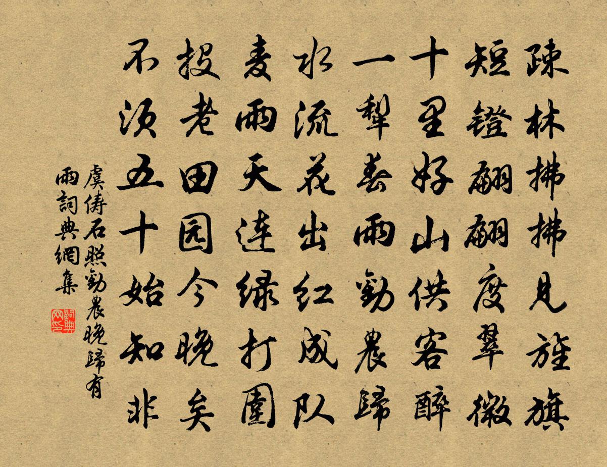 詩詞名句歷史字典書法欣賞書法字典國語詞典說文解字康熙字典古漢語字典標 題 作 者 詩 句 石照勸農晚歸有雨作者:虞儔 朝代:宋代石照勸農晚歸有雨原文疎林拂拂見旌旗,短鐙翩翩度翠微。十里好山供客醉,一犁春雨勸農歸。水流花出紅成隊,麥雨天連綠打圍。投老田園今晚矣,不須五十始知非。詩詞問答問:石照勸農晚歸有雨的作者是誰?答:虞儔問:石照勸農晚歸有雨寫於哪個朝代?答:宋代虞儔石照勸農晚歸有雨書法欣賞石照勸農晚歸有雨書法作品詩詞推薦次韻十絕見客樓鑰〔宋代〕客至何妨送與迎,門前羅爵亦人情。可憐寒士猶相望,時有飢來柳絮輕。秋夕懷趙師秀徐璣〔宋代〕冷落生愁思,衰懷得句稀。如何秋夜雨,不念故人歸。蛩響砌尤靜,雲疏月尚微。惟憐籬下菊,漸漸可相依。題醉翁圖釋文珦〔宋代〕所畫者誰子,將非高陽兒。滿腹常貯酒,何異於鴟夷。陶陶以自樂,禮法不可縻。釀酒用老瓦,漉酒脫接?。寧復偈頌一百五十首釋心月〔宋代〕竺土大仙心,東西密相付。謹白參玄人,光陰莫虛度。蝶戀花(和張文伯海棠)王之道〔宋代〕碧霧暗消香篆半。花影穿簾,厭浥蒼苔院。鸂鶒一雙塘水暖。浮沈時近垂楊岸。雨過不知春事晚。但怪朱唇,得酒杏蘇軾〔宋代〕開花送余寒,結子及新火。關中幸無梅,汝強充鼎和。四伯父生朝集老杜句二十韻項安世〔宋代〕三月三日天氣新,著處繁華矜是日。明日蕭條盡醉醒,碧窗宿霧蒙蒙濕。南極老人自有星,掛君高堂之素壁。仙人洛陽人嘲跋異佚名〔宋代〕赫赫洛下,唯說異畫。張氏出頭,跋異無價。宋宗儒真贊黃庭堅〔宋代〕宋子勃窣,心有古鏡。朝四暮三,為笑不競。於一捻一,猶著禪病。探丸起死,味藥知性。憂患不入乎杯中,抱胡聞蜀盜已平獻馘廟社喜而有述陸游〔宋代〕北伐西征盡聖謨,天聲萬里慰來蘇。橫戈已見吞封豕,徒手何難取短狐。學士誰陳平蔡雅?將軍方上取燕圖。老生寄孫山人儲光羲〔唐代〕新林二月孤舟還,水滿清江花滿山。借問故園隱君子,時時來往住人間。第一百四十卷過鶯斗湖三首楊萬里〔宋代〕畫舫如山水上奔,小船似鴨避河濱。紅旗青蓋鳴鉦處,都是迎來送往人。夜歸白居易〔唐代〕逐勝移朝宴,留歡放晚衙。賓寮多謝客,起從半吳娃。到處銷春景,歸時及月華。城陰一道直,燭焰兩行斜。東吹臨川節中寄季和弟李壁〔宋代〕敕使傳宣泛食時,去年今日侍龍墀。江城牢落追前事,一寸丹心只自知。和邢惇夫秋懷十首黃庭堅〔宋代〕慶州名父子,忠勇橫八區。許身如稷契,初不學孫吳。荷戈去防秋,面皺鬢欲疏。雖折千里沖,豈若秉事樞。詩一首石待問〔宋代〕平生無女只生兒,三子登科一子隨。家在白雲青嶂里,不求閒散待何時。餛飩釋道濟〔宋代〕包羅萬象,性氣粗豪。清淨為根,禮恭叉手。通身上縫隙無餘,鑊湯里倒番觔斗。把得定橫吞豎吞,把不定東走西思佳客陳允平〔宋代〕錦幄沈沈寶篆殘。惜春舞語憑闌乾。庭前芳草空惆悵,簾外飛花自往還。金屋靜,玉簫閒。一尊芳酒駐紅顏。東風麥秀歌先秦無名〔先秦〕麥秀漸漸兮禾黍油油。彼狡童兮不與我好兮。次張守韻四首劉子翬〔宋代〕瓦白霜封縞,波清月漾金。柝沈秋壘靜,人語夜堂深。故國歸何日,寒衾事滿心。庭松憐手植,擢乾已彌尋。名句推薦老子有見於詘,無見於信。荀子《荀子·天論》 撩亂邊愁聽不盡,高高秋月照長城。王昌齡《從軍行七首》 蒲生我池中,其葉何離離。甄宓《塘上行》 八年十二月,五日雪紛紛。白居易《村居苦寒》 雨雪自飛千嶂外,榆林只隔數峰西。朱彝尊《出居庸關》 野棠花落,又匆匆過了,清明時節。辛棄疾《念奴嬌·書東流村壁》 掛席幾千里,名山都未逢。孟浩然《晚泊潯陽望廬山》 圖未就之功,不如保已成之業洪應明《菜根譚·概論》 弗愛弗利,親子叛父。劉安及其門客《淮南子·繆稱訓》 昨夜斗回北,今朝歲起東。孟浩然《田家元日》