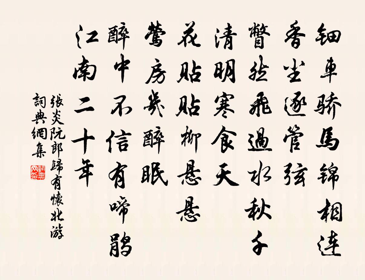 張炎經歷國亡家破的慘變後,誓做大宋遺民,不為元朝作事。他一生都在追求那種隱居山中隱士生活。一生中為躲避元朝廷的徵召到處流浪。僅有一次,約在元世祖至元二十七年(1290 年)九月,張炎為元朝廷逼召,與好友曾心傳(遇)、沈堯道(欽)一起由杭州到大都,為元宮延繕寫金字藏經,次年春天完成即返杭,此次入京約有半年的光景。這就是詞題中所說的“北游”。此次北游,給詞人留下極為深刻的印象,以致在他離開京都後很長時間 ,還是念念不忘。這首《阮郎歸》就是他在離京二十年之後寫的追懷他那次京都生活的小詞。