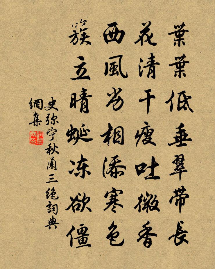 詩詞名句歷史字典書法欣賞書法字典國語詞典說文解字康熙字典古漢語字典標 題 作 者 詩 句 秋蘭三絕作者:史彌寧 朝代:宋代秋蘭三絕原文葉葉低垂翠帶長,花清乾瘦吐微香。西風劣相添寒色,簇立晴蜓凍欲僵。詩詞問答問:秋蘭三絕的作者是誰?答:史彌寧問:秋蘭三絕寫於哪個朝代?答:宋代史彌寧秋蘭三絕書法欣賞秋蘭三絕書法作品詩詞推薦玉連環影·何處納蘭性德〔清代〕何處?幾葉蕭蕭雨。濕盡檐花,花底無人語。掩屏山,玉爐寒。誰見兩眉愁聚倚闌乾。苕溪雜興四首蘇泂〔宋代〕斜風細雨轉船頭,夜半波平帶月流。行到下菰城畔望,水晶宮闕是湖州。送演上人之撫州覲使君叔皎然〔唐代〕臨川內史憐諸謝,爾在生緣比惠宗。遠別應將秦本去,幽尋定有楚僧逢。停船夜坐親孤月,把錫秋行入亂峰。便道和虞永康梅花十絕句魏了翁〔宋代〕不隨妖艷競花期,葉落惟存老樹枝。林下水邊時一見,相逢頗恨幾年遲。題沈鳥盆戶股李氏子〔宋代〕洪州沈鳥盆,塑佛拾三尊。一朝飯凍死,衣不庇其臀。浣溪沙(和張文伯木犀)王之道〔宋代〕曉日暉暉玉露光。枝頭一樣斗宮妝。可憐嬌額半塗黃。衣與酴醿新借色,肌同薝蔔更薰香。風流荀令雅相當。生查子(同前感舊)晁補之〔宋代〕宮裡妒娥眉,十載辭君去。翠袖怯天寒,修竹無人處。今日近君家,望極香車騖。一水是紅牆,有恨無由語。和陶勸農韻勉吾鄉之學者吳芾〔宋代〕縱得美官,人亦見鄙。若博群書,更堅素履。雖處常流,亦超塵軌。一旦進為,必兼眾美。衲衣示眾釋印肅〔宋代〕一個閒身包萬有,不能自把著針縫。眾緣聚衲須微細,妙相莊嚴一大通。下下針鋒無不實,條條線貫不空空。連天宿長蘆寺方丈范成大〔宋代〕塔廟新浮水,汀洲舊布金。聊恁一葦力,與障萬波侵。帆影窺門近,鐘聲出院深。夜闌雷破夢,欹枕聽潮音。彭衙行(郃陽縣西北有彭衙城)杜甫〔唐代〕憶昔避賊初,北走經險艱。夜深彭衙道,月照白水山。盡室久徒步,逢人多厚顏。參差谷鳥吟,不見遊子還。痴女覽古四十二首 其十六楊維楨〔元代〕武丁夢良弼,審象極冥搜。光武思故人,物色在羊裘。彭城有處士,君恩賁林丘。股肱不為用,顏色徒相求。大將軍宴會被命作詩陸雲〔魏晉〕皇皇帝祜。誕隆駿命。四祖正家。天祿保定。叡哲惟晉。世有明聖。如彼日月。萬景攸正。次韻子瞻太白山下早行題崇壽院蘇轍〔宋代〕山下晨光晚,林梢露滴升。峰頭斜見月,野市早明燈。樹暗猶藏鵲,堂開已饌僧。據鞍應夢我,聯騎昔嘗曾。和謝方智善王洋〔宋代〕瀟湘十畝弄柔猗,獨染啼斑事已奇。但愛波聲鳴犖确,不須蠅翅避琉璃。莫疑山路崎嶇險,爭脫繩橋性命危。慚愧蝶戀花王安中〔宋代〕飛雪映山茶。巧剪明霞成片片。欲笑還嚬,金蕊依稀見。拾翠人寒妝易淺。濃香別注唇膏點。竹雀喧喧煙岫遠。晚訴衷情高觀國〔宋代〕西樓楊柳未勝煙。寒峭落梅天。東風渡頭波晚,一棹木蘭船。花態度,酒因緣。只春憐。屏開山翠,雨怯雲嬌,盡西江月(一名白蘋香,一名步虛詞)歐陽炯〔唐代〕月映長江秋水,分明冷浸星河。淺沙汀上白雲多,雪散幾叢蘆葦。扁舟倒影寒潭,煙光遠罩輕波。笛聲何處響漁歌緣識宋太宗〔宋代〕每逢清夜坐更深,白日忙忙各是情。南北東西誰定準,無窮天地始知名。四月十五游僧寺李昴英〔宋代〕今日快逢僧結夏,不刀乘興扣禪扉。非垂遠瀑溪聲急,風卷痴雲雨腳稀。囊錦詩成僧借看,紋楸棋落鳥驚飛。此來名句推薦芳草平沙,斜陽遠樹,無情桃葉江頭渡。張翥《踏莎行·芳草平沙》 反者道之動;弱者道之用。老子《老子·德經·第四十章》 二人同心,其利斷金。同心之言,其臭如蘭。佚名《易傳·繫辭傳上·第八章》 翠華想像空山里,玉殿虛無野寺中。杜甫《詠懷古蹟五首·其四》 綠衣監使守宮門,一閉上陽多少春。白居易《上陽白髮人》 為容不在貌,獨抱孤潔。張炎《疏影·梅影》 南北山頭多墓田,清明祭掃各紛然。高翥《清明日對酒》 參軍春思亂如雲,白髮題詩愁送春歐陽修《春日西湖寄謝法曹歌》 馬上離魂衣上淚,各自個、供憔悴程垓《酷相思·月掛霜林寒欲墜》 有桃花紅,李花白,菜花黃。秦觀《行香子·樹繞村莊》