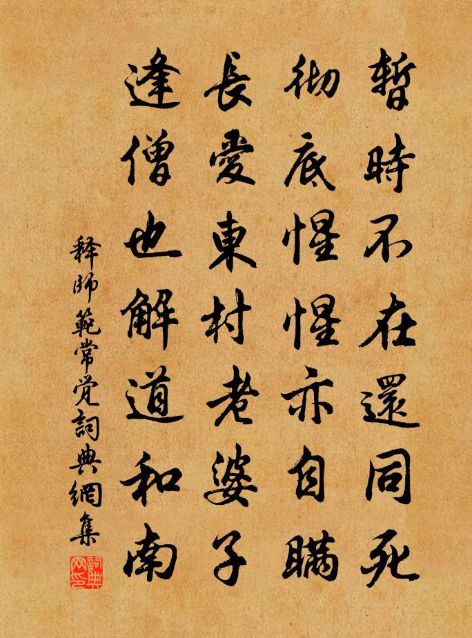 詩詞名句歷史字典書法欣賞書法字典國語詞典說文解字康熙字典古漢語字典標 題 作 者 詩 句 常覺作者:釋師範 朝代:宋代常覺原文暫時不在還同死,徹底惺惺亦自瞞。長愛東村老婆子,逢僧也解道和南。詩詞問答問:常覺的作者是誰?答:釋師範問:常覺寫於哪個朝代?答:宋代釋師範常覺書法欣賞常覺書法作品詩詞推薦船子和尚贊釋智遇〔宋代〕煙水寒,扁舟小,華亭江上相尋討。負命劈口一橈,點頭處狼藉不少。父子怯相酬,誰道翻身早。出黃蘆,入紅蓼春晚即事趙師秀〔宋代〕一身來作吏,白日算徒勞。塵土侵衣重,年光如鬢牢。春深禽語改,溪落岸沙高。柳下垂釣者,吾今愧爾曹。題幽棲觀許堅〔唐代〕仙翁上升去,丹井寄晴壑。山色接天台,湖光照寥廓。玉洞絕無人,才檜猶棲鶴。我欲掣青蛇,他時沖碧落。以長歌意無極好為老夫聽為韻奉別沔鄂親友姜夔〔宋代〕中郎逝千霜,曲高復誰為。龐翁趣無弦,鄭伯功斬鼻。春風桃花溪,寒淥繞蒼翠。何當從兩君,放浪討幽事。聲聲慢(送王聖與次韻)周密〔宋代〕瓊壺歌月,白髮簪花,十年一夢揚州。恨入琵琶,小憐重見灣頭。尊前漫題金縷,奈芳情、已逐東流。還送遠,甚求友孟郊〔唐代〕北風臨大海,堅冰臨河面。下有 * 瀾,對之無由見。求友須在良,得良終相善。求友若非良,非良中道變。欲知山家暮春陸游〔宋代〕遶屋清陰合,緣堤綠草纖。起蠶初放食,新麥已磨鐮。苦筍先調醬,青梅小蘸鹽。佳時幸無事,酒盡更須添。約春文同〔宋代〕雲歲相違恨已賒,今年相遇喜無涯。紅情綠意知多少,盡入涇川萬樹花。唐律寄呈父鳳山提舉十首汪元量〔宋代〕錦帆浩蕩濕龍鸞,樂指三千粉淚寒。萬里遠行看日近,一人不殺見天寬。玉關屢沐軍羅拜,金殿時蒙上問安。宴罷聽彈湘妃怨白居易〔唐代〕玉軫朱弦瑟瑟徽,吳娃徵調奏湘妃。分明曲里愁雲雨,似道蕭蕭郎不歸。章少隱嘗有逸句雲片片梅花隨雨脫渾疑春雪墮趙蕃〔宋代〕片片梅花脫雨輕,半飛欲墜更多情。渾疑春雪林梢墮,輸與詩翁照眼明。春蔭方岳〔宋代〕玲瓏碧樹巧臨池,影在窗前作麽移。水墨畫圖春淡淡,鶯花庭院日遲遲。不妨明月重相憶,怎許浮雲浪得知。一片春日野行溫庭筠〔唐代〕騎馬踏煙莎,青春奈怨何。蝶翎朝粉盡,鴉背夕陽多。柳艷欺芳帶,山愁縈翠蛾。別情無處說,方寸是星河。相見歡(見月聞笛八月五夜)李處全〔宋代〕新涼襟袂冷然。乍晴天。風送誰家羌管、月便娟。雲散盡,秋空碧,玉鉤懸。洗耳時聽三弄、等團圓。寄同年盧員外黃滔〔唐代〕聽盡鶯聲出雍州,秦吳煙月十經秋。龍門在地從人上,郎省連天須鶴游。休戀一台惟妙絕,已經三字入精求。當年熙寧以後祀高禖六首佚名〔宋代〕容台講禮,禖宮立祠。司分屈後,帶刊陳閏。嘉祥萃止,靈馭來思。皇支蕃衍,永固邦基。獄中寄子由二首·其一蘇軾〔宋代〕聖主如天萬物春,小臣愚暗自亡身。百年未滿先償債,十口無歸更累人。是處青山可埋骨,他時夜雨獨傷神。與君飯罷登山楊萬里〔宋代〕樹遠通鸚響,花晴帶雨痕。登山偶回首,隔水見前村。澹往孤無伴,清歸笑不言。還家更遲著,松菊未應存。巫山一段雲 勸世尹志平〔元代〕道顯清虛妙,釋明智慧深。仲尼仁義古通今。三聖一般心。不認忘名默悟。只解分門別戶。一朝合眼見前程。悔恨送彈琴李長史往洪州錢起〔唐代〕抱琴為傲吏,孤棹復南行。幾度秋江水,皆添白雪聲。佳期來客夢,幽思緩王程。佐牧無勞問,心和政自平。名句推薦月落沙平江似練。望盡蘆花無雁。張炎《清平樂·候蛩淒斷》 新樣靚妝,艷溢香融,羞殺蕊珠宮女。趙佶《燕山亭·北行見杏花》 家貧思良妻,國亂思良相。司馬光《資治通鑑·周紀·周紀一》 背若泰山,翼若垂天之雲。莊周《逍遙遊(節選)》 重陽初啟節,無射正飛灰。陰行先《和張燕公湘中九日登高》 怒髮衝冠,憑欄處、瀟瀟雨歇。岳飛《滿江紅·寫懷》 明月松間照,清泉石上流。王維《山居秋暝》 涼風起天末,君子意如何。杜甫《天末懷李白》 天長地久有時盡,此恨綿綿無絕期。白居易《長恨歌》 普天皆滅焰,匝地盡藏煙。沈佺期《寒食》