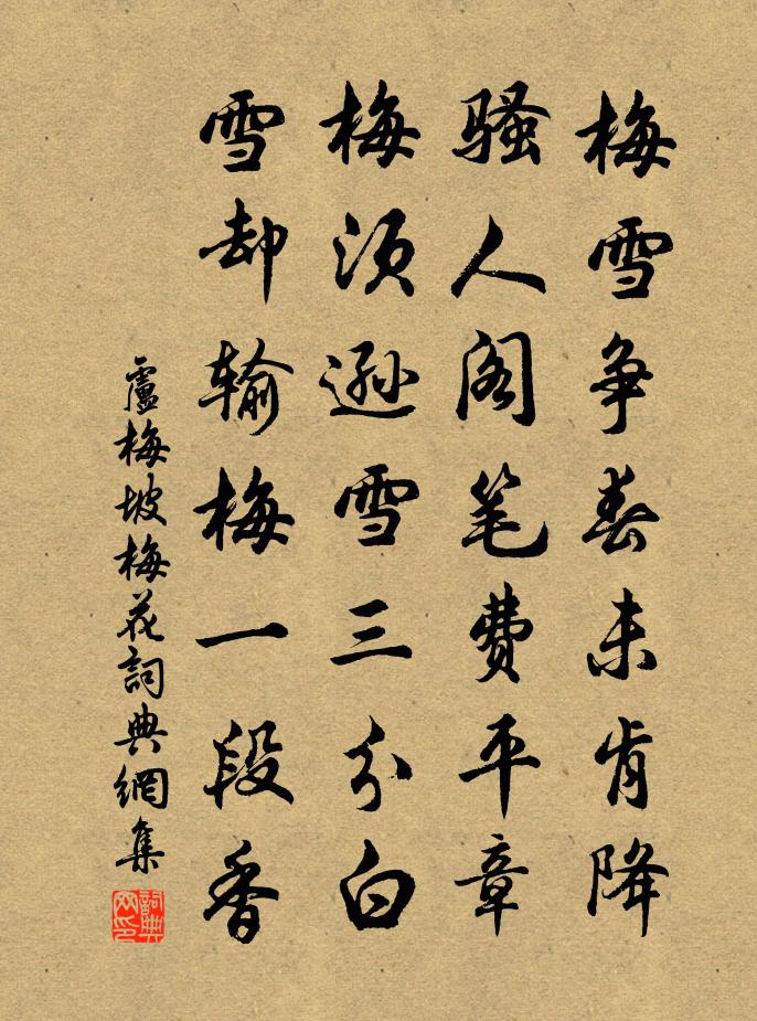 詩詞名句歷史字典書法欣賞書法字典國語詞典說文解字康熙字典古漢語字典標 題 作 者 詩 句 梅花作者:盧梅坡 朝代:宋代梅花原文梅雪爭春未肯降,騷人閣筆費平章。梅須遜雪三分白,雪卻輸梅一段香。詩詞問答問:梅花的作者是誰?答:盧梅坡問:梅花寫於哪個朝代?答:宋代盧梅坡梅花書法欣賞梅花書法作品詩詞推薦姑熟官舍寄汝洛友人許渾〔唐代〕官靜亦無能,平生少面朋。務開唯印吏,公退只棋僧。藥鼎初寒火,書龕欲夜燈。安知北溟水,終日送摶鵬。江梅引 神邪王吉昌〔元代〕四肢氣散失根芽。作神邪。發空華。異物千般,目下亂如麻。一切聖賢隨意現,總變化,都因一念差。不知心病尚琳宮詞次安南王韻許有壬〔元代〕涼入簾幃夜色輕,瑤台添月更虛明。一壺天地渾無跡,只有清風動竹聲。北歸舟次清遠縣上游欲入硤曾豐〔宋代〕舟行所至與清逢,殊覺今清又不同。山到江湄窮則變,水歸峻口窒斯通。秋風鏖葉地頻顣,夜月鑠雲天屢空。兀坐如歸亭許申〔宋代〕幅圓千里浸清流。苹葉微風為客收。畫作一圖何處設,煮茶間看建溪頭。次漕庾兩使者絕句韻六首劉克莊〔宋代〕雋游回首記端平,朝退聯鞍出大明。紫陌難尋看花伴,丹山聊聽喊茶聲。小立淨遠亭楊萬里〔宋代〕清景無終極,頻來未屬厭。遠山秋後出,茅屋近來添。次韻柳子玉過陳絕糧二首蘇軾〔宋代〕如我自觀猶可厭,非君誰復肯相尋。圖書跌宕悲年老,燈火青熒語夜深。早歲便懷齊物志,微官敢有濟時心。南行追感往事陸游〔宋代〕文章光焰伏不起,甚者自謂宗晚唐。歐曾不生二蘇死,我欲痛哭天茫茫!題豫章西山香城寺陳陶〔唐代〕十地嚴宮禮竺皇,旃檀樓閣半天香。祇園樹老梵聲小,雪嶺花香燈影長。霄漢落泉供月界,蓬壺靈鳥侍雲房。何年石壁精舍還湖中作謝靈運〔南北朝〕昏旦變氣候,山水含清暉。清暉能娛人,遊子憺忘歸。出穀日尚早,入舟陽已微。林壑斂暝色,雲霞收夕霏。芰荷艾軒先生侍郎輓詞四首林亦之〔宋代〕菖蒲對客尚從容,明月紅泉夢已空。縱是千年有豪傑,六經人物只斯翁。蘭溪溪岸梅花趙蕃〔宋代〕不用溫家玉鏡台,下臨溪水靜無埃。若非姑射冰肌至,即是羅浮縞袂來。挽王簡卿侍郎三首劉克莊〔宋代〕已矣孤知己,顏蒼鬢髮稀。雖曾參話倆,終未契禪機。尚欲扁舟訪,俄傳只履歸。無因拜公墓,稽首懺前非。張宛丘寄衣曲艾性夫〔宋代〕衷甲蔥河不記春,何須更比小郎身。只消狹剪征衫去,塞雪邊風最瘦人。陽羨雜詠十九首。松嶺陸希聲〔唐代〕嶺上青鬆手自栽,已能蒼翠映莓苔。歲寒本是君家事,好送清風月下來。阻風又成數語呈江朝宗吳芾〔宋代〕平生航浙河,不知幾往返。豈不或滯留,有時容倖免。未若此番來,所向輒相反。順水即值風,便風還阻淺。夜來蝶戀花周邦彥〔宋代〕魚尾霞生明遠樹。翠壁黏天,玉葉迎風舉。一笑相逢蓬海路。人間風月如塵土。剪水雙眸雲鬢吐。醉倒天瓢,笑語送許校書吳融〔唐代〕故人言別倍依依,病里班荊苦憶違。明日柳亭門外路,不知誰賦送將歸?臨碣石曹勛〔宋代〕肅我嚴駕,登彼絕阪。目極天淵,曾不知遠。名句推薦疏星淡月鞦韆院,愁雲恨雨芙蓉面。張可久《塞鴻秋·春情》 生財有大道,生之者眾,食之者寡,為之者疾,用之者舒,則財恆足矣。曾子《禮記·大學》 如何肯到清秋日,已帶斜陽又帶蟬。李商隱《柳》 寒蟬淒切,對長亭晚,驟雨初歇。柳永《雨霖鈴·寒蟬淒切》 還作一段相思,冷波葉舞愁紅,送人雙槳。吳文英《解蹀躞·醉雲又兼醒雨》 今日雲景好,水綠秋山明。李白《九日》 嶺水爭分路轉迷,桄榔椰葉暗蠻溪。李德裕《謫嶺南道中作》 日暖泥融雪半消,行人芳草馬聲驕。杜牧《宣州送裴坦判官往舒州時牧欲赴官歸京》 凍雲宵遍嶺,素雪曉凝華。李世民《望雪》 德之不修,學之不講,聞義不能徙,不善不能改,是吾憂也。孔子弟子《論語·述而篇》