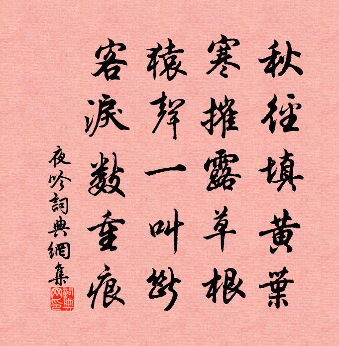 詩詞名句歷史字典書法欣賞書法字典國語詞典說文解字康熙字典古漢語字典標 題 作 者 詩 句 夜吟作者:佚名 朝代:唐代夜吟原文秋徑填黃葉,寒摧露草根。猿聲一叫斷,客淚數重痕。詩詞問答問:夜吟的作者是誰?答:佚名問:夜吟寫於哪個朝代?答:唐代問:佚名的名句有哪些?答:佚名名句大全佚名夜吟書法欣賞夜吟書法作品詩詞推薦和張文裕安寒十首司馬光〔宋代〕何處初寒好,初寒郟鄏城。垂紳多俊顏,更第盡公卿。裘馬過從盛,門闌灑掃清。誰家擁獸炭,盡日管弦聲。清明日集西園宋祁〔宋代〕日日西園春思催,攜觴結客上高台。正緣從事青州至,更許書生洛下來。早葉已成花半落,新巢未定燕千回。芳辰煙徐夤〔唐代〕燎野焚林見所從,惹空橫水展形容。能滋甘雨隨車潤,不並行雲逐夢蹤。晴鳥回籠嘉樹薄,春亭嬌幕好花濃。有時周愚卿同丁永年陳明叔見餞於去城之十里致嚴趙蕃〔宋代〕林表楓能赤,崖邊菊許長。別情俱慘憺,風日倍荒涼。豈為鍾情極,端由取友良。頹然醒雜意,初不累杯觴。詠史上蔡邕陳普〔宋代〕不際明時論石渠,空將薄命仕鴻都。天公似把詞人戲,父子然臍子墜胡。矮道人胡仲弓〔宋代〕白髮蒼顏老,孩童三尺身。向來陽刺史,留得道州人。鳧膝應難續,龜趺卒莫伸。朝家無歲貢,流落瘴江濱。念奴嬌(重九席上)辛棄疾〔宋代〕龍山何處,記當年高會,重陽佳節。誰與老兵供一笑,落帽參軍華發。莫倚忘懷,西風也會,點檢尊前客。淒涼今陪韋中丞宴扈都頭花園趙嘏〔唐代〕門外煙橫載酒船,謝公攜客醉華筵。尋花偶坐將軍樹,飲酒方重刺史天。幾曲艷歌春色里,數行高鳥暮雲邊。分明初到都下供職寄黃九張耒〔宋代〕千里不相見,勞勞復何辭。不遠一城中,耿耿令我思。僦舍酒家樓,推壚卷其旗。鼠壤敗晨炊,守翁噪群兒。馬傍臨川送別盧僎〔唐代〕秋郊日半隱,野樹煙初映。風水正蕭條,那甚動離詠。所思李中〔唐代〕離思春來切,誰能慰寂寥。花飛寒食過,雲重楚山遙。耿耿夢徒往,悠悠鬢易凋。那堪對明月,獨立水邊橋。臨江仙山主〔元代〕實際本來無一事,虛生遍計情荒。紅爐火內降嚴霜。翳除花謝,一念契真常。迷者爭知生死路,驅驅日夜忙忙。道醉落魄(重午)趙長卿〔宋代〕淡妝濃抹。西湖人面兩奇絕。菖蒲角黍家家節。水戲魚龍,十里畫簾揭。凌波無限生塵襪。冰肌瑩徹香羅雪。遊船欲為金陵之行而未果晁說之〔宋代〕舊有山川舊夕陽,新秋新淚兩茫茫。金陵王氣知何在,玉樹後庭聞已芳。情到義山能發問,事經小杜亦多傷。未須句張嘉貞〔唐代〕河魚未上凍,江蟄已聞雷。(見《緯略》)無眠虞儔〔宋代〕蛩吟砌下豈知時,我亦無眠有所思。夜永只憐燈作伴,秋涼最許簟先知。十年擾擾夢中事,一笑悠悠世上兒。數盡和簡文帝賽漢高帝廟詩徐陵〔南北朝〕山宮類牛首。漢寢若龍川。玉盌無秋酎。金燈滅夜煙。丹帷迫靈岳。紺席下羣仙。堂虛沛築響。釵低戚舞妍。何殊寄徐滁州埻立韓元吉〔宋代〕青瑣金鸞跡未容,寘公猶在昔賢中。著書定已追迂叟,得郡何妨號醉翁。豐樂橋邊魚動鏡,清流關下馬嘶風。獨憐懷昔陸游〔宋代〕昔者戍梁益,寢飯鞍馬間。一日歲欲暮,揚鞭臨散關。增冰塞渭水,飛雪暗岐山。悵望釣璜公,英概如可還。挺劍寒松嘆(勝勝慢二首)賀鑄〔宋代〕鵲驚橋斷,鳳怨簫閒,彩雲薄晚蒼涼。難致祖州靈草,方士神香。寒松半敧澗底,恨女蘿、先委冰霜。寶琴塵網,名句推薦少無適俗韻,性本愛丘山。陶淵明《歸園田居·其一》 朱顏那有年年好,逞艷游、贏取如今韓疁《高陽台·除夜》 天山三丈雪,豈是遠行時。李白《獨不見》 曾逐東風拂舞筵,樂遊春苑斷腸天。李商隱《柳》 贈人以言,重於金石珠玉;觀人以言,美於黼黻、文章;聽人以言,樂於鐘鼓琴瑟。荀子《荀子·非相》 家貧思良妻,國亂思良相。司馬光《資治通鑑·周紀·周紀一》 今古河山無定據。納蘭性德《蝶戀花·出塞》 家在夢中何日到,春來江上幾人還?盧綸《長安春望》 雖然不如延年妹,亦是當時絕世人。李白《中山孺子妾歌》 紅豆不堪看,滿眼相思淚。牛希濟《生查子·新月曲如眉》