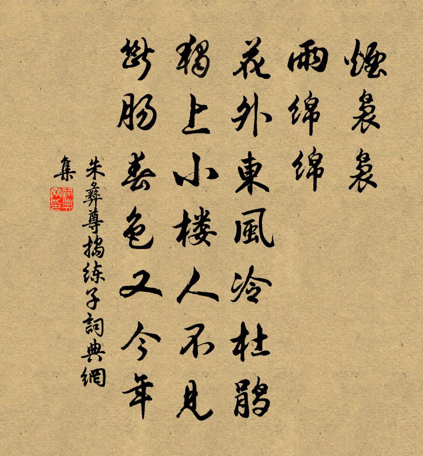煙裊裊,雨綿綿,花外東風冷杜鵑。獨上小樓人不見,斷腸春色又今年。