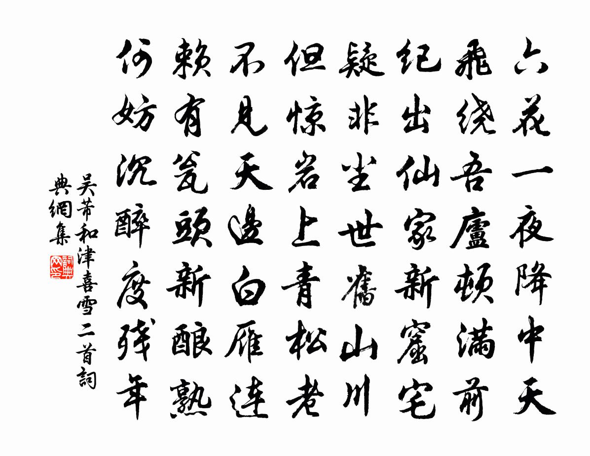 詩詞名句歷史字典書法欣賞書法字典國語詞典說文解字康熙字典古漢語字典標 題 作 者 詩 句 和津喜雪二首作者:吳芾 朝代:宋代和津喜雪二首原文六花一夜降中天,飛繞吾廬頓滿前。紀出仙家新窟宅,疑非塵世舊山川。但驚岩上青松老,不見天邊白雁連。賴有瓮頭新釀熟,何妨沉醉度殘年。詩詞問答問:和津喜雪二首的作者是誰?答:吳芾問:和津喜雪二首寫於哪個朝代?答:宋代吳芾和津喜雪二首書法欣賞和津喜雪二首書法作品詩詞推薦次韻王松陵陳深〔宋代〕江上青山擁縣城,江頭結屋放歌行。散人昔有陸錢望,處士今無補正平。萬頃雲濤聊自賞,百年肝膽定誰傾。休時在水軍宴贈幕府諸侍御李白〔唐代〕月化五白龍,翻飛凌九天。胡沙驚北海,電掃洛陽川。虜箭雨宮闕,皇輿成播遷。英王受廟略,秉鉞清南邊。雲旗石子澗二首范仲淹〔宋代〕鑿開奇勝翠微間,車騎笙歌暮未還。彥國才如謝安石,他時即此是東山。思山居一十首憶葛勝木禪床李德裕〔唐代〕憶我齋中榻,寒宵幾獨眠。管寧穿亦坐,徐孺去常懸。蟲網垂應遍,苔痕染更鮮。何人及身在,歸對老僧禪。句李康成〔唐代〕因緣苟會合,萬里猶同鄉。運命倘不諧,隔壁無津梁。(《經籍考》云:康成編《玉台後集》,中間自載其詩八首偈頌五十一首釋道沖〔宋代〕是著即錯,不是猶乖,一擊萬重關鎖開。老盧不會轉身句,便道明鏡亦非台。江邊行貽趙彥成李新〔宋代〕江頭舊路楓林遠,長笛欺梅紅尚淺。榿茅破樹綠無餘,水霧團空寒不展。髯郎雙鬢春山青,眼光射客詞如雲。卻恐西禪餞董溪翁趙時儋〔宋代〕西浦風寒水自流,迢迢行李又歸休。今宵古寺吟邊酒,明日長江客里舟。溪路梅花催雪興,旗亭竹色伴雲愁。還家南柯子侯善淵〔元代〕坐看華胥景,神遊玩寶方。一雙童子抱龍光。煥煥煌煌,撮聚入中央。產出靈仙子,功成入帝鄉。玉霄榜上應科場和劉清叔襄陽草廬韻二首李曾伯〔宋代〕白馬盟存矢弗寒,玩其肆矣肯泥蟠。風雲未合星先隕,輸與江東日月寬。梅花小吟吳潛〔宋代〕難喚林逋伴客游,占春亭畔獨夷猶。一花兩蘂意方遠,三島十洲香已浮。清曉園林霜似練,黃昏欄檻月如鉤。若還記夢楊冠卿〔宋代〕欹岩松檜轉龍蛇,洞戶仙人字少霞。炯炯長眉非是畫,翠翹斜倚碧桃花。善利閣次伯仁所題趙子良畫四首裘萬頃〔宋代〕箜篌君鄉來,分明記江樹。想君詩成時,夢作白鷗去。論俗十二首劉子翬〔宋代〕扇馬嚴內仗,貂璫侍宸閽。哀哉里閭間。刀閹逮雞豚。放麑識忠藎,毋卵著格言。矧利肥甘軀,絕其孳息源。難銷僧舍小山三首晁沖之〔宋代〕爛石有佳色,禪房疊更幽,九疑峰不斷,十字水長流。枕簟日逃署,軒窗時臥遊。吾衰更何往,只此對湯休。卜運算元郭應祥〔宋代〕客以賞之,仍呼侑尊者六輩,酒半,人簪其一,恰恰無欠余。因賦誰把洛陽花,翦送河陽縣。魏紫姚黃此地無,隨懷友陳柏〔宋代〕攜書入空山,幾若幾世絕。俯仰一室間,頗見古人別。良朋令人思,思君意彌切。食芹差自甘,那得共君啜。詠史上中山靖王勝陳普〔宋代〕樛木螽斯耳未聞,中山無屋貯兒孫。臨分自灑黃泉淚,不在區區骨肉恩。普庵家寶釋印肅〔宋代〕普庵家寶,不著尋討。迷時不見,在處煩惱。悟時無相,如日杲杲。取捨不得,自然恰好。誰生誰病,誰死誰老。賈鹿泉屢約一出小詩代行十首陳杰〔宋代〕故家文獻世公台,直為遺黎萬里來。應念顛崖最辛苦,更移鄂省近南開。名句推薦行人悵望王孫去,買斷金釵十二愁。俞紫芝《詠草》 罪至重而刑至輕,庸人不知惡矣,亂莫大焉。荀子《荀子·正論》 絡緯秋啼金井闌,微霜淒淒簟色寒。李白《長相思·其一》 黃沙百戰穿金甲,不破樓蘭終不還。王昌齡《從軍行七首·其四》 風吹古木晴天雨,月照平沙夏夜霜。白居易《江樓夕望招客》 獨出前門望野田,月明蕎麥花如雪。白居易《村夜》 一物不成,兩物見在。施耐庵《水滸傳·第十二回二》 蜀道之難,難於上青天!李白《蜀道難》 雲中君不見,竟夕自悲秋。馬戴《楚江懷古三首·其一》 生而富者驕,生而貴者傲。范曄《後漢書·列傳·崔駰列傳》