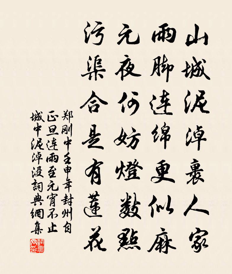 詩詞名句歷史字典書法欣賞書法字典國語詞典說文解字康熙字典古漢語字典標 題 作 者 詩 句 壬申年封州自正旦連雨至元宵不止城中泥淖沒作者:鄭剛中 朝代:宋代原文山城泥淖裹人家,雨腳連綿更似麻。元夜何妨燈數點,污渠合是有蓮花。詩詞問答問:《壬申年封州自正旦連雨至元宵不止城中泥淖沒》的作者是誰?答:鄭剛中問:該詩寫於哪個朝代?答:宋代書法欣賞壬申年封州自正旦連雨至元宵不止城中泥淖沒書法作品詩文賞析【原題】:壬申年封州自正旦連雨至元宵不止城中泥淖沒骭而人家猶燒燈也詩詞推薦信安王幕府詩高適〔唐代〕雲紀軒皇代,星高太白年。廟堂咨上策,幕府制中權。盤石藩維固,升壇禮樂先。國章榮印綬,公服貴貂蟬。樂善詠儋耳二首方向〔明代〕刺竹芭蕉亂結村,人家猶有古風存。相逢盡道年來好,不見催科夜打門。村北村南布穀忙,村前村後稻花香。憑誰董桃行陸機〔魏晉〕和風習習薄林。柔條布葉垂陰。鳴鳩拂羽相尋。倉庚喈喈弄音。感時悼逝傷心。日月相追周旋。萬里倐忽幾年。人和劉坰並簡楊虞卿吳則禮〔宋代〕少日負書笈,老年看戰車。此生渾覓句,隨處有烹茶。乞吾炊黍米,煩君問蕨芽。斕斑赤銅碗,渠輩久名家。訴衷情·琵琶女蘇軾〔宋代〕小蓮初上琵琶弦,彈破碧雲天。分明繡閣幽恨,都向曲中傳。膚瑩玉,鬢梳蟬,綺窗前。素娥今夜,故故隨人,似何叔京挽章二首呂祖謙〔宋代〕濮州以諫死,何氏得其真。天下中庸義,人間父子親。再傳猶易簡,小出復逡巡。埋骨雖南土,傾心向北辰。頌一百則釋重顯〔宋代〕千峰盤屈色如藍,誰謂文殊是對譚。堪笑清涼多少眾,前三三與後三三。哭士特二首劉子翬〔宋代〕世緒風流遠,鄉評譽望清。苦心幾傳癖,老筆擅詩名。已訝祥占鵬,終憐夢泣瓊。五峰雲外碧,一慟見交情。題靈鷲寺黃初庵〔宋代〕屋畔危岑聳佛青,客歸僧定掩雲扃。洞猿窣窣循牆過,几上偷翻貝葉經。又次韻帥初諸前七首陳著〔宋代〕世上紛紛博一廬,案頭矻矻守三餘。牢辭門外雞豚社,菜味深長手灌鋤。行綿州道中陸游〔宋代〕三年客江硤,萬死脫魚黿。平地從今始,窮塗敢復論。園畦棋局整,坡壟海濤翻。瘦犢應多恨,泥塗伏短轅。露徐照〔宋代〕立久衣襟潤,空中氣結成。光凝蘭葉膩,冷逼鶴陰清。又覺為霜近,猶能向日明。惟知漢宮內,千尺有金莖。送趙介之赴舂陵十首彭龜年〔宋代〕訪舊知俗非,好書與理近。氣味既如此,況復少畦畛。送牟太素山人文同〔宋代〕山人高跡若孤雲,聊問太虛求所止。昨因隨風起西北,翩然遠墮三隅里。攬之不住瞥爾去,瞬息誰知幾千里。東遊端午詞升王閣晏殊〔宋代〕織組文繒載舊儀,晨朝丹扆奉天慈。六齋清素來多福,歲歲今辰侍宴私。相州冬日早衙張說〔唐代〕城外宵鍾斂,閨中曙火殘。朝光曜庭雪,宿凍聚池寒。正色臨廳事,疑詞定筆端。除苛囹圄息,伐枳吏人寬。河內重題小舫贈周從事兼戲微之白居易〔唐代〕細篷青篾織魚鱗,小眼紅窗襯麴塵。闊狹才容從事座,高低恰稱使君身。舞筵須揀腰輕女,仙棹難勝骨重人。不似投後村先生劉尚書蒲壽宬〔宋代〕采松北山下,日與樵者親。寸尺拾遺墜,時以供炊薪。日躋白雲岡,暮宿芳草濱。疏泉溉其本,鏡心澄爾神。上有送游提刑秘閣赴召三首程公許〔宋代〕外敵日侵伐,滋為元氣傷。憂心耿不寐,洗耳待封章。弱植如羈羽,知音念五羊。因書主疏賤,決起尚榆枋。閒居書事楊時〔宋代〕輕風拂拂撼孤檉,庭戶蕭然一室清。隔葉蟬鳴微欲斷,又聞餘韻續殘聲。名句推薦小軒獨坐相思處,情緒好無聊。石孝友《眼兒媚·愁雲淡淡雨瀟瀟》 清香隨風發,落日好鳥歸。李白《詠鄰女東窗海石榴》 學者非必為仕,而仕者必如學。荀子《荀子·大略》 彩舟雲淡,星河鷺起,畫圖難足。王安石《桂枝香·登臨送目》 靜女其孌,貽我彤管。佚名《靜女》 白首相知猶按劍,朱門先達笑彈冠。王維《酌酒與裴迪》 馬穿楊柳嘶,人倚鞦韆笑,探鶯花總教春醉倒。王磐《清江引·清明日出遊》 家山何在,雪後園林,水邊樓閣。辛棄疾《瑞鶴仙·賦梅》 江南幾度梅花發,人在天涯鬢已斑。劉著《鷓鴣天·雪照山城玉指寒》 春思亂,芳心碎。惠洪《千秋歲·半身屏外》