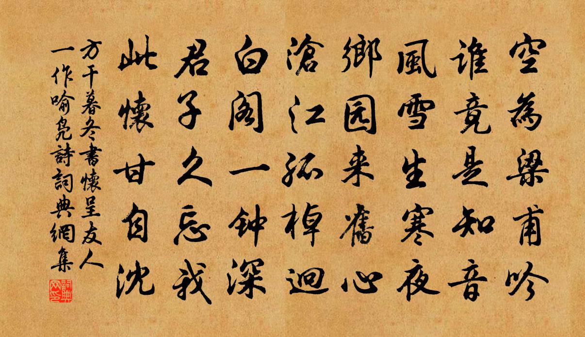 詩詞名句歷史字典書法欣賞書法字典國語詞典說文解字康熙字典古漢語字典標 題 作 者 詩 句 暮冬書懷呈友人(一作喻鳧詩)作者:方乾 朝代:唐代原文空為梁甫吟,誰竟是知音。風雪生寒夜,鄉園來舊心。滄江孤棹迥,白閣一鍾深。君子久忘我,此懷甘自沈。詩詞問答問:《暮冬書懷呈友人(一作喻鳧詩)》的作者是誰?答:方乾問:該詩寫於哪個朝代?答:唐代書法欣賞暮冬書懷呈友人(一作喻鳧詩)書法作品詩詞推薦月夜聽琴效漁父辭胡仲參〔宋代〕風入古松成節奏,泉奔幽磴響琮琤。琴中彈意不彈聲,猛拂朱弦燈焰落。細敲玉版夢魂清,啼烏枝上月三更。次韻和李舍人立秋祠太乙宮宿齋書事之什楊億〔宋代〕太乙祠宮肅,齋居薦至誠。已將茅縮酒,套用面為牲。月映金天朗,風來玉宇清。玄談知理勝,蔬食覺身輕。仙馭【雙調】水仙子_賦婦人染紅周文質〔元代〕賦婦人染紅指甲鳳華香染水晶寒,碎系珊瑚玉筍間,想別離拄齒應長嘆。污檀脂數點斑,記歸期刻損朱闌。錦瑟弦寄題韓勉夫枝巢王洋〔宋代〕逍遙惟所適,小大浪殊觀。溟渤鯤鵬近,藩籬燕雀寬。宅高非遠害,藏密定成發。不似南山樹,枝間有彈丸。送夏辟疆解官毛滂〔宋代〕北風吹勁翮,凌厲欲雲奔。門棒斂行色,縣花消別魂。進舟寒瀨澀,回道亂山昏。珍重操刀事,余言淡可吞。謝惠紅桃二首張明中〔宋代〕報我勤渠有木桃,膚腴密灑茜花膏。枯腸消得三十顆,只恐兒曹賦老饕。城上喬木孔武仲〔宋代〕城上蒼虬困不醒,春陽已半未回青。只應一夜新雷震,漸放繁枝擁日星。點絳唇(劉公寶生日)王千秋〔宋代〕玉立霞升,縱談劉尹高支許。待為霖雨。小駐紅蓮府。鶴健松堅,鴻寶初非誤。玄都路。桃花栽取。來看千千度。偈頌一百一十七首釋紹曇〔宋代〕向上機,頂門眼。察秋毫處暗昏昏,透險崖中平坦坦。三世諸佛,正視無門,白牯狸奴,活埋何限。酬元員外三月三十日慈恩寺相憶見寄白居易〔唐代〕悵望慈恩三月盡,紫桐花落鳥關關。誠知曲水春相憶,其奈長沙老未還。赤嶺猿聲催白首,黃茅瘴色換朱顏。誰言選人歌佚名〔唐代〕今年選數恰相當,都由座主無文章。案後一腔凍豬肉,所以名為姜侍郎。黃雀餉師渾甫家仲安史堯弼〔宋代〕深秋風露豆苗肥,一粒才貪觸禍機。萬裡頭顱無處覓,刺天那復見群飛。足弱二首姜特立〔宋代〕腳力雖雲弱,心靈尚宛然。休輕刖孫臏,猶解殺龐涓。杜鵑行(一作司空曙詩)杜甫〔唐代〕古時杜宇稱望帝,魂作杜鵑何微細。跳枝竄葉樹木中,搶佯瞥捩雌隨雄。毛衣慘黑貌憔悴,眾鳥安肯相尊崇。隳形和劉後村梅花百詠方蒙仲〔宋代〕樂事賞心誰不有,可人勝士古來難。樽前莫怪同游少,恐被梅花白眼看。日本然上人1釋紹曇〔宋代〕橫擔楖栗走諸方,佛祖玄關路轉長。放下身心歸故隱,金烏依舊出扶桑。奉祀禮畢還京夏竦〔宋代〕先天密命啟禎期,侯日靈文降紫闈。恭館靖冥尊妙化,帝居齋祓擁純禧。勒鴻昭姓增梁甫,報本祈年款魏脽。真御湖上薛師石〔宋代〕勢利絕交初,瞿然臥隱廬。無營心淡泊,見客禮生疎。游有漁樵伴,看多佛老書。春深草易長,忘卻倩人鋤。謁金門(昔游)毛滂〔宋代〕燈霧裡。老去昔游不記。月似舊時人不似。小樓何處是。歸臥晚香翠被。玉酒著人小醉。欲睡先來都不睡。此情那謁金門(溫州鹿鳴宴)吳泳〔宋代〕金榜揭。都是鹿鳴仙客。手按玉笙寒尚怯。倚梅歌一闋。柳拂御街明月。鶯撲上林殘雪。前歲杏花元一色。馬蹄歸名句推薦江山故宅空文藻,雲雨荒台豈夢思。杜甫《詠懷古蹟五首·其二》 食之以時,用之以禮。孟子《孟子·盡心章句上·第二十三節》 佳節清明桃李笑,野田荒冢只生愁。黃庭堅《清明》 君去滄江望澄碧,鯨鯢唐突留餘跡。李白《赤壁歌送別》 花繁柳密處,撥得開,才是手段;風狂雨急時,立得定,方見腳根。陳繼儒《小窗幽記·集醒篇》 採蓮南塘秋,蓮花過人頭。佚名《西洲曲》 可憐繡戶侯門女,獨臥青燈古佛旁。曹雪芹《紅樓夢·第五回》 月傍苑樓燈影暗,風傳閣道馬蹄回。王守仁《元夕二首》 曉風催我掛帆行,綠漲春蕪岸欲平。查慎行《曉過鴛湖》 求之其本,經旬必得;求之其末,勞而無功。呂不韋《呂氏春秋·覽·孝行覽》