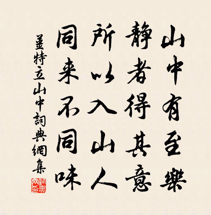 詩詞名句歷史字典書法欣賞書法字典國語詞典說文解字康熙字典古漢語字典標 題 作 者 詩 句 山中作者:姜特立 朝代:宋代山中原文山中有至樂,靜者得其意。所以入山人,同來不同味。詩詞問答問:山中的作者是誰?答:姜特立問:山中寫於哪個朝代?答:宋代姜特立山中書法欣賞山中書法作品詩詞推薦次韻子瞻感舊蘇轍〔宋代〕還朝正三伏,一再趨未央。久從江海游,苦此劍佩長。夢中驚和璞,起坐憐老房。為我忝丞轄,置身願並涼。此心醉桃源佚名〔宋代〕本來無說本無言。澄寂湛然。湛然常寂*神全。希內自觀玄。玄中妙,妙中玄。無相貌,莫團圓。往來去,怎遮攔魏博語佚名〔唐代〕長安天子,魏府牙軍。新陽前口占衛宗武〔宋代〕初見草生池,俄驚草又衰。秋山縮鱗甲,寒渚燭鬚眉。花露先春信,林存傲歲枝。新陽已潛動,為報眾芳知。五禽言楊維楨〔元代〕喚起,喚起。東方明,門前已如市。上林有鳥殺司晨,苦殺蕭娘睡方美。提胡盧,提胡盧,沽酒何處沽?烏程與若送長兄赴調上都次田俊卿韻二首廖行之〔宋代〕霜熟林空月滿川,沖寒突兀聳詩肩。便應策驥行夷路,不用燃犀照碧淵。從昔正人終遇世,到今方士漫求仙。老成久雨二首劉克莊〔宋代〕登高四望積雲深,失了金烏底處尋。未可漚麻需潦退,臨當曬麥輒天陰。寶開元畫憂嵐濕,惜善和書怕蠹侵。只道偈頌一百零四首釋紹曇〔宋代〕水牯牛,偏捩拗。酷暑雲林,恣情{左足右孛}跳。山前祖父田園,忍見離離荒草。秋風正要及時耕,脫落鞭繩無頃自吏部郎去國時,獨同舍趙友益追路送詩,范成大〔宋代〕東風分袂省西廊,袖有明珠照客航。道義有情通出處,文章無地著炎涼。君今猶把一麾去,我敢倦鋤三徑荒。邂逅偈頌七十六首釋師範〔宋代〕曉來瑞氣鬱蔥蔥,流出恩波自九重。地厚天高何以報,飽看南嶽祝融峰。看雪宋祁〔宋代〕慘澹繁雲密霰狂,結瑤城堞儼相望。偷尋柳絮思隋岸,誤折蔾光認洛陽。斜透綺簾欺翡翠,旋迷樓瓦失鴛鴦。平台再用韻和陳伯比二首二晁補之〔宋代〕築台危可瞰垧牧,朝來小雨猶十上。雖無峻岭有修竹,不減山陰同放浪。青門正爾堪邵平,雲中何必須魏尚。小池雜詠一百首齊人妻劉克莊〔宋代〕不敢怨夫子,徒悲誤姜身。安知同穴者,乃是乞墦人。二將劉克莊〔宋代〕二將同時死,路人聞亦哀。力窮鏖轉急。圍厚突難開。戰骨尋應在,殘兵間有回。傷心郵遞里,隔日捷書來。洛下園池邵雍〔宋代〕洛下園池不閉門,洞天休用別尋春。縱游只卻輸閒客,遍入何嘗問主人。更小亭欄花自好,侭荒台榭景才真。虛名夜坐讀書聞瓶梅之香口占五絕趙蕃〔宋代〕客去門扃未作眠,續燈添火了殘編。此時孤絕誰相與,能送幽香亦可憐。題懸溜岩隱者居方乾〔唐代〕世人如要問生涯,滿架堆床是五車。谷鳥暮蟬聲四散,修篁灌木勢交加。蒲葵細織團圓扇,薤葉平鋪合遝花。卻用中秋月曹松〔唐代〕九十日秋色,今秋已十分。孤光吞列宿,四面絕微雲。眾木排疏影,寒流疊細紋。遙遙望丹桂,心緒更紛紛。偈頌一百一十七首釋紹曇〔宋代〕萬金包裹爛泥團,不惜當場撮弄看。敗闕遭人窺覷了,末梢依舊被渠瞞。酬李侍御萼題看心道場賦以眉毛腸心牙等五字(得牙字)皎然〔唐代〕我法從誰悟,心師是貫花。三塵觀種子,一雨發萌牙。定起輪燈缺,宵分印月斜。了空如藏史,始肯會禪家。名句推薦雪岸叢梅發,春泥百草生。杜甫《陪裴使君登岳陽樓》 滿腹詩書漫古今,頻年流落易傷心。宇文虛中《在金日作·選二》 鳥雀呼晴,侵曉窺檐語。周邦彥《蘇幕遮·燎沉香》 玉手佳人,笑把琵琶理。顧德輝《蝶戀花·春江暖漲桃花水》 秦時明月漢時關,萬里長征人未還。王昌齡《出塞二首·其一》 萋萋春草秋綠,落落長松夏寒。王維《田園樂七首·其四》 澤國江山入戰圖,生民何計樂樵蘇。曹松《己亥歲二首·僖宗廣明元年》 苦雨思白日,浮云何由卷。李白《玉真公主別館苦雨贈衛尉張卿二首》 白頭宮女在,閒坐說玄宗。元稹《行宮》 起舞徘徊風露下,今夕不知何夕。蘇軾《念奴嬌·中秋》