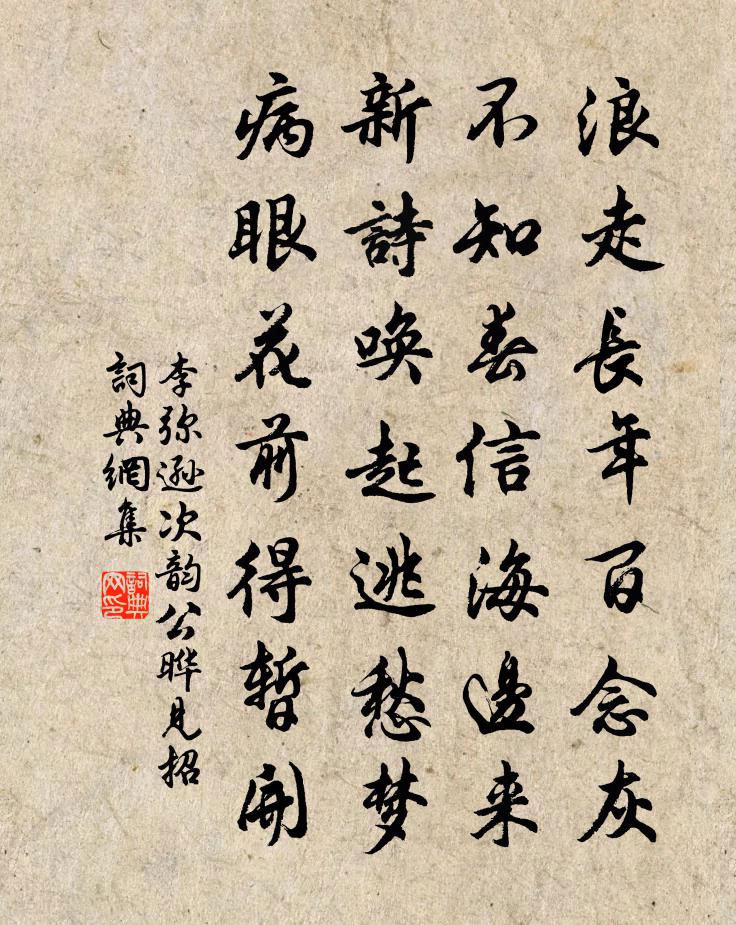 詩詞名句歷史字典書法欣賞書法字典國語詞典說文解字康熙字典古漢語字典標 題 作 者 詩 句 次韻公曄見招作者:李彌遜 朝代:宋代次韻公曄見招原文浪走長年百念灰,不知春信海邊來。新詩喚起逃愁夢,病眼花前得暫開。詩詞問答問:次韻公曄見招的作者是誰?答:李彌遜問:次韻公曄見招寫於哪個朝代?答:宋代李彌遜次韻公曄見招書法欣賞次韻公曄見招書法作品詩詞推薦點絳唇張孝祥〔宋代〕秩秩賓筵,玉潭春漲玻璃滿。旆霞風卷。可但長安遠。夏木成陰,路裊薰風轉。空留戀。細吹銀管。別意隨聲緩。始生七章章八句上皇子嘉王生辰陳傅良〔宋代〕詩人誦稷功,造周本岐嶷。首言民初生,次及稷誕彌。民命系於稷,此語非誇毗。末僚甚拳拳,所愧無周詩。卜運算元姜夔〔宋代〕摘蕊暝禽飛,倚樹懸冰落。下竺橋邊淺立時,香已漂流卻。空徑晚煙平,古寺春寒惡。老子尋花第一番,常恐吳兒重九後三日後圃黃華盛開坐客有論近世菊品日魏了翁〔宋代〕南陽有佳人,被服長修姱。黃中粲有章,秀外青無華。圾飲晉柴桑,夕餐楚長沙。惟與高人處,恥作流俗夸。玄都題馬當山魚望亭四首右陸魯望黃庭堅〔宋代〕笠澤道人高古,文章白髮蕭條。欲問勒銘遺墨,應書水府鮫綃。【雙調】清江引_秋深最好是楊朝英〔元代〕秋深最好是楓樹葉,染透猩猩血。風釀楚天秋,霜浸吳江月。明日落紅多去也!春日登望海亭張伯玉〔宋代〕望海亭前春色深,風光澹澹海沈沈。潮如世路來還去,山帶城蕪古到今。坐見微雲生別岸,吟驚幽鳥起層陰。勸君程泰之昨有金帶銀章之句十月二十八日乃因押周必大〔宋代〕甚日重黃侍玉鑾,幾時八座佩金寒。殿庭屬目夸新貴,部曲低頭拜舊官。五日尹京非細事,四時仕宦固多般。重行續賦家園七詠桂岩劉子翬〔宋代〕山中多桂樹,亭亭傍幽岩。微風發秋香,十里穿松杉。誰歌招隱詞,吾生付長鑱。書江貫道所畫扇吳則禮〔宋代〕胸中豈止丘壑,更有洞庭瀟湘。傳語東坡居士,後來惟教江郎。清江引·立春貫雲石〔元代〕金釵影搖春燕斜,木杪生春葉。水塘春始波,火候春初熱。土牛兒載將春到也。梵天寺房芝蘭〔宋代〕門前流水碧粼粼,禪定僧閒化復淳。攪夢半因詩作崇,破寒全藉酒生春。休教一切有為法,誤著三生自在身。拂袖題韓運鹽竹隱堂絕句三首陸游〔宋代〕鄴下王孫今勝流,相逢三伏凜生秋。未嘗一日可無竹,似是前身王子猷。霜天曉角(祭雙廟樂章)佚名〔宋代〕初獻丹楹轉月。金繡紛幢鉞。勛在有唐宗社,人千載、仰英烈。維辰嗟盡節。故里昭虔揭。臨御雍雍來下,歆初薦觀放鸕鶿艾性夫〔宋代〕烏鬼淋漓受指呼,江魚終日為人敺。扼吭不及能言鴨,哇肉幾同反哺烏。暫滿空喉如癭大,竟無半尾塞腸枯。少寬獻天壽慢/獻天壽佚名〔宋代〕日暖風和春更遲。是太平時。我從蓬島整容姿。來降賀丹墀。幸逢燈夕真佳會,喜近天威。神仙壽算遠無期。獻君和曾吉甫四明見寄二首吳芾〔宋代〕老矣何堪剖竹符,頻年強出應時須。腰間謾佩買臣印,月下同游賀老湖。白雪已知人寡和,清風還憶醉相扶。十洲春日郊行釋紹嵩〔宋代〕稠花亂蕊裹江濱,小雨疏疏向晚晴。逋客未能忘野興,春來無處不閒行。寄終南真空禪師馬戴〔唐代〕閒想白雲外,瞭然清淨僧。松門山半寺,夜雨佛前燈。此境可長住,浮生自不能。一從林下別,瀑布幾成冰?贈新中郭四翁艾性夫〔宋代〕幾人到得白頭翁,生老疴沉是始終。濁穢腥羶除壽算,慳貪嫉妒轉昏蒙。有憎有愛難超世,無慾無情定脫空。幸有名句推薦明朝且做莫思量,如何過得今宵去。周紫芝《踏莎行·情似遊絲》 朝為越溪女,暮作吳宮妃。王維《西施詠》 何時倚虛幌,雙照淚痕乾。杜甫《月夜》 春朝秋夜思君甚,愁見繡屏孤枕。魏承班《滿宮花·雪霏霏》 楚天千里清秋,水隨天去秋無際。辛棄疾《水龍吟·登建康賞心亭》 日初出大如車蓋,及日中則如盤盂,此不為遠者小而近者大乎?列禦寇《兩小兒辯日》 投軀報明主,身死為國殤。鮑照《代出自薊北門行》 厭見千門萬戶,經過北里南鄰。王維《田園樂七首·其一》 煙霏霏。雪霏霏。雪向梅花枝上堆。吳淑姬《長相思令·煙霏霏》 卻道“天涼好個秋”!辛棄疾《醜奴兒·書博山道中壁》