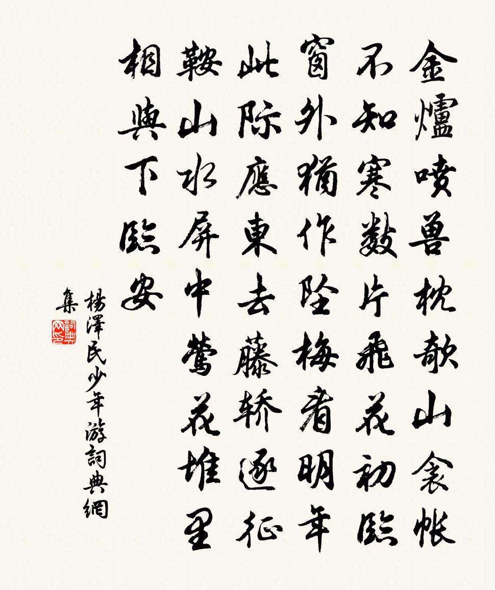詩詞名句歷史字典書法欣賞書法字典國語詞典說文解字康熙字典古漢語字典標 題 作 者 詩 句 少年游作者:楊澤*民 朝代:宋代少年游原文金爐噴獸枕欹山。衾帳不知寒。數片飛花,初臨窗外,猶作墜梅看。明年此際應東去,藤轎逐征鞍。山水屏中,鶯花堆里,相與下臨安。詩詞問答問:少年游的作者是誰?答:楊澤*民問:少年游寫於哪個朝代?答:宋代楊澤*民少年游書法欣賞少年游書法作品詩詞推薦偈頌一百二十三首釋普度〔宋代〕白雲高,灘水急。不動腳頭,全身直入。同章少連游西湖作浩歌行程安仁〔宋代〕湖漘枕帶三百寺,二時鐘鼓驚魚龍。只應天下有此景,人間雖有難與同。二月將半雨過花盛開二首馮時行〔宋代〕最憐半見或不見,更惜欲開猶未開。樹遠祗疑隨水去,枝低還似傍人來。不堪小蕊樽前落,可忍殘紅砌下堆。著盡約楊至之潘謙之登清水岩不果和潘韻陳宓〔宋代〕春入溪山幾許深,擬陪杖屨遠追尋。千章古木都凝綠,百囀黃鸝尚好音。君有佳人同笑語,我懷拙患阻登臨。移時湖亭夜坐徐集孫〔宋代〕片葉秋風數日程,爭如天籟未秋聲。厭居塵境炎威熾,來納虛亭夜氣清。萬點螢光移醉眼,一湖蟾影盪吟情。笙歌次王元渤問余脫齒韻曾幾〔宋代〕齒危但以粥充虛,辜負公家夏屋渠。政恐曲生深作崇,可憐髯簿頓成疏。動搖不減韓吏部,蹴踏非同焦校書。落勢野軒歌張繼先〔宋代〕四海鯨魚不足釣,縱使上鉤吾不要。三島神仙不足夸,長生不死數如麻。驚人名譽不足恃,萬古英雄一場戲。些些頌古三十九首釋道樞〔宋代〕花萼樓前春正濃,蒙蒙柳絮舞晴空。金錢擲罷嬌無力,笑倚闌乾屈曲中。泊舟黃家渡趙汝鐩〔宋代〕溪流暴漲舟如箭,夜向深灣穩處停。猛虎嘯風威動壑,飛鴻過月影移汀。青山入夢催歸棹,白髮欺人嘆暮齡。幸得郴江百詠並序雕玉山阮閱〔宋代〕{倍亻換山}嶁崎嶇面碧霄,何曾溫潤似瓊瑤。一堆頑石彬江上,縱有昆刀不可雕。夏日書事寄丘亢處士姚合〔唐代〕暑天難可度,豈復更持觴。樹里鳴蟬咽,宮中午漏長。病夫心益躁,靜者室應涼。幾欲相尋去,紅塵滿路旁。鼓角仇遠〔宋代〕五更相次曉,一曲有餘清。忽醒山林夢,遙聞鼓角聲。背風還迤邐,帶月最分明。莫作邊城看,長淮久息兵。三月十二日作詩董氏欲為築堂。張耒〔宋代〕黃鳥聲中花已盡,綠楊風外日何長。柯家山下有幽築,雲夢澤南飛故鄉。老病袷衣猶怯冷,春深煮酒漸聞香。本無松下縱筆陸游〔宋代〕老不能閒莫笑予,五千言豈世間書。青松折取當麈尾,為子試談天地初。次韻和鄰幾秋雨十六韻司馬光〔宋代〕氣象殊朝夕,興居錯晦月。混元初不宰,霪雨浩無程。墊隘寧天意,咨嗟固物情。晏{溫氵換日}方有望,蔚薈已枕上聞急雨陸游〔宋代〕枕上雨聲如許奇,殘荷叢竹共催詩。喚回二十三年夢,燈火雲安驛里時。題人畫扇十首曹勛〔宋代〕野林物物適幽棲,春引風高裂石時。何處雙禽飛不定,靜宜翠竹亞寒枝。以鼎爐遺關子東有詩相謝次韻王之望〔宋代〕贈君劍川八卦鼎,一餅清泉終日然。淨幾明窗讀周易,妙香時炷不論錢。次韻曾文清公復熱句蘇泂〔宋代〕百頃滄波望似空,鑿冰吾欲浸其中。何言雷電不為雨,須信梧桐自有風。子晉台頭笙遠近,西真池面玉丁東。行箋軾在潁州與趙德麟同治西湖未成改揚州三月十蘇軾〔宋代〕太山秋毫兩無窮,鉅細本出相形中。大千起滅一塵里,未覺杭潁誰雌雄。(來詩云與杭爭雄。)我在錢塘拓湖淥,名句推薦垂下簾櫳。雙燕歸來細雨中。歐陽修《採桑子·群芳過後西湖好》 冬宜密雪,有碎玉聲。王禹偁《黃岡竹樓記》 若待得君來向此,花前對酒不忍觸。蘇軾《賀新郎·夏景》 葉落當歸根,雲沉久必起。錢嶫《憫黎詠》 自見之謂明。韓非及後人《韓非子·喻老》 下馬登鄴城,城空復何見。岑參《登古鄴城》 路人借問遙招手,怕得魚驚不應人。胡令能《小兒垂釣》 刑天舞乾戚,猛志固常在。陶淵明《讀山海經·其十》 正是江南好風景,落花時節又逢君。杜甫《江南逢李龜年》 道之以政,齊之以刑,民免而無恥。孔子弟子《論語·為政篇》