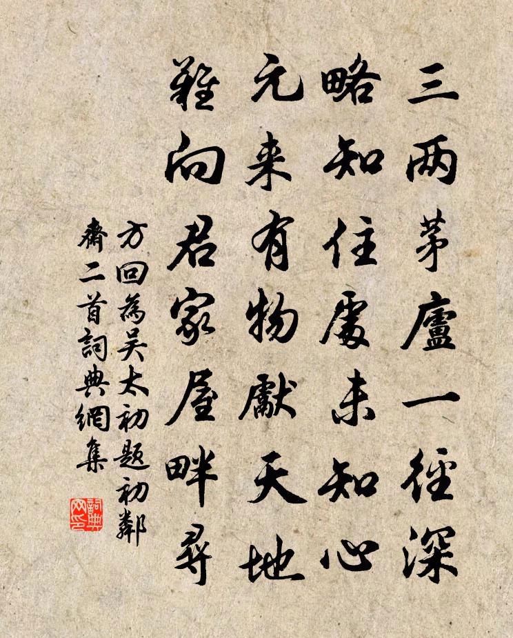 詩詞名句歷史字典書法欣賞書法字典國語詞典說文解字康熙字典古漢語字典標 題 作 者 詩 句 為吳太初題初鄰齋二首作者:方回 朝代:宋代為吳太初題初鄰齋二首原文三兩茅廬一徑深,略知住處未知心。元來有物先天地,難向君家屋畔尋。詩詞問答問:為吳太初題初鄰齋二首的作者是誰?答:方回問:為吳太初題初鄰齋二首寫於哪個朝代?答:宋代方回為吳太初題初鄰齋二首書法欣賞為吳太初題初鄰齋二首書法作品詩詞推薦夜聞漁歌張鎡〔宋代〕非竹非絲響裂空,高歌三唱出漁篷。清豀激越猶如許,想見湘波欸乃中。送汪時法歸金華呂祖儉〔宋代〕人言追送不嫌遠,我獨衰殘懶出門。重教來時路旁候,猶留風月伴黃昏。胡笳曲七拍文天祥〔宋代〕憶昔十五心尚孩,莫怪頻頻勸酒杯。孤城此日腸堪斷,如何不飲令人哀。一去紫台連朔漠,月出雲通雪山白。九度寧宗郊祀二十九首學士院〔宋代〕天錫多祉,皇受五福。言瞻瑤壇,迄奉瑄玉。昭星炳燿,元氣回復。帝得載旋,有嘉穆穆。雨霽登北岸寄友人盧殷〔唐代〕稻黃撲撲黍油油,野樹連山澗自流。憶得年時馮翊部,謝郎相引上樓頭。寄淨名菴僧長吉宋祁〔宋代〕故人詩未報,恨恨復經年。夢去長江路,心知寶所天。孤情岩桂老,逸思暮雲傳。無奈纓緌累,猶乖方外緣。和范蜀公題蜀中花圖韓絳〔宋代〕徑尺千餘朵,矜誇古復今。錦城春物異,粉面瑞雲深。賞愛難忘酒,珍奇不費金。應知色空理,夢幻即歡心。龍游寺南屏軒和宋寵父韻李新〔宋代〕平日江乾過,南屏首重回。不妨圖里見,曾是夢中來。近市樓台逼,高城鼓角催。老年知涉世,臨事卻銜枚。偈頌一百二十三首釋崇岳〔宋代〕五祖老人好語,只為探頭太過。香山有個方便,也要諸人共知。透得金剛圈,細嚼鐵餕餡。一飽忘百飢,始信不相鬼谷子引古語先秦無名〔先秦〕女愛不蔽席。男歡不盡輪。滿江紅(中秋日)呂勝己〔宋代〕屈指重陽,有半月、猶零九日。且停待、今宵月上,寶輪飛出。有客最諳閒況味,無人會得真訊息。算何須、抵死陪諸公登廣福觀下望鼓蠡一首王阮〔宋代〕水繞一圍帶,山橫八字眉。壯哉極目地,慰此憑欄時。剡縣可乘興,渼陂真好奇。相逢休務日,因得數言詩。田父吟五首葉茵〔宋代〕老天應是念農夫,萬頃黃雲著地鋪。有谷未為兒女計,半償私債半官租。沙頭陸游〔宋代〕遊子行愈遠,沙頭逢暮秋。孫劉鼎足地,荊益犬牙州。鼓角風雲慘,江湖日夜浮。此生應袞袞,高枕看東流。夢筆驛姚宏〔宋代〕一宵短夢驚流俗,千里高名掛里閭。遂使晚生矜此意,痴眠不讀半行書。白髮陸游〔宋代〕白髮千莖綠鬢稀,臥看鵷鷺刺天飛。平生竊鄙貢公喜,故里但思陶令歸。清坐了無書可讀,殘年賴有佛堪依。君看北亭楊冠卿〔宋代〕北風無時休,荒山路綿綿。老馬被吹揚,卻立不肯前。我仆行且仆,竟日數裡間。悠然欲何適,正坐歸無田。予初到筠即於酒務庭中種竹四叢杉二本及今三蘇轍〔宋代〕種竹成叢移出檐,三年慰我病厭厭。翦除亂葉風初好,封植孤根筍自添。高節不知塵土辱,堅姿試待雪霜沾。屬君湘中戴復古〔宋代〕荊楚一都會,瀟湘八景圖。試呼沙鳥問,曾識古人無。痛哭賈太傅,行吟屈大夫。汀洲芳草歇,轉使客情孤。小心坡余鴻〔清代〕魚背崎嶇無奈何,小心緩步度高坡。語兒山路休閒險,世路須知險更多。名句推薦斜陽獨倚西樓。遙山恰對簾鉤。晏殊《清平樂·紅箋小字》 聰明睿智,守之以愚李昉、李穆、徐鉉《太平御覽·文部·卷六》 雨雪雰雰,益之以霢霂。佚名《信南山》 豈知民力艱,顆米皆琳琅。黃燮清《秋日田家雜詠》 立身之道何窮,只得一敬字,便事事皆整。王永彬《圍爐夜話·第一六三則》 唯有長江水,無語東流。柳永《八聲甘州·對瀟瀟暮雨灑江天》 誰信多情道,相思漸覺詩狂少。吳綺《惜分飛·寒夜》 錦帶吳鉤,征思橫雁水。吳文英《荔枝香近·送人游南徐》 日光下澈,影布石上,佁然不動;柳宗元《小石潭記》 西園有分,斷柳淒花,似曾相識。吳文英《瑞鶴仙·秋感》