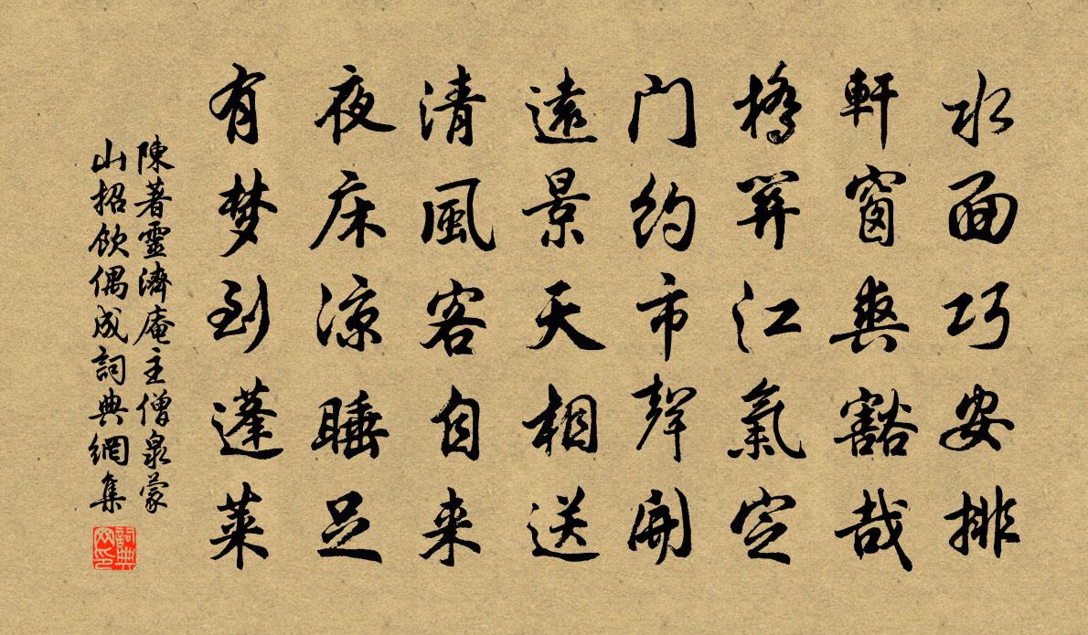 詩詞名句歷史字典書法欣賞書法字典國語詞典說文解字康熙字典古漢語字典標 題 作 者 詩 句 靈濟庵主僧泉蒙山招飲偶成作者:陳著 朝代:宋代靈濟庵主僧泉蒙山招飲偶成原文水面巧安排,軒窗爽豁哉。橋關江氣定,門約市聲開。遠景天相送,清風客自來。夜床涼睡足,有夢到蓬萊。詩詞問答問:靈濟庵主僧泉蒙山招飲偶成的作者是誰?答:陳著問:靈濟庵主僧泉蒙山招飲偶成寫於哪個朝代?答:宋代陳著靈濟庵主僧泉蒙山招飲偶成書法欣賞靈濟庵主僧泉蒙山招飲偶成書法作品詩詞推薦梅陸游〔宋代〕俗事常妨把一杯,等閒開過小園梅。自傷惟有尋春夢,百舌無情又喚回。雙流旅舍陸游〔宋代〕西風黃葉滿江村,瘦馬來穿渡口雲。動地傳呼逢醉尉,誰何禁殺故將軍!過桂氏湖莊鄭蘭〔宋代〕堂上一天水,秋風叫白鷳。地偏遊客少,闊水釣徒閒。懷古樓宜野,澆蔬月在山。駕言尋舊好,款款到蘆灣。金剛隨機無盡頌無法可得分第二十二釋印肅〔宋代〕如是□些些,翠竹與黃花。打鼓弄琵琶,還我一會家。艤舟楊口叩居人以休哩縛屋於此何時復去雲我趙蕃〔宋代〕戶戶魚蠻子,年年雁泊人。生資持網罟,遷徒逐冬春。岸俗從渠變,鄉鄰自我親。殊勝倦遊者,渺渺愧風塵。農謠方岳〔宋代〕雨過一村桑柘煙,林梢日暮鳥聲妍。青裙老姥遙相語,今歲春寒蠶未眠。偈頌七十六首釋師範〔宋代〕天地之根,萬物之主。大千無以居其尊,劫石難以並其固。游郭希呂石洞二十詠必雲劉過〔宋代〕仙宮已降敕,雅有新遷除。乞為此閣使,雲物屢卷舒。出遊陸游〔宋代〕霜氣蕭條木葉黃,佳時病起意差強。雲煙古寺聞僧梵,燈火長橋見戲場。一枕清風幽夢斷,數匙旅飯野蔬香。道邊答表臣贈別二首劉禹錫〔唐代〕昔為瑤池侶,飛舞集蓬萊。今作江漢別,風雪一徘徊。嘶馬立未還,行舟路將轉。江頭暝色深,揮袖依稀見。品令佚名〔宋代〕山重雲起。斷橋外、池塘水。曉來風定,竹枝相亞,殘陽影里。多少風流,都在冷香疏蕊。江南千里。問折得、誰嚴河南孟郊〔唐代〕赤令風骨峭,語言清霜寒。不必用雄威,見者毛髮攢。我有赤令心,未得赤令官。終朝衡門下,忍志將築彈。君從餘姚江上夜看殘雪蘇泂〔宋代〕星斗夜迢迢,江空一棹搖。亂山詩態活,殘雪醉魂消。已作無懷氏,長思有道朝。周公夢不見,篷底聽鴟鴞。慈谿龍虎軒偶成呂祖儉〔宋代〕龍蟠虎踞秣陵城,甬上蒼官亦強名。獨占高峰傲千古,夜深月照落潮聲。衡山何道士有詩聲楊伯子監丞盛稱之以楊所取戴復古〔宋代〕道人幽吟岩壑底,伴曉猿啼秋鶴唳。自陶情性樂天真,一心不作求名計。一朝邂逅楊東山,詩聲揚揚滿世間。東山睡魔舒岳祥〔宋代〕睡魔如瘧鬼,日日應期來。符篆燒難卻,茶槍戰不開。中宵翻醒去,當晝又潛回。應是五窮數,留君共酌杯。思省吟邵雍〔宋代〕仲尼再思,魯子三省。予何人哉,敢忘修整。擬古黃庚〔宋代〕徂徠有嘉木,薿薿高連天。修柯濯雨露骨,沃葉藏雲煙。根蟠九地暖,聲落四壁寒。由來所養□,中與春相干。歲題畫蘭卷兼梅花王冕〔元代〕湘江雲盡湘山青,秋蘭花開秋露零。三閭已矣喚不起,□蕕蕭艾春娉婷。次飈吹香散郊坰,山蜂野蝶何營營?幽人和季平哭小女時避地靈峰鄭剛中〔宋代〕荒山藤束木皮棺,見此令人鼻骨酸。自是杏殤風易剪,不須慚痛淚闌乾。名句推薦辜負我,悔憐君,告天天不聞。牛嶠《更漏子·春夜闌》 可憐今夜月,不肯下西廂。王庭筠《絕句·竹影和詩瘦》 不戚戚於貧賤,不汲汲於富貴。陶淵明《五柳先生傳》 上窗風動竹,月微明。呂渭老《小重山·七夕病中》 年去年來白髮新,匆匆馬上又逢春。于謙《立春日感懷》 綠淨春深好染衣。際柴扉。賀鑄《釣船歸·綠淨春深好染衣》 海風吹不斷,江月照還空。李白《望廬山瀑布水二首》 灞橋楊柳年年恨,鴛浦芙蓉葉葉愁。蘇庠《鷓鴣天·楓落河梁野水秋》 心事孤山春夢在,到思量、猶斷詩魂吳文英《極相思·題陳藏一水月梅扇》 烽火照西京,心中自不平。楊炯《從軍行》