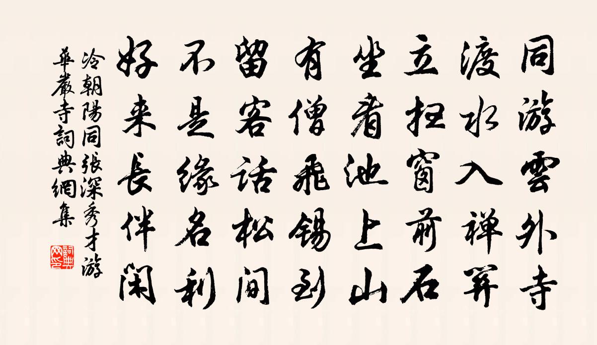 詩詞名句歷史字典書法欣賞書法字典國語詞典說文解字康熙字典古漢語字典標 題 作 者 詩 句 同張深秀才游華嚴寺作者:冷朝陽 朝代:唐代同張深秀才游華嚴寺原文同游雲外寺,渡水入禪關。立掃窗前石,坐看池上山。有僧飛錫到,留客話松間。不是緣名利,好來長伴閒。詩詞問答問:同張深秀才游華嚴寺的作者是誰?答:冷朝陽問:同張深秀才游華嚴寺寫於哪個朝代?答:唐代問:同張深秀才游華嚴寺是什麼體裁?答:五律冷朝陽同張深秀才游華嚴寺書法欣賞同張深秀才游華嚴寺書法作品注釋全唐詩:卷305-24詩詞推薦自桃川至辰州絕句四十有二趙蕃〔宋代〕牂牁何處莫窮源,萬折千磯劇迅奔。寸寸上來良亦苦,不知斷支出秘番魂。踏莎行 金錢卜歡 復古詩集五以上周詠先輯本王國器〔元代〕暗擲龍文,尋盟鸞鏡。龜兒不似青蚨準。花房羞化彩娥飛,銀橋密遞仙娥信。錦屋瓊樓,薄情飄性。碧雲望斷紅輪十月九日醉中二首陳著〔宋代〕八十二年真過分,兩三閒屋漫偷安。家人病退藥方熟,兒子歸來酒量寬。只把詩書供日用,不知宇宙有風寒。開門甘棠橋袁說友〔宋代〕波入南溪綠,荷薰夾岸香。一川虹倒影,百步帶橫塘。舟榜橋邊柳,魚驚月下榔。人亡遺愛遠,誰復賦甘棠。餘姚董役海進有作謝景初〔宋代〕五行交相陵,海水不潤下。處處壞進防,白浪大於馬。顧予為其長,恐懼敢暫舍。董眾完築塞,跋履率曠野。使人歸雲溪三首郭印〔宋代〕才入雲溪境,欣然面故人。江郊寧改舊,竹樹更增新。泉石重為伴,樵漁永作鄰。丁寧魚與鳥,久出幸無嗔。郴江百詠並序碧虛亭阮閱〔宋代〕筇竹枝彎屐齒搖,登臨身覺在煙霄。千峰險似三川峽,一水深如八月潮。滿庭芳楊 * 〔宋代〕春過園林,雨餘池沼,嫩荷點點青圓。晝長人靜,芳樹欲生煙。一徑幽通邃竹,松風漱、石齒濺濺。平生志,功名次洪漕韻二首洪咨夔〔宋代〕塞垣擁雪髑髏寒,多少將軍博美官。莫恨知心今世鮮,須知行道古來難。時窮地狹何能舞,命好天高亦可鑽。此理好事近趙士暕〔宋代〕造化有深功,綴就梢頭黃蠟。剪刻翻成新樣,與江梅殊別。半開微露紫檀心,蕭灑對風月。素手偏宜折取,向烏雲和丁祖舜二月陰寒之作陳淳〔宋代〕東皇涖事已告半,農村恰恰脂田車。胡為玄冥尚偃蹇,暗弄威權未退斜。陳{露各換今}最痴鎖烏腳,阿香亦懶敲浣溪沙范成大〔宋代〕十里西疇熟稻香。槿花籬落竹絲長。垂垂山果掛青黃。濃霧知秋晨氣潤,薄雲遮日午陰涼。不須飛蓋護戎裝。和蓬萊老之兄卓宣教見遺釋寶曇〔宋代〕要結靈山未了緣,山中草木亦欣然。大江南北經年夢,明月東西一夜圓。龍象而今非故我,功名自古付華顛。相逢江城子·南溪二月雨康與之〔宋代〕南溪二月雨初晴。四郊明。暖風輕。一雨一風,鋪地落紅英。枝上流鶯啼勸我,春欲去,且留春。登臨行樂慰閒情巫山一段雲 登龍峰趙孟頫〔元代〕片月生危岫,殘霞拂翠桐。登龍峰下楚王宮。千古感遺蹤。柳色眉邊綠,花明臉上紅。欲尋靈積阻江風。離思杳無詠北海汪遵〔唐代〕漢臣曾此作縲囚,茹血衣毛十九秋。鶴髮半垂龍節在,不聞青史說封侯。偈頌一百五十首釋心月〔宋代〕與麽也在我,不與麽也在我。明眼漢擔拄杖繞天下橫行,為什麼透這些子不得。前日小詩並呈魯漕吳芾〔宋代〕華發蕭蕭我與君,未能免俗尚馳奔。相看已是成三老,得暇何妨共一樽。我欲丐閒歸故里,君行趣召入修門。亦知雨中登北樓李彌遜〔宋代〕白首登臨海一隅,晚風吹雨上髭鬚。日邊不郵平安使,雲影滿川山有無。芳草黃滔〔唐代〕澤國多芳草,年年長自春。應從屈平後,更苦不歸人。名句推薦大丈夫相時而動。曹雪芹《紅樓夢·第四回》 正是浴蘭時節動。菖蒲酒美清尊共。歐陽修《漁家傲·五月榴花妖艷烘》 放眼暮江千頃,中有離愁萬斛,無處落征鴻。楊炎正《水調歌頭·把酒對斜日》 落花夜雨辭寒食。塵香明日城南陌。吳文英《菩薩蠻·落花夜雨辭寒食》 君看石芒碭,掩淚悲千古李白《丁督護歌》 中池所以綠,待我泛紅光。沈約《詠芙蓉》 夸而有節,飾而不誣劉勰《文心雕龍·誇飾》 泛菊杯深,吹梅角遠,同在京城。劉過《柳梢青·送盧梅坡》 清香隨風發,落日好鳥歸。李白《詠鄰女東窗海石榴》 情往似贈,興來如答。劉勰《文心雕龍·物色》