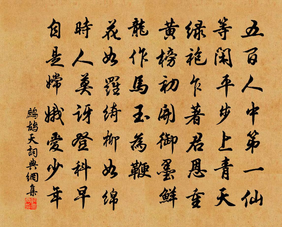 詩詞名句歷史字典書法欣賞書法字典國語詞典說文解字康熙字典古漢語字典標 題 作 者 詩 句 鷓鴣天作者:佚名 朝代:宋代鷓鴣天原文五百人中第一仙。等閒平步上青天。綠袍乍著君恩重,黃榜初開御墨鮮。龍作馬,玉為鞭。花如羅綺柳如綿。時人莫訝登科早,自是嫦娥愛少年。詩詞問答問:鷓鴣天的作者是誰?答:佚名問:鷓鴣天寫於哪個朝代?答:宋代問:鷓鴣天是什麼體裁?答:詞問:佚名的名句有哪些?答:佚名名句大全佚名鷓鴣天書法欣賞鷓鴣天書法作品詩詞推薦【雙調】慶東原_次馬致遠先張可久〔元代〕次馬致遠先輩韻九篇九首燒丹灶,洗藥瓢,樂清閒幾個人知道。閒吹鳳簫,悶拈兔毫,焉用牛刀。他得志笑閒人,和象翁絕句衛宗武〔宋代〕春花色色俱成夢,夏實纍纍結滿枝。獨有葵榴媚清晝,薰風時度五弦詩。故居鄭剛中〔宋代〕北山三十里,憶得舊書堂。小徑通蔬圃,新醅壓酒床。晚涼荷葉嫩,細雨橘花香。此夢今何許,隨緣又一方。林亭王珪〔唐代〕地回林泉好,乘間會勝游。深沈煙色聚,瀟灑雨聲收。貧過揚雄宅,狂思范蠡舟。寄言賞心友,巾褐此經秋。寧宗朝享三十五首真宗〔宋代〕凡楹雲深,芳勺宵奠。樂華淳鬯,禮文炳絢。有容有備,載肅載見。維時緝熙,世世以燕。霜天曉角(己未五月九日,老香堂送監簿侄歸,和自昭韻)吳潛〔宋代〕秋涼佳月,掃盡輕衫熱。便欲乘風歸去,冰玉界、瓊林闕。不須持寸鐵,孤吟風措別。且唱東坡水調,清露下、滿已亥雜詩 230龔自珍〔清代〕二王只合為奴僕,何況唐碑八百通。欲與此銘分浩逸,北朝差許鄭文公。寄河南鄭侍郎薛能〔唐代〕三峽與三壕,門闌夢去勞。細冰和洛水,初雪灑嵩高。大雅何由接,微榮亦已逃。寒窗不可寐,風地葉蕭騷。偈頌二百零五首釋正覺〔宋代〕肉團無主,空劫有家。清白十分活計,丕平一段生涯。月戶風高兮雲凝古路,星河浪靜兮夜泛靈槎。唯心成萬法,清書丘葵〔宋代〕誰信茅茨即玉堂,間來清書似宵長。二儀升降太虛內,一靜消磨萬意忙。忿欲俱空心自正,行持無力夢猶狂。可曾和季站秋日即事晁說之〔宋代〕五世衣冠盛本朝,寧論妻織與兒樵。願予始就山居樂,未放詩書便泬寥。王祁公北園梅堯臣〔宋代〕園林多高樛,園卉多芳柔。紅紫經幾春,青枯經幾秋。我至每懷浮觴之卿翁,但見浮觴之水汨汨流。水流日夜曾未大滌洞天留題謝岳甫〔宋代〕天然奇石聳雲端,下浸龍泓一掬寒。靜聽潺湲眠未得,不妨乘月依闌乾。扇子詩李石〔宋代〕戰葉初收兩點稀,入簾花影碎晴暉。莫留一物遮人眼,展出青天放鶴飛。後梁宣明二帝碑堂下作劉禹錫〔唐代〕玉馬朝周從此辭,園陵寂寞對豐碑。千行宰樹荊州道,暮雨蕭蕭聞子規。題陳氏所藏著色山水圖貢奎〔元代〕獨臥曉慵起,夢中千萬山。推窗煙雲滿,一笑咫尺間。裊裊美人妝,金碧粲笄鬟。素波淨如鏡,綠蘋點溪灣。美哉寄南浦謫官鄭谷〔唐代〕多才翻得罪,天末抱窮憂。白首為遷客,青山繞萬州。醉欹梅障曉,歌厭竹枝秋。望闕懷鄉淚,荊江水共流。失調名佚名〔宋代〕雙雙飛燕柳邊輕。山齋書事林表民〔宋代〕掩卷聽蟬韻,憑欄樓雁行。井風梧葉雨,籬月菊花霜。又見秋將老,那堪夜更長。愁吟無語共,殘灺落書床。明月許月卿〔宋代〕明月天雙鑒,清湖地萬弓。人行楊柳外,身在畫圖中。天闊雙眸快,樓高萬象融。故山應更好,楊柳映芙蓉。名句推薦漢月垂鄉淚,胡沙費馬蹄。岑參《磧西頭送李判官入京》 當斷不斷,反受其亂。司馬遷《史記·齊悼惠王世家》 燈火萬家城四畔,星河一道水中央。白居易《江樓夕望招客》 桃花落,閒池閣。山盟雖在,錦書難托。陸游《釵頭鳳·紅酥手》 今朝有酒今朝醉,明日愁來明日憂。佚名《增廣賢文·上集》 桃李風前多嫵媚,楊柳更溫柔。辛棄疾《武陵春·桃李風前多嫵媚》 桃花流水窅然去,別有天地非人間。李白《山中問答》 晚來天欲雪,能飲一杯無?白居易《問劉十九》 遠看山有色,近聽水無聲王維《畫》 青海長雲暗雪山,孤城遙望玉門關。王昌齡《從軍行七首·其四》