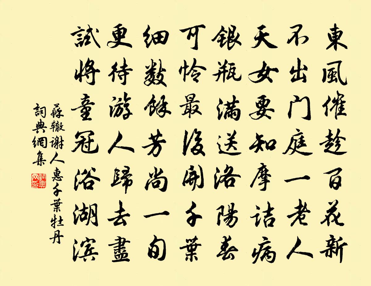 詩詞名句歷史字典書法欣賞書法字典國語詞典說文解字康熙字典古漢語字典標 題 作 者 詩 句 謝人惠千葉牡丹作者:蘇轍 朝代:宋代謝人惠千葉牡丹原文東風催趁百花新,不出門庭一老人。天女要知摩詰病,銀瓶滿送洛陽春。可憐最後開千葉,細數余芳尚一旬。更待遊人歸去盡,試將童冠浴湖濱。詩詞問答問:謝人惠千葉牡丹的作者是誰?答:蘇轍問:謝人惠千葉牡丹寫於哪個朝代?答:宋代問:蘇轍的名句有哪些?答:蘇轍名句大全蘇轍謝人惠千葉牡丹書法欣賞謝人惠千葉牡丹書法作品詩詞推薦句洪興祖〔宋代〕願公十襲勿浪出,六丁取將飛辟歷。悟空塔釋贊寧〔宋代〕浮圖蕭瑟入虛空,一聚全身罔像中。傳馬祖心開佛印,識龍潛主示神通。毫光委墜江樓月,道氣馨香海岸風。此地盱江山寺趙希丙〔宋代〕寺古鐘魚在,林深麋鹿游。亂雲從地涌,野水接天流。樹老半粘屋,山狂欲入樓。無人話心事,黃葉自吟秋。秋日即事馮時行〔宋代〕人情節物自相關,強不悲秋亦恐艱。漸老身危生理索,憑高眼遠暮天寒。樹能長嘯風前聽,山亦多愁雨裹看。陶寫沁園春 送劉牧之同知歸江南張之翰〔元代〕昨日送春,今日送君,難禁別離。正桃花水滿,遠歸江浙,楝花風起,輕出京師。早把功名,置之身外,世上何愁詠史詩阿房宮胡曾〔唐代〕新建阿房壁未乾,沛公兵已入長安。帝王苦竭生靈力,大業沙崩固不難。生查子(贈陳宋鄰)向子諲〔宋代〕娟娟月入眉,整整雲歸鬢。鏡里弄妝遲,簾外花移影。斜窺秋水長,軟語春鶯近。無計奈情何,只有相思分。會慶聖節使人到闕集英殿宴致語口號崔敦詩〔宋代〕雲護輕霜漏曉晴,日高黃傘影亭亭。六龍衛蹕來臨座,五鳳儀韶下舞庭。地涌南山朝帝殿,天回北斗挹仙釀。侍臣金陵雜興二百首蘇泂〔宋代〕桑林伐盡棗林空,賣得柴錢飯不充。明日死生猶未必,新何纏裹過秋冬。喜吉老甥見過張耒〔宋代〕西風吹藜藿,秋色滿環堵。悲蟲語窗月,陰蕊開夕露。門閒賓客少,鳥雀任散聚。楊甥時過我,論詩朝達暮。新茶奉謝司封使君宴公臨顧園居朱長文〔唐代〕閒臥林泉與世疏,使君三度枉旌旟。未陪徐孺升賓榻,敢屈文侯式敝閭。暫擲魚竿絲半卷,旋開松徑草新鋤。愧無詠嚴子陵梅堯臣〔宋代〕不顧萬乘主,不屈千戶侯,手澄百金魚,身被一羊裘。借問此何耳,心遠忘九州。青山束寒灘,濺浪驚素鷗。以之水村姜特立〔宋代〕一水瀉寒玉,數峰羅翠屏。漁樵自來往,不悟落丹青。青雲乾呂令狐楚〔唐代〕鬱郁復紛紛,青霄乾呂雲。色令天下見,候向管中分。遠覆無人境,遙彰有德君。瑞容驚不散,冥感信稀聞。湛露元符親郊五首仁宗〔宋代〕聲遺八尊,哭空二簋。至祝至虔,穹祗貺祉。上藍寺吸江樓艾性夫〔宋代〕拔地連雲百尺樓,長風斷雁十分秋。絕無山硋天空闊,獨與江鄰水拍浮。潭底老龍眠屋影,雨余雌霓跨簾鉤。愁來十二月大雨裘萬頃〔宋代〕一冬都無五日寒,赤日杲杲后土乾。水官丐歸帝弗許,詰朝不雨吾戮汝。斯須便放大瓢傾,一洗萬里塵埃清。不妨謾書周邦彥〔宋代〕麗日烘簾幔影斜,酒余春思托韶華。高樓不隔東南望,苦霧游雲莫謾遮。游圓通寺馬仲珍〔宋代〕山空不隱響,一葉落還聞。龍去遺荒井,僧歸禮白雲。蟲絲昏畫壁,嵐氣濕爐薰。睡思渾無奈,茶甌易策勛。山居苦潘牥〔宋代〕門外車聲寂不嘩,數椽淨掃小山家。懶鉏茂叔窗前草,剩種淵明籬下花。不飲客來還貰酒,長閒飯罷必煎茶。紫岩名句推薦夫天地者,萬物之逆旅也;光陰者,百代之過客也。李白《春夜宴桃李園序 / 春夜宴從弟桃花園序》 勝日尋芳泗水濱,無邊光景一時新。朱熹《春日》 江間波浪兼天涌,塞上風雲接地陰。杜甫《秋興八首·其一》 寄語東陽沽酒市,拼一醉,而今樂事他年淚。朱服《漁家傲·小雨纖纖風細細》 秋晚佳晨重物華,高台復帳駐鳴笳。宋祁《九日置酒》 桃花一簇開無主,可愛深紅愛淺紅?杜甫《江畔獨步尋花·其五》 東風吹柳日初長,雨余芳草斜陽。秦觀《畫堂春·春情》 愛人利人以得福者有矣,惡人賊人以得禍者,亦有矣。墨子《墨子·04章 法儀》 居逆境中,周身皆針砭藥石,砥節礪行而不覺;處順境內,眼前盡兵刃戈矛,銷膏靡骨而不知。洪應明《菜根譚·概論》 一番荷芰生池沼,檻前風送馨香。尹鶚《臨江仙·一番荷芰生池沼》