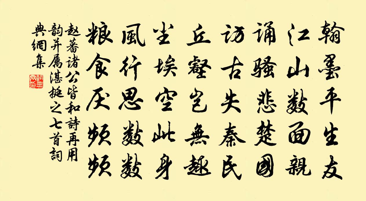 詩詞名句歷史字典書法欣賞書法字典國語詞典說文解字康熙字典古漢語字典標 題 作 者 詩 句 諸公皆和詩再用韻並屬湛挺之七首作者:趙蕃 朝代:宋代原文翰墨平生友,江山數面親。誦騷悲楚國,訪古失秦民。丘壑豈無趣,塵埃空此身。風行思數數,糧食厭頻頻。詩詞問答問:《諸公皆和詩再用韻並屬湛挺之七首》的作者是誰?答:趙蕃問:該詩寫於哪個朝代?答:宋代書法欣賞諸公皆和詩再用韻並屬湛挺之七首書法作品詩詞推薦池窗白居易〔唐代〕池晚蓮芳謝,窗秋竹意深。更無人作伴,唯對一張琴。樵夫毀山神佚名〔清代〕康熙十五年,餘姚有客山行,夜宿山神寺。夜半,有虎跪拜,作人言,乞食,神以鄧樵夫許之。明晨,客伺於神祠訴衷情·夜寒茅店不成眠吳激〔金代〕夜寒茅店不成眠。殘月照吟鞭。黃花細雨時候,催上渡頭船。鷗似雪,水如天。憶當年。到家應是,童稚牽衣,笑聞杜宇宋祁〔宋代〕傳聞望帝冤,底處最堪憐。蜀月將殘夜,巴山欲曉天。周軍嘗化鶴,齊後亦為蟬。物變皆如此,非君是偶然。泊小姑山陳造〔宋代〕楚山屹兩姑,我見乃其稚。聞名詩卷音,識面客舟次。玉刻極端麗,簪植瞑蒼翠。娟月上天角,相與詫嫵媚。怒風以廬山三疊泉寧張宗瑞湯巾〔宋代〕九疊峰頭一道泉,分明來處與雲連。幾人競賞飛流勝,今日方知至味全。鴻漸但嘗唐代水,涪翁不到紹熙年。從茲滿庭芳 勸沃州孫仙進道馬鈺〔元代〕神仙何處,只在蓬萊。逍遙坦蕩奇或。或向虛無縹緲,去去來來。賞玩十洲三島,縱閒遊、閬苑瑤台。無窮樂,與奉和張大夫戲示青山郎韋應物〔唐代〕天生逸世姿,竹馬不曾騎。覽卷冰將釋,援毫露欲垂。金貂傳幾葉,玉樹長新枝。榮祿何妨早,甘羅亦小兒。頌古十首釋師體〔宋代〕三清道士無仙骨,八教闍梨毀梵書。黑添崑崙舞華鼓,天親無著暗嗟吁。齊天樂周密〔宋代〕宮檐融暖晨妝懶。輕霞未勻酥臉。倚竹嬌顰,臨流瘦影,依約尊前重見。盈盈笑靨。映珠絡玲瓏,翠綃蔥茜。夢入禮部尚書洪公輓歌詞葛立方〔宋代〕沙場握節杖時髦,說舌縱橫小六韜。委質肯輕從晉鼓,摛文空見泣秦牢。冷山韻語名如斗,蓮濼危言命若毛。豈料偈二首釋道樞〔宋代〕雪裹梅花春信息,池中月色夜精神。年來可是無佳趣,莫把家風舉似人。題所居陳輔〔宋代〕湖水山雲繞縣斜,茂林修竹野人家。宿酲過午無人問,臥聽東風掃落花。句釋文或〔宋代〕十年弓劍為誰苦,萬里山河不自由。悼蔣升仲承事陳傅良〔宋代〕扁舟來徃適吾真,卻笑旁觀道隱淪。三釜豈無兒可就,百年要與酒相親。賸栽梅竹皆緣客,晚得冠裳不語人。試向景德以後祀五方帝十六首佚名〔宋代〕西顥勝晶,天地始肅。盛德在金,百嘉茂育。纊弩射牲,築場登觳。明靈格思,旌罕紛屢。書懷蔡戡〔宋代〕扁舟東下自夷猶,胸次渾無一物留。世味橫陳如嚼蠟,人生變滅似浮漚。休休且畢山林願,去去空懷畎畝憂。自念偈頌六十八首釋法薰〔宋代〕我若坐時妝須立,同坐同立成瞎漢。非瞎漢,把手大家行那畔。惜雙雙佚名〔宋代〕庚嶺香前親寫得。子細看、粉勻無跡。月殿休尋覓。姑射人來,知是曾相識。不要青春閒用力。也會寄、江南信息哭微之白居易〔唐代〕今在豈有相逢日,未死應無暫忘時。從此三篇收淚後,終身無復更吟詩。 名句推薦得即高歌失即休,多愁多恨亦悠悠。羅隱《自遣》 歲寒無與同,朗月何朧朧。潘安《悼亡詩三首》 既熟慣,則更覺親密;既親密,則不免一時有求全之毀,不虞之隙。曹雪芹《紅樓夢·第五回》 請君試問東流水,別意與之誰短長。李白《金陵酒肆留別》 輪台東門送君去,去時雪滿天山路。岑參《白雪歌送武判官歸京》 又與為人君者之不惠也,臣者之不忠也,父者之不慈也,子者之不孝也,此又天下之害也。墨子《墨子·16章 兼愛(下)》 蕪然蕙草暮,颯爾涼風吹。李白《秋思》 遙知不是雪,為有暗香來。王安石《梅花》 浮天水送無窮樹,帶雨雲埋一半山。辛棄疾《鷓鴣天·送人》 層樓望,春山疊;家何在?辛棄疾《滿江紅·點火櫻桃》