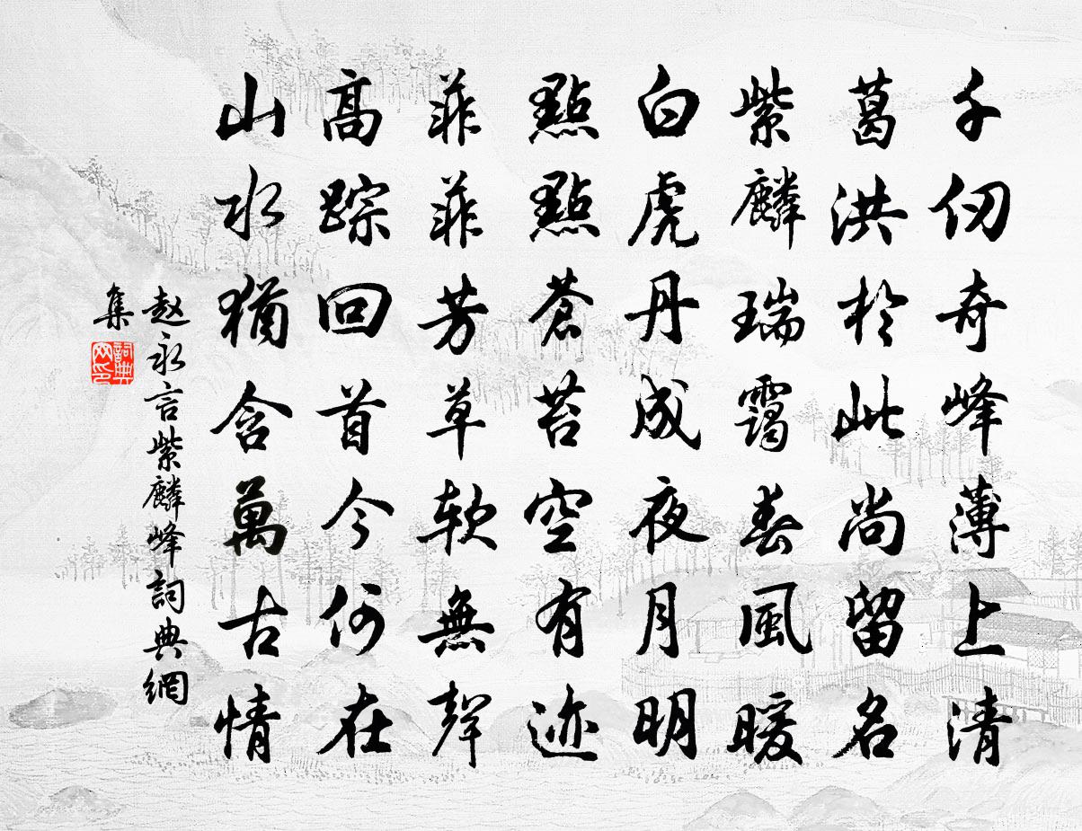 詩詞名句歷史字典書法欣賞書法字典國語詞典說文解字康熙字典古漢語字典標 題 作 者 詩 句 紫麟峰作者:趙永言 朝代:宋代紫麟峰原文千仞奇峰薄上清,葛洪於此尚留名。紫麟瑞靄春風暖,白1/1虎丹成夜月明。點點蒼苔空有跡,菲菲芳草軟無聲。高蹤回首今何在,山水猶含萬古情。詩詞問答問:紫麟峰的作者是誰?答:趙永言問:紫麟峰寫於哪個朝代?答:宋代趙永言紫麟峰書法欣賞紫麟峰書法作品詩詞推薦頌古七首釋祖璇〔宋代〕盡卻耳根並眼底,不知何處見如來。數聲幽鳥啼寒木,一片閒雲鋪斷崖。和沈祭酒韻虞儔〔宋代〕詩思花前發,春光眼底來。一區聊自適,三徑為誰開。聖主方求舊,清時況急才。鳳池波自暖,鷗鷺勿多猜。送洪維那釋普岩〔宋代〕知把虛空一口吞,髑髏瞥轉振乾坤。破沙盆月兒錄在,玉笛橫吹出海門。客窗夜雨林元卿〔宋代〕萬里辭家春復秋。異鄉何日夢刀頭。業如獻豕從渠笑,藝學屠龍只自羞。香盡一爐聞夜雨,燈殘半壁數更籌。斷腸潺潺閣婁乾曜〔宋代〕一派泠泠繞檻清,塵襟洗滌自涼生。夜深好夢才驚破,疑是半天風雨聲。沁園春戴復古〔宋代〕請賦林堂,林堂未成,吾何賦哉。想胸中丘壑,山中風月,亭台幾所,花木千栽。應接光陰,品題勝概,須待堂成哀虢縣令猶子箅張舜民〔宋代〕種瓜再摘覺瓜稀,不為衰年骨肉離。何事一哀還不哭,老人相別不多時。浣溪沙歐陽修〔宋代〕燈盡垂花月似霜。薄簾映月兩交光。酒醺紅粉自生香。雙手舞餘拖翠袖,一聲歌已釂金觴。休回嬌眼斷人腸。送錢承制赴廣西路分都監蘇軾〔宋代〕當年床我作表忠床碑,坐覺床江山氣未衰。舞鳳尚從天目下,收駒時有渥窪姿。踞床到處堪吹笛,橫槊何人解賦詩留簡伯俊范成大〔宋代〕我昔賦遠遊,萬里無親朋。惟君同懷抱,相從共茵憑。踰嶺穿瘴茅,捫參倚枯藤。隨行一瓶缽,澹如雲水僧。火馳務觀得曾吉甫茶反以詩見遺因次其韻周必大〔宋代〕詩仙餉予北苑雪,正欲一洗東華塵。道山廷尉俱夢事,喚醒野軒真主人。詩李嶠〔唐代〕都尉仙鳧遠,梁王駟馬來。扇中紈素制,機上錦紋回。天子三章傳,陳王七步才。緇衣久擅美,祖德信悠哉。太守林太博贈瑞香花劉克莊〔宋代〕幾點朝來小雨斜,未應造物妒山家。陡驚春報千林信,擬問天留數日花。寫物只今須老筆,染根何處有靈芽。彩雲永嘉雙蓮橋楊蟠〔宋代〕昨日採蓮者,雙雙橋畔新。舊花今不見,喜見似花人。所居三章章八句一章章十句洪皓〔宋代〕今我所居,圭竇蓽門。俯首折腰,如坐覆盆。終日譊譊,形弊神昏。死所未知,舊事誰諭。題象鼻岩張汝鍇〔宋代〕曾入蒼舒萬斛舟,至今鼻準蘸清流。君玉玉輅催行駕,安得身閒伴白鷺。題從叔述靈岩山壁孟郊〔唐代〕換卻世上心,獨起山中情。露衣涼且鮮,雲策高復輕。喜見夏日來,變為松景清。每將逍遙聽,不厭颼飀聲。遠念皇太后閣六首蘇軾〔宋代〕秘殿扶疏夏木深,雨余初有一蟬吟。應將嬴女乘鸞扇,更助南風長棘心。癸丑重九登山亭追懷頃在興元常以是日獵中梁陸游〔宋代〕生年六十九重陽,轍遍秦吳歲月長。南鄭從戎嗟尚壯,中梁縱獵最難忘。離披雉拂雕鞍墮,獨(左單人右束)狐穿白蓮楊億〔宋代〕昨夜三更里,嫦娥墜玉簪。馮夷不敢受,捧出碧波心。名句推薦穿針人在合歡樓,正月露、玉盤高瀉。嚴蕊《鵲橋仙·碧梧初出》 天地有正氣,雜然賦流形。文天祥《正氣歌》 黃鸝驚夢破,青鳥喚春還。張弘范《臨江仙·憶舊》 空將漢月出宮門,憶君清淚如鉛水。李賀《金銅仙人辭漢歌》 只應守寂寞,還掩故園扉。孟浩然《留別王侍御維 / 留別王維》 莫見長安行樂處,空令歲月易蹉跎。李頎《送魏萬之京》 順風而呼,聲非加疾也,而聞者彰。荀子《勸學》 與人不求備,檢身若不及佚名《尚書·商書·伊訓》 居善地,心善淵,與善仁,言善信,政善治,事善能,動善時。夫唯不爭,故無尤。老子《老子·道經·第八章》 桂林之一枝,崑山之片玉。房玄齡《晉書·列傳·第二十二章》