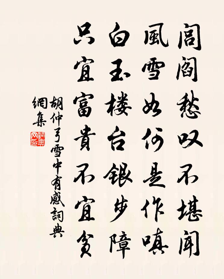 詩詞名句歷史字典書法欣賞書法字典國語詞典說文解字康熙字典古漢語字典標 題 作 者 詩 句 雪中有感作者:胡仲弓 朝代:宋代雪中有感原文閭閻愁嘆不堪聞,風雪如何是作嗔。白玉樓台銀步障,只宜富貴不宜貧。詩詞問答問:雪中有感的作者是誰?答:胡仲弓問:雪中有感寫於哪個朝代?答:宋代胡仲弓雪中有感書法欣賞雪中有感書法作品詩詞推薦貴溪尉廳黃梅盛開濃香豐艷非凡品可及尉坐此王洋〔宋代〕歌酬花意醉酬春,笑口相逢可厭頻。不飲正疑花怨客,黃衣莫聽婦傷貧。天生尤物非為福,蚌有明珠亦累身。牆裡出關寄賈島周賀〔唐代〕舊鄉無子孫,誰共老青門。迢遞早秋路,別離深夜村。伊流偕行客,岳響答啼猿。去後期招隱,何當復此言。明月引(和白雲趙宗簿自度曲·引令)陳允平〔宋代〕雨余芳草碧蕭蕭。暗春潮。盪雙橈。紫鳳青鸞,舊夢帶文簫。綽約佩環風不定,雲欲墮,六銖香,天外飄。相思為送耿處士賈島〔唐代〕一瓶離別酒,未盡即言行。萬水千山路,孤舟幾月程。川原秋色靜,蘆葦晚風鳴。迢遞不歸客,人傳虛隱名。渭南考室葛紹體〔宋代〕丞郎昔躬耕,懷野壟上宅。東湖一棹近,南畝耦夫百。風交苗懷新,雲鋪稼敷澤。疎欞翼虛堂,時焉此憩息。殷勤答裴送序意梅堯臣〔宋代〕我欲書之許子有書贈,為我書為學勿所偏。誠知子心苦愛我,欲我文字無不全。居常見我足吟詠,乃以述作為不然實弟以詩來督作會文又因太原侄寄聲欲作不速胡宏〔宋代〕苦參道難學,放肆事容易。入腳不可深,駸駸成自棄。九張機佚名〔宋代〕春衣。素絲染就已堪悲。塵世昏污無顏色。應同秋扇,從茲永棄。無復奉君時。禪人寫師真請贊釋慧遠〔宋代〕住飛來峰,飲冷泉水。倒用逆施,拈頭作尾。十字街頭擊鼓,五天印土吃茶。南北東西若稻麻。钁頭些子意,驗盡和丁端叔歲晚書懷楊萬里〔宋代〕嗟予不能知止如邴曼容,又不能畢昏如尚子平。軟紅塵裏白雙鬢,坐見歲律空崢嶸。催科撫字兩何有,伎倆巳窮慚禱晴方岳〔宋代〕曾幾何時屢乞晴,爐煙未斷已收聲。天於老子亦多可,國有豐年方太平。風土不堪人佩犢,月明無復夜啼鼪。及今詠貧士 其二陶淵明〔魏晉〕悽厲歲雲暮,擁褐曝前軒。南圃無遺秀,枯條盈北園。傾壺絕餘瀝,闚灶不見煙。詩書塞座外,日昃不遑研。閒居古詩贈新城王貽上錢謙益〔清代〕風輪持大地,擊揚為風謠。吹萬肇邃古,賡歌暢唐姚。朱弦泛漢魏,麗藻沿六朝。有唐盛詞賦,貞符匯元包。百靈挽叔祖戶部侍郎詩四首張鎡〔宋代〕小小如知已,常常說向人。論情宗族異,問事見聞新。囊錦將誰管,湖園看未真。傷心嘯庵路,不復送親賓。遺懷杜甫〔唐代〕愁眼看霜露,寒城菊自花。天風隨斷柳,客淚墮清笳。水淨樓陰直,山昏塞日斜。夜來歸鳥盡,啼殺後棲鴉。酬韋相公見寄貫休〔唐代〕鹽梅金鼎美調和,詩寄空林問訊多。秦客弈棋拋已久,楞嚴禪髓更無過。萬般如幻希先覺,一丈臨山且奈何。空諷再次前韻留黃縣尉二首項安世〔宋代〕郵亭別酒也須傾,底作匆匆向永明。蓮里青心猶有意,雨中紅日可無情。吾伊未了吾難出,子墨傅言子試評。回首方虛日斜再行宿烏山二首楊萬里〔宋代〕多稼村村過,垂楊店店迎。偶然逢客子,問得好山名。投宿欣猶早,斜陽落更明。僕人休進扇,得似晚風清。如占城經吳川極浦亭陳宜中〔宋代〕顛風吹雨過吳川,極浦亭前望遠天。有路可通環嶼外,無山堪並首陽巔。溪雲起處潮初長,夜月高時人未眠。異日旅思陸游〔宋代〕百病集殘骸,閒遊且散懹。旅裝如遠役,蔬食似長齋。買藥停山步,求醫過縣街。春寒殊未已,閉戶夜燃秸。名句推薦水隔淡煙修竹寺,路經疏雨落花村。楊徽之《寒食寄鄭起侍郎》 田野荒而倉廩實,百姓虛而府庫滿,夫是之謂國蹶。荀子《荀子·富國》 花隱掖垣暮,啾啾棲鳥過。杜甫《春宿左省》 劃然長嘯,草木震動,山鳴谷應,風起水涌蘇軾《後赤壁賦》 徒善不足以為政,徒法不能以自行。孟子《孟子·離婁章句上·第一節》 不恨古人吾不見,恨古人不見吾狂耳。辛棄疾《賀新郎·甚矣吾衰矣》 田家占氣候,共說此年豐。孟浩然《田家元日》 西風稍急喧窗竹,停又續,膩臉懸雙玉。閻選《河傳·秋雨》 明朝望鄉處,應見隴頭梅。宋之問《題大庾嶺北驛》 酒肆人間世,琴台日暮雲。杜甫《琴台》