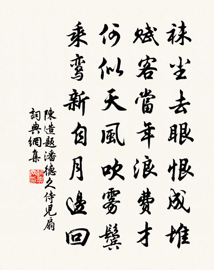 詩詞名句歷史字典書法欣賞書法字典國語詞典說文解字康熙字典古漢語字典標 題 作 者 詩 句 題潘德久侍兒扇作者:陳造 朝代:宋代題潘德久侍兒扇原文襪塵去眼恨成堆,賦客當年浪費才。何似天風吹霧鬢,乘鸞新自月邊回。詩詞問答問:題潘德久侍兒扇的作者是誰?答:陳造問:題潘德久侍兒扇寫於哪個朝代?答:宋代陳造題潘德久侍兒扇書法欣賞題潘德久侍兒扇書法作品詩詞推薦孤山寺遇雨白居易〔唐代〕拂波雲色重,灑葉雨聲繁。水鷺雙飛起,風荷一向翻。空濛連北岸,蕭颯入東軒。或擬湖中宿,留船在寺門。苦吟楊萬里〔宋代〕蟻無秋衣鴈有喪,霜天謀食各自愁。鴈聲寒死叫不歇,蟻膝凍僵行復休。先生苦吟日色晚,老鈴來催吃朝飯。小兒游九鯉湖陳乘〔唐代〕汗漫乘春至,林巒霧雨生。洞莓黏屐重,岩雪濺衣輕。窟宅分三島,煙霞接五城。卻憐饒藥物,欲辨不知名。夜行船(送胡彥直歸槐溪)趙長卿〔宋代〕淚眼江頭看錦樹。別離又還秋暮。細水浮浮,輕風冉冉,穩送扁舟去。歸去江山應得助。新詩定須多賦。有雁南來千秋歲引·秋景王安石〔宋代〕別館寒砧,孤城畫角, 一派秋聲入寥廓。 東歸燕從海上去,南來雁向沙頭落。 楚颱風,庾樓月,宛如昨。 汾陽諸公招徐祥叔歸代之答謝何夢桂〔宋代〕澗陵望斷憶玄暉,一片春雲渭水涯。洞裡桃開成隔世,山中柯爛忘來時。歸休曲應無賴,隱去玄真那有詩。松菊相送李緗盧綸〔唐代〕舊國仍連五將營,儒衣何處謁公卿。波翻遠水蒹葭動,路入寒村機杼鳴。嵇康書論多歸興,謝氏家風有學名。為問點絳唇(周園分題得湖上聞樂)佚名〔宋代〕紫霧香濃,翠華風轉花隨輦。洞天雲暖。一片笙歌遠。水展龍舟,憶侍瑤池宴。閒庭院。夢回春半。雪鬢無人見。重戲贈白居易〔唐代〕集賢池館從他盛,履道林亭勿自輕。往往歸來嫌窄小,年年為主莫無情。昔昔鹽二十首。那能惜馬蹄趙嘏〔唐代〕雲中路杳杳,江畔草淒淒。妾久垂珠淚,君何惜馬蹄。邊風悲曉角,營月怨春鼙。未道休徵戰,愁眉又復低。賦惠計院允堂吳潛〔宋代〕荊溪惠子鬢鬅鬙,義理鑽研到粹精。允以名堂由意實,漫雲從仕但心亨。一窗春草無窮意,四壁秋蛩不斷聲。若向村田樂祭社圖王冕〔元代〕春風吹晴杏花雨,東村西村鳴社鼓。長旂翩翩導前路,樂舞于于成隊伍。冠帶郎君顏貌古,插竹簪花相媚嫵。可是農家釋文珦〔宋代〕繞屋桑麻槿作籬,當門一樹白薔薇。老翁請喚牛醫至,穉子鞭攔鴨陣歸。賽願酒豐同飲福,輸官絹足各裁衣。年年頌古九十八首釋印肅〔宋代〕風舞岩松人不會,謾施巧便轉惛惶。徹夜為伊堅不信,未知何劫肯承當。□蒼天蒼天。張先生蘇軾〔宋代〕孰視空堂竟不言,故應知我未天全。肯來傅舍人皆說,能致先生子亦賢。脫屣不妨眠糞屋,流澌爭看浴冰川。士廉送鄭舜舉赴闕陳棣〔宋代〕備員無補見絲毫,幸喜為官似馬曹。每許蕪音持布鼓,更容劣技試鉛刀。兼收屢賜百金諾,借重終期一字褒。廊廟重寄潘豳老賀鑄〔宋代〕輕舠驀水帆如弓,一伸臂頃來江東。聊持美酒致吾子,方事彩衣娛汝翁。懸榻可容它客坐,閉關正與無月同。夙興浪淘沙(述懷)曹冠〔宋代〕清介百無求。民瘼懷憂。席珍藏器效前修。自負平戎經國略,壯氣橫秋。二紀嘆淹留。尋壑經丘。醉吟適意且遨遊讀家集吳龍翰〔宋代〕吾家友堂翁,硯影雙鬢寒。刻志鑽書史,篝燈照夜闌。學術三代上,文章兩漢間。胸次秋沆瀣,詞吐玉琅玕。冤哉次韻鑒中八詠於石〔宋代〕驅車曉行邁,行行出郊郭。斷岡屹崇墉,虛籟殷靈壑。雨深瑤草長,風定松花落。西山有爽氣,逍遙倚晴閣。名句推薦成事享其功,敗事委其過,且聖人弗能逾者,概人之本然也。來俊臣《羅織經·閱人卷第一》 深居俯夾城,春去夏猶清。李商隱《晚晴》 專勝者未必克,挾疑者未必敗。范曄《後漢書·列傳·烏桓鮮卑列傳》 魚網之設,鴻則罹其中;螳螂之貪,雀又乘其後。洪應明《菜根譚·概論》 獨倚畫欄如有意,清砧怨笛送黃昏。曹雪芹《詠白海棠》 野曠天清無戰聲,四萬義軍同日死。杜甫《悲陳陶》 思君如流水,何有窮已時。徐幹《室思》 煙籠寒水月籠沙,夜泊秦淮近酒家。杜牧《泊秦淮》 呼兒將出換美酒,與爾同銷萬古愁。李白《將進酒》 裊裊城邊柳,青青陌上桑。張仲素《春閨思》