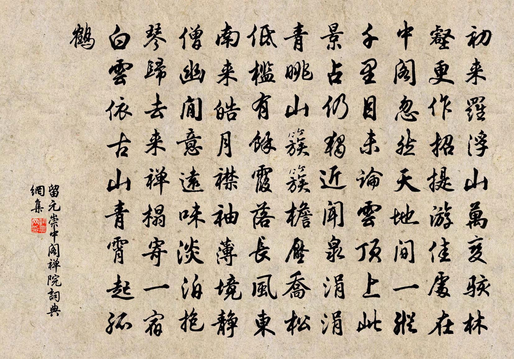 詩詞名句歷史字典書法欣賞書法字典國語詞典說文解字康熙字典古漢語字典標 題 作 者 詩 句 中閣禪院作者:留元崇 朝代:宋代中閣禪院原文初來羅浮山,萬變駭林壑。更作招提游,佳處在中閣。忽然天地間,一縱千里目。未論雲頂上,此景占仍獨。近聞泉涓涓,青眺山簇簇。檐壓喬松低。檻有餘霞落。長風東南來,皓月襟袖薄。境靜僧幽閒,意遠味淡泊。抱琴歸去來,禪榻寄一宿。白雲依古山,青霄起孤鶴。詩詞問答問:中閣禪院的作者是誰?答:留元崇問:中閣禪院寫於哪個朝代?答:宋代留元崇中閣禪院書法欣賞中閣禪院書法作品詩詞推薦嘉熙己亥大旱荒庚子夏麥熟戴復古〔宋代〕旱潦並為虐,三農哭歲飢。當秋谷價貴,出廣米船稀。救死知吾拙,謀生恐計非。固窮君子事,辦采北山薇。寓筆釋紹嵩〔宋代〕幽徑草初青,無人知地名。征鞍千里遠,倚杖一江橫。雲重欲為雨,風和拗得晴。家家好春色,春色遍空明。武肅王有旨石橋設齋會進一詩釋延壽〔宋代〕凌晨迎請倍精誠,親敬鮮花異處清。羅漢攀枝呈梵相,岩僧倚樹現真形。神幡雙出紅霞動,寶塔全開白氣生。都為富東山海師文同〔宋代〕上人者何人,富樂之禪客。成都昔嘗見,時已坐法席。別來二十年,嗟此出處隔。昨過芙蓉溪,舍楫得攜策。盤盤山中遣興五首李流謙〔宋代〕遊宦初聊爾,歸來亦暢然。低回簿領縛,慚愧斗升牽。元亮八十日,哥奴十九年。人生重名節,富貴疾雲煙。再和趙知錄韻三首吳潛〔宋代〕何煩洛令市私恩,有客甘貧自閉門。恰似明州前錄事,清高直可傲羲軒。鸚鵡曲 處士虛名馮子振〔元代〕高人誰戀朝中住。自古便有個巢父。子陵灘釣得虛名,幾度桐江春雨。睡神仙別有陳摶,拂袖華山歸去。漫紛紛少漢上題韋氏莊岑參〔唐代〕結茅聞楚客,卜築漢江邊。日落數歸鳥,夜深聞扣舷。水痕侵岸柳,山翠借廚煙。調笑提筐婦,春來蠶幾眠。偈頌一百三十六首釋惟一〔宋代〕九秋強半,不寒不暖。風細細雨霏霏,水冷冷雲淡淡。一棹煙波,蘆花兩岸。浪跡陸游〔宋代〕浪跡人間四十年,鏡中不覺已華顛。山川慘澹秋多感,燈火青熒夜少眠。壯志已忘榆塞外,高情正在酒壚邊。扁舟孫威敏公輓辭王安石〔宋代〕功名一世事,興廢豈人謀。重為蒼生起,終隨逝水流。淒涼歸部曲,零落掩山丘。許國言猶在,奸諛可使羞。和寄天選長官道潛〔宋代〕寓形宇宙間,佚我方以老。流光安足恃,百歲同過鳥。頃子縈網羅,文采緣自表。自古山林人,何曾識機巧。但記有叟陸游〔宋代〕有叟鏡湖邊,茆茨 * 椽。憑闌秋萬里,閉戶醉經年。身外浮名小,胸中浩氣全。此生吾自判,造物恐無權。再次韻四首陳造〔宋代〕到眼浪岐官冷熱,遇人傳得酒逡巡。曼容東老俱通夢,不勸趨榮勸養神。三登樂范成大〔宋代〕一碧鱗鱗,橫萬里、天垂吳楚。四無人、櫓聲自語。向浮雲、西下處,水村煙樹。何處繫船,暮濤漲浦。正江南、行香子 木去金王吉昌〔元代〕木隱金形,金色浮存。木森森、有像稱尊。全憑火力,逗引遊魂。自客先還,獨存主,各歸根。去住*分,性命雲寄新息家叔陳與義〔宋代〕風雨淮西夢,危魂費九升。一官遮日手,兩地讀書燈。見客深藏舌,吟詩不負丞。竹林雖有約,門戶要人興。泛江鄧肅〔宋代〕風回浪急月初圓,攜得魚竿下釣船。自是高歌星斗上,不須騎氣夜行天。泊秦淮杜牧〔唐代〕煙籠寒水月籠沙,夜泊秦淮近酒家。商女不知亡國恨,隔江猶唱後庭花。七十翁五言十首方回〔宋代〕豈謂真成老,元來總墮虛。它鄉身似雁,永夜眼如魚。未覺知幾早,惟嫌料事疏。縱無三閣饌,猶有五車書。名句推薦停車坐愛楓林晚,霜葉紅於二月花。杜牧《山行》 哀哀父母,生我勞瘁。佚名《蓼莪》 黃華自與西風約,白髮先從遠客生。元好問《秋懷》 明妃留在兩眉愁,萬古春山顰不盡元好問《玉樓春·驚沙獵獵風成陣》 好問則裕,自用則小。佚名《尚書正義·卷八·仲虺之誥》 弓背霞明劍照霜,秋風走馬出鹹陽。令狐楚《少年行四首·其三》 中秋誰與共孤光。把盞悽然北望。蘇軾《西江月·世事一場大夢》 登臨送目,正故國晚秋,天氣初肅。王安石《桂枝香·登臨送目》 一春略無十日晴,處處浮雲將雨行。汪藻《春日·一春略無十日晴》 殘螢棲玉露,早雁拂金河。許渾《早秋三首·其一》