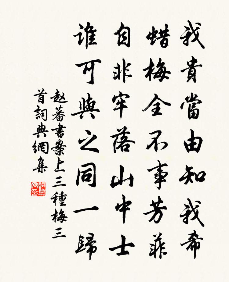 詩詞名句歷史字典書法欣賞書法字典國語詞典說文解字康熙字典古漢語字典標 題 作 者 詩 句 書案上三種梅三首作者:趙蕃 朝代:宋代書案上三種梅三首原文我貴當由知我希,蠟梅全不事芳菲。自非牢落山中士,誰可與之同一歸。詩詞問答問:書案上三種梅三首的作者是誰?答:趙蕃問:書案上三種梅三首寫於哪個朝代?答:宋代趙蕃書案上三種梅三首書法欣賞書案上三種梅三首書法作品詩詞推薦重九獨酌次偶成數韻呈江司法李帳乾並同游諸曾豐〔宋代〕孫盛龍山集,劉洪鳳嶺游。孰非陪好客,俱不負高秋。白髮與時背,清風勸我休。黃花嬌媚意,喜上少年頭。詠史詩隴西胡曾〔唐代〕乘春來到隴山西,隗氏城荒碧草齊。好笑王元不量力,函關那受一丸泥。木蘭花令(當塗解印後一日,郡中置酒,呈郭功甫)黃庭堅〔宋代〕凌歊台上青青麥。姑熟堂前余翰墨。暫分一印管江山,稍為諸公分皂白。江山依舊雲空碧。昨日主人今日客。誰分別蕭挺之泉州二首楊萬里〔宋代〕八葉今成九,一枝誰敢雙?野人應補外,賢者亦為邦。夾岸梅臨水,孤帆雪涌江。別愁才半掬,不遣我心降。送水雲歸吳孔清真〔宋代〕瘦馬長吟蹇驢吼,坐聽三軍擊刁斗。歸人鞍馬不須忙,為我更釂葡萄酒。壽魏鶴山吳泳〔宋代〕人生瀛海內,中氣胚腪之。真元會清淑,間代儲英奇。扶搖六月息,濯羽於鹹池。冰壺貯虛明,璧玉含清輝。阿閣古意王銍〔宋代〕茅檐祠秀色,從古嘆不遭。遊子去未返,徒使寸心勞。朝嘆江海深,夜視星斗高。歸期約春風,今已木葉凋。一日野望陳師道〔宋代〕山開兩岸柳,水遶數家村。地勢傾崖口,風濤齧石根。平林霜著色,沙岸水留痕。剩寄還鄉泣,難招去國魂。和高簿送梅王志道〔宋代〕遠望青山兩髻丫,水紋風細縐如紗。不知遊冶誰家子,也卷黃蘆學塞笳。偈頌七十六首釋師觀〔宋代〕咄這尊慈,口甜心苦。帶累我儂,破家盪戶。者僧話墮處,直下明明舉。一炷栴檀充宇宙,誰道黃金如糞土。重送文處厚,因寄蜀父老三首范成大〔宋代〕灌口江源不斷流,峨眉山月幾番秋。江山好處吾能記,為問江山記客否?寄吳沖卿王安石〔宋代〕物變極萬殊,心通才一曲。讀書謂已多,撫事知不足。與君語承華,念此非不夙。恨無數頃田,歸耕使成熟。當官上耿泉生朝楊簡〔宋代〕江左矜刑,獄平訟清。惟清惟明,民用以寧,奸宄亦懲。贈織錦人李詢〔唐代〕札札機聲曉復晡,眼穿力盡竟何如。美人一曲成千賜,心裡猶嫌花樣疏。唐舊讖佚名〔唐代〕兔子上金床。側犯楊 * 〔宋代〕九衢艷質,看來怎比他閒靚。清韻。似照水橫斜暮臨鏡。林間頓畫閣,花底藏芳徑。幽靜。將絳燭、高燒照雙影。移家別湖上亭戎昱〔唐代〕好是春風湖上亭,柳條藤蔓系離情。黃鶯久住渾相識,欲別頻啼四五聲。靈壁驛有方公美少卿留題戲和於壁鄭剛中〔宋代〕君把使旌臨洛水,我參樞幕過潼關。秋風想見吹歸渡,先看淮南第一山。與倪老伯輝九曲池有懷元龍參寥秦觀〔宋代〕雲月娟娟淮海秋,隋家池上共浮游。可憐一段風流事,特欠支郎與子猷。辭粟操王令〔宋代〕食子之粟,飽復何為。當人之賜,罪亦何辭。有以我為是兮,豈無以我為非。已兮已兮,吾何以勝人之言兮。名句推薦怒猊抉石,渴驥奔泉宋祁、歐陽修、范鎮、呂夏卿等《新唐書·列傳·卷八十五》 湖清霜鏡曉,濤白雪山來。李白《送友人尋越中山水》 日歸功未建,時往歲載陰。陸機《猛虎行》 幸災不仁,乘危不武張廷玉《明史·列傳·卷一百三十六》 聽君一席話,勝讀十年書。佚名《增廣賢文·上集》 偷彈清淚寄煙波,見江頭故人,為言憔悴如許。袁去華《劍器近·夜來雨》 我有所念人,隔在遠遠鄉。白居易《夜雨》 廢一善,則眾善衰。賞一惡,則眾惡歸。黃石公《三略·下略》 呼兒將出換美酒,與爾同銷萬古愁。李白《將進酒》 傷心枕上三更雨,點滴霖霪。李清照《添字醜奴兒·窗前誰種芭蕉樹》