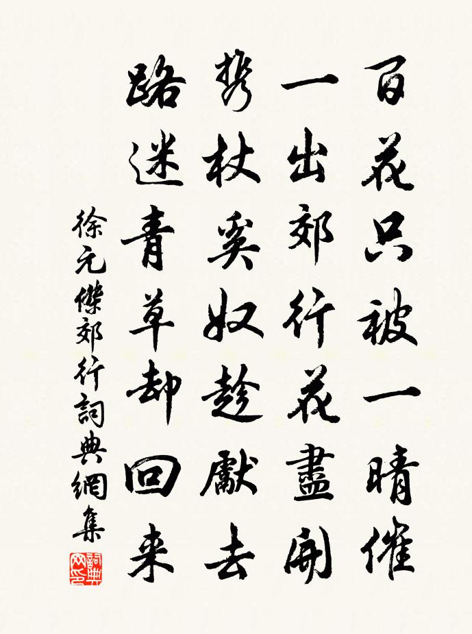 詩詞名句歷史字典書法欣賞書法字典國語詞典說文解字康熙字典古漢語字典標 題 作 者 詩 句 郊行作者:徐元傑 朝代:宋代郊行原文百花只被一晴催,一出郊行花盡開。攜杖奚奴趁先去,路迷青草卻回來。詩詞問答問:郊行的作者是誰?答:徐元傑問:郊行寫於哪個朝代?答:宋代徐元傑郊行書法欣賞郊行書法作品詩詞推薦句辛棄疾〔宋代〕身為參禪老,家因赴詔貧。句滕岑〔宋代〕苔痕遺鳥爪,菊本寄蛩音。詩陸機〔魏晉〕瓮余殘酒。膝有橫琴。元日平江作陳藻〔宋代〕草粿京糰要賀年,玉融風俗不同天。元正犯醉長洲市,又憶浮家厭海鮮。寒食相將諸子游翟得園十詩楊萬里〔宋代〕柳條老去尚青鮮,下有清渠遶野田。波面落花相趁走,避風爭泊岸傍邊。三疊劉克莊〔宋代〕早知粉黛非真色,晚覺雕鐫損自然。天巧千林均一氣,人痴一葉費三年。贈進賢劉令陸游〔宋代〕簿領塵埃里,超然見鳳麟。性疏忘顧忌,學大有經綸。正論雖頻接,高標豈易親。向來相識晚,吾黨欠斯人。趙令晏崔白大圖幅徑三丈蘇軾〔宋代〕扶桑大繭如瓮盎,天女織綃雲漢上。往來不遣鳳銜梭,誰能鼓臂投三丈。人間刀尺不敢裁,丹青付與濠梁崔。風蒲送苗推官釋遵式〔宋代〕官滿載琴書,乘春入上都。煙波離遠岸,桃李發中途。俸薄尊常淺,詩清道太孤。登朝無恨晚,未有白髭鬚。李寅之招飲同登九江城方回〔宋代〕清湍嚴子灘,僻塢任公寺。荒涼茅屋居,蹇淺石田蒔。危蹤璧偶完,暮景駕已稅。閒門幸常關,奧帙尚多味。七夕南定樓飲同官魏了翁〔宋代〕誰將明星貼天定,州國宮垣象官府。更將四七隨天旋,常以昏中殷四序。迢迢河漢沖秋旻,前有蒼龍履玄武。牽牛競渡元稹〔唐代〕吾觀競舟子,因測大競源。天地昔將競,蓬勃晝夜昏。龍蛇相嗔薄,海岱俱崩奔。群動皆攪撓,化作流渾渾。數極品令呂渭老〔宋代〕繡衣未整。傍窗格、臨清鏡。新霜薄霧,這下幾日,陰晴不定。欲插黃花,心事又還記省。去年香徑。共粉蝶、閒桃源行王景月〔宋代〕秦皇有地包沙漠,秦民無地堪托足。民心咫尺不戴秦,秦令安能到空谷。商山紫芝青門瓜,武陵洞底栽桃花。草木和主司王起(一作和主司酬周侍郎)林滋〔唐代〕龍門一變荷生成,況是三傳不朽名。美譽早聞喧北闕,頹波今見走東瀛。鴛行既接參差影,雞樹仍同次第榮。從此上越州楊嚴中丞方乾〔唐代〕連枝棣萼世無雙,未秉鴻鈞擁大邦。折桂早聞推獨步,分憂暫輟過重江。晴尋鳳沼雲中樹,思繞稽山枕上窗。試把除日/除夜朱淑真〔宋代〕爆竹聲中臘已殘,紺酥酒暖燭花寒。朦朧曉色籠春色,便覺風光不一般。詠史下慕容恪陳普〔宋代〕霜雹風沙雜亂飛,段龕地下見春歸。時來但處周公位,歷舉華人百世希。秋夜齋中陸游〔宋代〕木落煙深江上村,暮秋蕭瑟不堪論。雁如著意頻驚枕,月似知愁故入門。營道數峰新石友,廣陵一曲古桐孫。亦知次韻感春五首黃庭堅〔宋代〕鳥聲春漸長,煙雨春薄暮。風光不長妍,如客暫時寓。芸芸物爭時,天地有常度。我行睹大河,黃流日東騖。喟然名句推薦竹竿有甘苦,我愛抱苦節。孟郊《苦寒吟》 積學以儲寶,酌理以富才劉勰《文心雕龍·神思》 師嚴然後道尊,道尊然後民知敬學。戴聖《禮記·學記》 猶有遺簪,不展秋心,能卷幾多炎熱。張炎《疏影·詠荷葉》 名利之不宜得者竟得之,福終為禍;困窮之最難耐者能耐之,苦定回甘。王永彬《圍爐夜話·第十則》 牛困人飢日已高,市南門外泥中歇。白居易《賣炭翁》 莫嫌白髮不思量,也須有、思量去里。辛棄疾《鵲橋仙·送粉卿行》 鳧脛雖短,續之則憂;鶴脛雖長,斷之則悲。莊子《莊子·外篇·駢拇》 秋風吹地百草乾,華容碧影生晚寒。李賀《開愁歌》 黃埃散漫風蕭索,雲棧縈紆登劍閣。白居易《長恨歌》