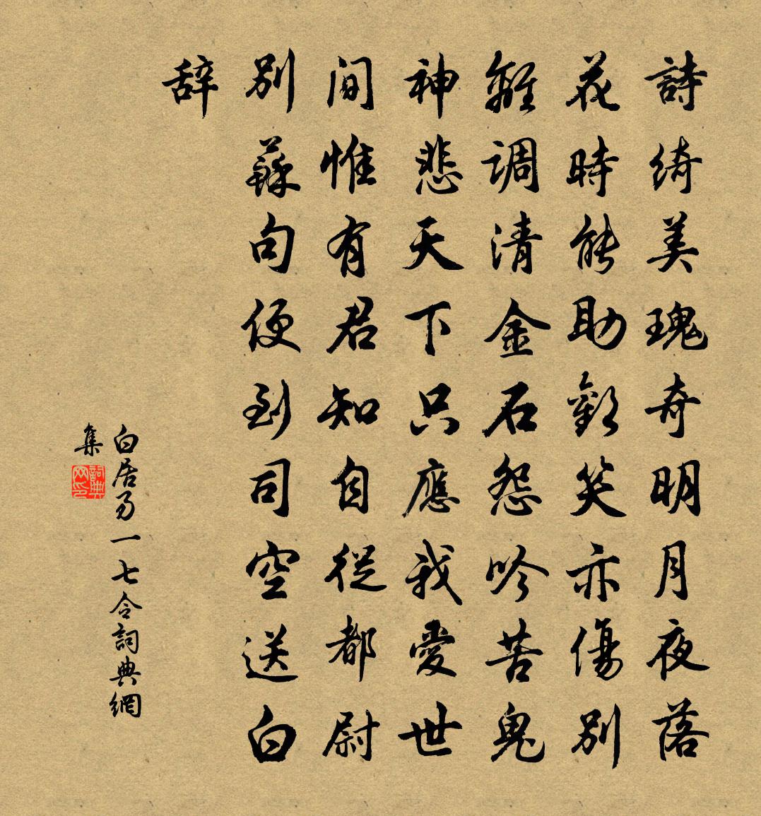 詩詞名句歷史字典書法欣賞書法字典國語詞典說文解字康熙字典古漢語字典標 題 作 者 詩 句 一七令作者:白居易 朝代:唐代一七令原文詩,綺美,瑰奇。明月夜,落花時。能助歡笑,亦傷別離。調清金石怨,吟苦鬼神悲。天下只應我愛,世間惟有君知。自從都尉別蘇句,便到司空送白辭。詩詞問答問:一七令的作者是誰?答:白居易問:一七令寫於哪個朝代?答:唐代問:一七令是什麼體裁?答:雜言問:白居易的名句有哪些?答:白居易名句大全白居易一七令書法欣賞一七令書法作品詩詞推薦秋日次前輩新年韻陸游〔宋代〕殘年垂九十,雲鬢不勝繁。賣屨糴炊米,典衣租廢園。山深雲滿屋,夜靜月當門。鄰曲時相過,扶行賴稚孫。詩狂楊公遠〔宋代〕掬取長江供硯水,借將碧漢作蠻箋。興來拈起如椽筆,大詠高吟欲上天。杭州訪吉祥璘上人追感蘇才翁同賞牡丹蔡襄〔宋代〕曾乘春飲繞花畦,花底余香入燕泥。剪處佳人傳燭下,歸時明月到雲西。重來草樹驚秋色,零落交朋感舊題。若使題自畫蘆雁李膺仲〔宋代〕晚來無事理扁舟,喚起騷人漫浪愁。過眼飛鴻三兩字,淡煙寒日荻花秋。句釋居昱〔宋代〕松聲和雨聽,山色帶雲看。越中遇寒食施肩吾〔唐代〕去歲清明霅溪口,今朝寒食鏡湖西。信知天地心不易,還有子規依舊啼。潘大臨蓮池二首張耒〔宋代〕避暑人人得自怡,坐曹最苦劇囚累。江邊金石焦流日,堂上糟漿酷烈時。一酌甘寒煩素綆,終朝揮拂倦蒲葵。誰知送魯玉太博輓詞三首梅堯臣〔宋代〕自昔稱王謝,於今亦盛門。尚看珠樹秀,應見玉麟存。書史辛勤學,文章苦死論。都然莫施設,恨尚九原吞。過三山寺唐彥謙〔唐代〕三山江上寺,宮殿望岧嶢。石徑侵高樹,沙灘半種苗。一僧歸晚日,群鷺宿寒潮。遙聽風鈴語,興亡話六朝。游齊山趙蕃〔宋代〕借馬訪齊山,奔行不待銜。舊來聞若渴,今日嗜如饞。故喜地殊勝,卻嫌僧近凡。誰能一除洗,更出萬嵌岩。松竹間釋文珦〔宋代〕瘦竹老松間,閒房僅容膝。棲遲非一朝,謝遣用三術。泉落雙澗清,雲消從山出。誰能強予遷,愛此成痼疾。同子肅過玉汝飲題玉汝壁二首趙蕃〔宋代〕晚日雖雲短,故情能爾長。杯行要陶寫,賦就復淒涼。此別會不免,有懷寧遽忘。明當視清鏡,應已變蒼蒼。詰貓劉琰〔宋代〕古人養客乏車魚,今汝何功客不如。飯有溪魚眠有毯,忍教鼠齧案頭書。婢態万俟紹之〔宋代〕才入園中便折花,廚頭坐語是生涯。不時掐數週年限,每事誇稱舊主家。遷怒故將甌碗擲,俲{左目右賓}剛借粉句王隨〔宋代〕印苔多鶴跡,題壁半僧名。虞美人崔木〔宋代〕春來秋往何時了。心事知多少。深深庭院悄無人。獨自行來獨坐、若為情。雙旌聲勢雖雲貴。終是誰存濟。今宵已賜陳摶宋太宗〔宋代〕曾向前朝出白雲,後來訊息杳無聞。如今若肯隨徵召,總把三峰乞與君。送李道士文同〔宋代〕先生若孤雲,兩在隆山見。清標瘦彌聳,秀骨老愈健。高談吐深詣,大句寫精鏈。忽起憶鵝池,肏飛石泉濺。答謝法曹劉克莊〔宋代〕二詩簡澹掃穠華,作者幾無以復加。璧十五城方定價,桃三千歲一開花。選騷意度卑唐體,晉宋文章讓謝家。莫道臨江仙·滾滾長江東逝水楊慎〔明代〕滾滾長江東逝水,浪花淘盡英雄。是非成敗轉頭空。青山依舊在,幾度夕陽紅。白髮漁樵江渚上,慣看秋月春風。名句推薦傷心千里江南,怨曲重招,斷魂在否?吳文英《鶯啼序·春晚感懷》 一曲陽關,斷腸聲盡,獨自憑蘭橈柳永《少年游·參差煙樹灞陵橋》 情似遊絲,人如飛絮。淚珠閣定空相覷。周紫芝《踏莎行·情似遊絲》 黃鸝驚夢破,青鳥喚春還。張弘范《臨江仙·憶舊》 話說多,不如少。惟其是,勿佞巧。李毓秀《弟子規·信》 落花夜雨辭寒食。塵香明日城南陌。吳文英《菩薩蠻·落花夜雨辭寒食》 蛛絲暗鎖紅樓,燕子穿簾處。吳文英《荔枝香近·七夕》 落木千山天遠大,澄江一道月分明。黃庭堅《登快閣》 說法者無法可說。是名說法。鳩摩羅什譯《金剛經·非說所說》 千里澄江似練,翠峰如簇。王安石《桂枝香·登臨送目》