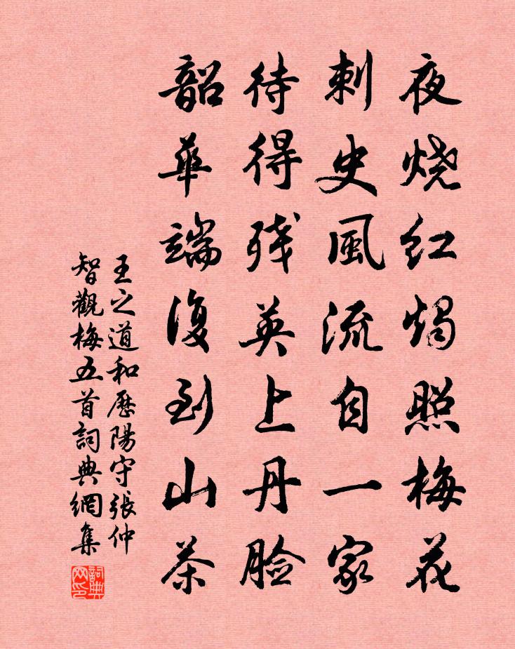 詩詞名句歷史字典書法欣賞書法字典國語詞典說文解字康熙字典古漢語字典標 題 作 者 詩 句 和歷陽守張仲智觀梅五首作者:王之道 朝代:宋代和歷陽守張仲智觀梅五首原文夜燒紅燭照梅花,刺史風流自一家。待得殘英上丹臉,韶華端復到山茶。詩詞問答問:和歷陽守張仲智觀梅五首的作者是誰?答:王之道問:和歷陽守張仲智觀梅五首寫於哪個朝代?答:宋代王之道和歷陽守張仲智觀梅五首書法欣賞和歷陽守張仲智觀梅五首書法作品詩詞推薦古意吳少微〔唐代〕洛陽芳樹向春開,洛陽女兒平旦來。流車走馬紛相催,折芳瑤華向曲台。曲台自有千萬行,重花累葉間垂楊。北林句袁樞〔宋代〕溫黃前後並,殿下不須行。句蘇郁〔唐代〕吟倚雨殘樹,月收山下村。以新涼入郊墟為韻簡葉孟我丈陳耆卿〔宋代〕警夜聽鳴蛩,聒午聞啼醬。不知誰使令,萬態俱悠揚。宋玉辯已非,歐陽賦何忙。正念有冰壺,日日如此涼。偈頌一百零一首釋慧性〔宋代〕喝散白雲,穿開碧落。須彌燈王,無處摸索。簡周允升三首趙蕃〔宋代〕相逢亡恙外,第一問書堂。為說當年樹,如人出屋長。塞鴻秋·代人作貫雲石〔元代〕戰西風遙天幾點賓鴻至,感起我南朝千古傷心事。展花箋欲寫幾句知心事,空教我停霜毫半晌無才思。往常得興時頌證道歌證道歌釋印肅〔宋代〕河沙如來同共證,光光相徹無餘剩。各申右手摩其頂,龍天萬億鹹歸命。桂林歲晚憶鍾尚書樂雷發〔宋代〕塵滿湘翁薜荔衣,江湖歲晚鬢成絲。桂州楊五今何處,雪片梅花枉費詩。送錢拾遺歸兼寄劉校書郎士元〔唐代〕墟落歲陰暮,桑榆煙景昏。蟬聲靜空館,雨色隔秋原。歸客不可望,悠然林外村。終當報芸閣,攜手醉柴門。送唐次武元衡〔唐代〕都門去馬嘶,灞水春流淺。青槐驛路長,白日離尊晚。望望煙景微,草色行人遠。句李廌〔宋代〕安得吾皇四百州,皆如此邦二千石。次韻梅山弟醉吟七首陳著〔宋代〕隱處是甪里先生,放游是司馬子長。試問梅山老居士,判斷兩家誰最香。句蘇紳〔宋代〕一篇此日摛鴻藻,五色它年浴鳳文。謝伯淳察院用先生不是打乖人邵雍〔宋代〕經綸事業須才者,燮理功夫有巨臣。安樂窩中閒偃仰,為知不是打乖人。和張判官登萬山亭,因贈洪府都督韓公孟浩然〔唐代〕韓公是襄士,日賞城西岑。結構意不淺,岩潭趣轉深。皇華一動詠,荊國幾謠吟。舊徑蘭勿剪,新堤柳欲陰。砌傍虞察院生日姜特立〔宋代〕自輟清班素望崇,凜然爭仰柏颱風。大奸鉅猾宜深屏,且避當年御史驄。和范景仁王景彝殿中雜題三十八首並次韻其三梅堯臣〔宋代〕玉幾常中寶作床,無端絮惹御袍香。群公唱第魚龍化,列侍金階若堵牆。賀尤禮侍兼修史侍講直學士院四首張鎡〔宋代〕斯文未搖落,右序啟哲人。胸中悟復悟,筆底新又新。幻為九色絲,鑾坡演明綸。兵民總疲羸,夜直煩前陳。又送劉著作文同〔宋代〕北地戎馬後,凋殘今幾年。邊民此天幸,縣令若君賢。況自儲蓄久,定知摩撫全。好須圖善政,能為作詩傳。名句推薦知賢之為明,輔賢之謂能,勉之強之,其福必長。荀子《荀子·解蔽》 鎮日無心掃黛眉。臨行愁見理征衣。夏竦《鷓鴣天·鎮日無心掃黛眉》 驪山語罷清宵半,淚雨霖鈴終不怨。納蘭性德《木蘭詞·擬古決絕詞柬友》 開花必早落,桃李不如松。李白《箜篌謠》 奇卓異非至人,至人只是常。洪應明《菜根譚·概論》 溪上桃花無數,花上有黃鸝。黃庭堅《水調歌頭·遊覽》 凡出言,信為先。詐與妄,奚可焉?李毓秀《弟子規·信》 斜陽獨倚西樓。遙山恰對簾鉤。晏殊《清平樂·紅箋小字》 白日何短短,百年苦易滿。李白《短歌行》 飛花兩岸照船紅,百里榆堤半日風。陳與義《襄邑道中》