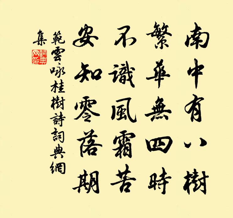 詩詞名句歷史字典書法欣賞書法字典國語詞典說文解字康熙字典古漢語字典標 題 作 者 詩 句 詠桂樹詩作者:范雲 朝代:南北朝詠桂樹詩原文南中有八樹,繁華無四時。不識風霜苦,安知零落期。詩詞問答問:詠桂樹詩的作者是誰?答:范雲問:詠桂樹詩寫於哪個朝代?答:南北朝范雲詠桂樹詩書法欣賞詠桂樹詩書法作品詩文賞析開頭兩句,詩人用直而概括的筆觸,描繪了南國桂樹的風采。“八樹”者,原指月宮中的桂花樹。 詩的未兩句,用擬人化手法,道出桂樹四時繁華的原委:因為不畏風霜雨雪的摧殘,所以也就不會有凋零衰敗的日子。 詩詞推薦與子仁登天柱岡,過胡家塘蒪塘歸東園四首楊萬里〔宋代〕胡床腳底萬峰寒,拄杖錐尖亂蘇班。天柱岡頭行未刨,相攜更上一重山。寄潘文叔劉過〔宋代〕不隨千騎過維揚,夜泫關山卻一航。臭味偶同貧更好,功名有志老何傷。自甘商皓來東閣,敢怨陳登臥 * 。俗擊偈頌一百一十七首釋紹曇〔宋代〕航海而來,而壁而坐。未明直指單傳,先被梁王勘破。當門齒露風,只履歸何早。熊耳峰前,累累荒草,至今惹得麟趾殿侍宴應制宋之問〔唐代〕北闕層城峻,西宮復道懸。乘輿歷萬戶,置酒望三川。花柳含丹日,山河入綺筵。欲知陪賞處,空外有飛煙。江上居寄山中客李頻〔唐代〕山後與山前,相思隔叫猿。殘雲收樹末,返照落江源。苦雨秋濤漲,狂風野火翻。朝來賣藥客,遇我達無言。元日梅堯臣〔宋代〕昔遇風雪時,孤舟泊吳埭。江潮未應浦,盡室坐相對。行庖得海物,鹹酸何瑣碎。久作北州人,食此欣已再。是時獻徐舍人李中〔唐代〕清名喧四海,何止並南金。奧學群英伏,多才萬乘欽。秩參金殿峻,步歷紫微深。顧問承中旨,絲綸演帝心。褒雄客寓無眠信口賦秋感董嗣杲〔宋代〕赤楓又積灌城頭,如此江山不掩愁。青眼無人同樂歲,白頭有句獨悲秋。詞章全拙知誰信,身世多虞謾自謀。籬角寒山艾性夫〔宋代〕山影飄搖落雁風,寒歌斷續釣魚翁。一溪霜葉如猩血,奪盡斜陽十里紅。同崔傅答賢弟王維〔唐代〕洛陽才子姑蘇客。桂苑(一作杜宛)殊非故(一作舊)鄉陌。九江楓樹幾回青。一片揚州五湖白。揚州時有下江兵織女懷牽牛曹唐〔唐代〕北斗佳人雙淚流,眼穿腸斷為牽牛。封題錦字凝新恨,拋擲金梭織舊愁。桂樹三春煙漠漠,銀河一水夜悠悠。欲將五泄山三學院十題石門釋鹹潤〔宋代〕雙峰起雲際,仿佛五侯門。煙霞鎖不開,曾無車馬奔。加頌蜀僧雪頌釋印肅〔宋代〕庭前雪子落紛紛,妙觸靈明應普門。不是藥山無用處,權令龐老警兒孫。女色無定美贈卿材李覯〔宋代〕女色無定美,寵至美則多。士才無定稱,用顯稱已過。長字小家子,粲粲秋池荷。性慧不覺恥,母憐不加訶。出戶寄筠陽趙紫芝推官徐照〔宋代〕府後岩巒眾,何時訪古仟。井甘鄰室共,鍾遠雪風傳。病去茶難廢,詩多石可鐫。蜀江春未動,猶得緩歸船。善哉行二首曹植〔魏晉〕來日大難,口燥唇乾。今日相樂,皆當喜歡。經歷名山,芝草翩翩。仙人王喬,奉藥一丸。自惜袖短,內手知寒。萬安道中書事德三首楊萬里〔宋代〕桃花薄相點燕脂,輸與梨花雪作肌。只有垂楊不脂粉,縷金鋪翠襯腰支。和應之還邑道中見寄梅堯臣〔宋代〕向老思舊交,欲見恨無翅。前時君來都,欣喜乃一至。亦既勤我懷,酌酒去拘忌。自從離洛陽,此會無三四。謝尹行武陟田中晃沖之〔宋代〕慣習兒童喜,從容父老懽。桔槔看俯仰,稼穡愧艱難。荷葉生池岸,蒲萄落井幹。求田如得此,當為駐征鞍。自江下徒步至廟山趙蕃〔宋代〕雪嶺糢糊未消,雲林爛漫合仍飄。一兒跨{特寺換孛}飲田水,幾擔束梅同負樵。泥滓無嗟廟山路,魂棲正避浙江名句推薦驚沙獵獵風成陣,白雁一聲霜有信。元好問《玉樓春·驚沙獵獵風成陣》 寒更承夜永,涼夕向秋澄。駱賓王《送別》 中心愿,平虜保民安國。宋江《滿江紅·喜遇重陽》 一葉浮萍歸大海,為人何處不相逢!吳承恩《西遊記·第四十回》 梅落繁枝千萬片,猶自多情,學雪隨風轉。馮延巳《鵲踏枝·梅落繁枝千萬片》 夫尚儉者開福之源,好奢者起貧之兆。魏收《魏書·列傳·卷五十》 車遙遙兮馬洋洋,追思君兮不可忘。傅玄《車遙遙篇》 又酒趁哀弦,燈照離席。梨花榆火催寒食。周邦彥《蘭陵王·柳》 私視使目盲,私聽使耳聾,私慮使心狂。呂不韋《呂氏春秋·紀·季冬紀》 差之毫厘,失之千里。佚名《增廣賢文·上集》
