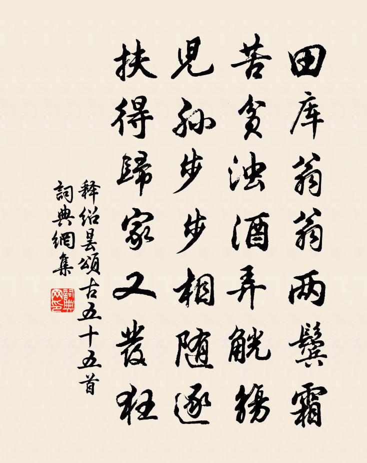 詩詞名句歷史字典書法欣賞書法字典國語詞典說文解字康熙字典古漢語字典標 題 作 者 詩 句 頌古五十五首作者:釋紹曇 朝代:宋代頌古五十五首原文田庫翁翁兩鬢霜,苦貧濁酒弄觥觴。兒孫步步相隨逐,扶得歸家又發狂。詩詞問答問:頌古五十五首的作者是誰?答:釋紹曇問:頌古五十五首寫於哪個朝代?答:宋代釋紹曇頌古五十五首書法欣賞頌古五十五首書法作品詩詞推薦上知府大同王太尉六首魏野〔宋代〕五等諸侯稀五福,三朝官只欠三台。下車一變熙熙景,賓合多開印少開。登羅浮絕頂奉同蔣王二大夫作屈大均〔清代〕霃霃太古雲,至今未開闢。山氣日洶湧,隨風灑 * 。觸石生洪波,微茫在咫尺。登山若浮海,舟航即輕策。浮山送李宣叔倅漳州王安石〔宋代〕閩山到漳窮,地與南越錯。山川郁霧毒,瘴癘春冬作。荒茅篁竹閒,蔽虧有城郭。居人特鮮少,市井宜蕭索。野花挽浙西提舉李公林景熙〔宋代〕文獻凋零半壟雲,荊花舊宅冷溪濱。欲知禮樂千年事,曾寄行藏八袠身。旌節自天驚隔世,衣冠入地見全人。鵠袍示用禪人釋宗杲〔宋代〕未點先行不唧{左口右留},不撥自轉已出醜。那堪更鼓兩片皮,豈止鑒空開戶牖。火中木馬空嘶鳴,水底泥牛謾題伏龍寺壁張栻〔宋代〕少日憶曾到,歸途得小留。回還山寺古,蕭瑟柿林秋。道路情無那,琴書可細求。從來士窮達,分付水悠悠。飲酒二十首同蘇翰林先生次韻追和陶淵明一晁補之〔宋代〕少賤足可喜,險阻更嘗之。為親謀斗粟,無意出競時。緬焉效一官,報國方在茲。寧當不恤緯,對酒懷憂疑。學道重登寶公塔復用前韻二首王安石〔宋代〕碧玉旋螺恍隔霄,冠山仙冢亦寥寥。空餘華構延風月,無復靈蹤落市朝。帳座追嚴多獻寶,供盤隨施有操瓢。他方贈別顯上人釋紹嵩〔宋代〕兩浙尋山遍,依稀三十秋。征塵添老色,藜杖賦歸休。落葉隨杯渡,殘虹帶夕收。不知從此去,能寄短書不。固城范成大〔宋代〕柳棬涼罐汲泉遙,味苦仍鹹似海潮。卻憶徑山龍井水,一杯洗眼洞層霄。陳伯順夫婦輓詞林亦之〔宋代〕晴春相見未多時,忽嘆霜蕪雪屋非。僵瑟樓前方悼往, * 台下竟同歸。讀書歷歷向秋樹,織錦悠悠空曉機。須信詠十里塘姜店水亭前竹林楊萬里〔宋代〕一見此君面,荒村不是村。斜陽與可筆,棲雀子猷魂。客思方無那,詩愁得共論。問渠能飲否,把酒酹霜根。青杏兒周權〔元代〕兩鬢點霜花,漢南柳、心事蹉跎。幼輿只合居岩谷,繩床近竹,柴門臨水,任我婆娑。詩老日相過。愛蒼苔、屐齒水調歌頭(小憩袁氏園用前韻)吳潛〔宋代〕老圃無關鎖,放客意中行。頗欣天地開闊,煙釣與雲耕。荷長亭亭翠蓋,竹長森森翠葆,景致鬧裝成。幾樹榴花發挽故眉守張廷琛史堯弼〔宋代〕公典吾州日,人懷不忍欺。轅攀那復得,巷哭竟成悲。外祖松楸在,空山草木萎。魂游儻來否,尚作凱風思。危峰釋惟一〔宋代〕似側如欹杳靄間,冰棱劍刃不多爭。可中不是通玄頂,切莫粗心向上行。宿高唐州文天祥〔宋代〕早發東阿縣,暮宿高唐州。哲人達幾微,志士懷隱憂。山河已歷歷,天地空悠悠。孤館一夜宿,北風吹白頭。後苦寒行二首杜甫〔唐代〕南紀巫廬瘴不絕,太古以來無尺雪。蠻夷長老怨苦寒,崑崙天關凍應折。玄猿口噤不能嘯,白鵠翅垂眼流血。安得題關右寺壁王嗣宗〔宋代〕欲掛衣冠神武門,先尋水竹渭南村。卻將舊斬樓蘭劍,買得黃牛教子孫。詠梅五十首呈史尚書釋紹嵩〔宋代〕古寺高樓暮倚欄,小梅零落雪欺殘。一枝帶雨牆頭出,乞與時人畫裹看。名句推薦未必素娥無悵恨,玉蟾清冷桂花孤。晏殊《中秋月》 相思相見知何日?此時此夜難為情!李白《三五七言 / 秋風詞》 冬宜密雪,有碎玉聲。王禹偁《黃岡竹樓記》 寵柳嬌花寒食近,種種惱人天氣。李清照《念奴嬌·春情》 不怕慢,只怕站。佚名《增廣賢文·下集》 倉稟無宿儲,徭役猶未已。韋應物《觀田家》 君看蕭蕭只數葉,滿堂風雨不勝寒。李東陽《柯敬仲墨竹》 相逢不盡平生事,春思入琵琶。劉迎《烏夜啼·離恨遠縈楊柳》 樂殊貴賤,禮別尊卑。周興嗣《千字文·全文》 吃一分虧,受無量福。馮夢龍《警世通言·卷三》