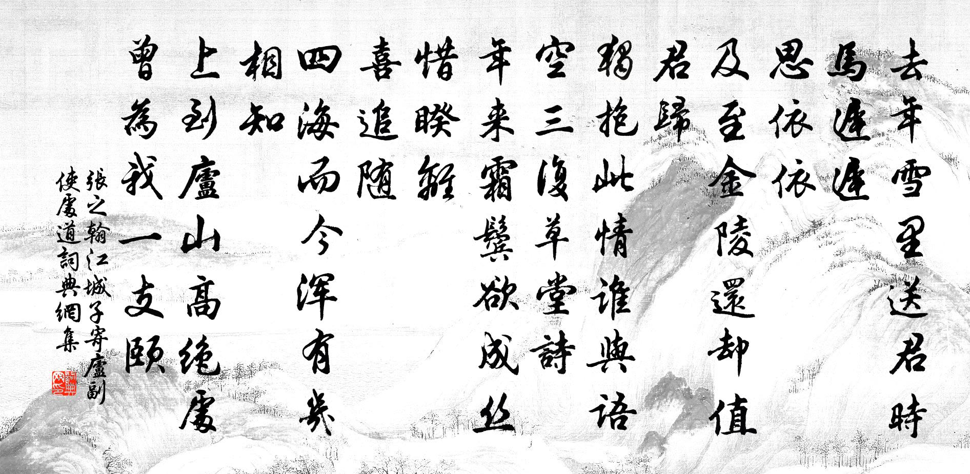 詩詞名句歷史字典書法欣賞書法字典國語詞典說文解字康熙字典古漢語字典標 題 作 者 詩 句 江城子 寄廬副使處道作者:張之翰 朝代:元代江城子 寄廬副使處道原文去年雪裡送君時。馬遲遲。思依依。及至金陵,還卻值君歸。獨抱此情誰與語,空三復,草堂詩。年來霜鬢欲成絲。惜睽離。喜追隨。四海而今,渾有幾相知。上到廬山高絕處,曾為我,一支頤。詩詞問答問:江城子 寄廬副使處道的作者是誰?答:張之翰問:江城子 寄廬副使處道寫於哪個朝代?答:元代問:江城子 寄廬副使處道是什麼體裁?答:詞張之翰江城子 寄廬副使處道書法欣賞江城子 寄廬副使處道書法作品詩詞推薦予往來秦熙汧隴間不啻十數年時聞下里之歌遠李復〔宋代〕繰絲宛轉聽東聲,東聲忽斷心暗驚。舊機虛張未滿幅,新絲更短織不成。病中絕句范成大〔宋代〕石鼎颼颼夜煮湯,亂拖芝術斗溫涼。化兒幻我知何用?只與人間試藥方。和陳勉仲贈淮西漕吳介之二首王之道〔宋代〕威嚴霜肅德春陽,民感澄清涕泗滂。畏壘大穰知不晚,三年端可笑庚桑。再用前韻和答晁補之〔宋代〕當時同赴飲城西,傾蓋論心已恨遲。湖海可無年少氣,雪霜還有歲寒枝。功傳汗竹藏王府,詩入文弢動島夷。不會再賦五雜范成大〔宋代〕五雜俎,綬若若。往復來,大車鐸。不得已,去丘壑。題易村華岳〔宋代〕路轉峰迴覺有村,數間茅屋瞰山陰。午炊已飽翻匙玉,臘醖仍拚掛杖金。窮去作文和鬼送,興來得句倩蟬吟。一聲小酌王令〔宋代〕平生從事漫徒勞,時以休閒近酒醪。東海可從誰自重,南山如與客爭高。老將日月來雙鬢,生委乾坤寄一毛。更展水調歌頭鍾將之〔宋代〕更似南津港,再遇呂公船。閨情效香奩體黃庚〔宋代〕淚浣香腮粉未乾,相思成病 * 。此 * 向琵琶訴,整得琵琶又倦彈。六花飛(冊寶)曹勛〔宋代〕寅杓乍正,瑞雲開曉,罩紫府宮殿。聖孝虔恭,率宸庭冠劍。上徽稱、天明地察,奉玉檢、璇耀金輝,仰吾君,親偈頌十六首釋如淨〔宋代〕時節因緣佛性義,共移靈棹渡頭舟。玉麟帶月離雲漢,金鳳銜花下彩樓。春日雜興陸游〔宋代〕乍晴乍雨忽經旬,半醉半醒還過春。春臥不知庵外事,閒吟聊適夢中身。溪灣趙訥軒〔宋代〕曬網漁人路,高低四五家。半篙四五家。半篙春水竹,一樹夕陽花。鷗靜機忘鷺,牛行背立鴉,牛行背立鴉。白頭寄孫學長孝思曾豐〔宋代〕短檠方冊不增窮,窮到無錐文字工。與我心同如印印,使人意快似風風。江山信筆機之熟,天地忘懷氣所充。耆舊漁夫舞史浩〔宋代〕一引修鱗吾事了。棹船歸去歌聲杳。門俯清灣山更好。眠到曉。鳴榔艇子方雲擾。山家陸游〔宋代〕陶葛金丹訣,千年秘不傳。人皆肖天地,世豈乏神仙。擾擾生趨死,悠悠食復眠。微言誰復領,浩嘆撫遺編。冬日齋中即事陸游〔宋代〕我老苦寂寥,誰與娛晨暮?狸奴共茵席,鹿麑隨杖屨。歲薄食無餘,恨使鳥雀去。安得粟滿囷,作粥饋行路!賀新郎(約友三月旦飲)蔣捷〔宋代〕雁嶼晴嵐薄。倚層屏、千樹高低,粉纖紅弱。雲隘東風藏不盡,吹艷生香萬壑。又散入、汀蘅洲藥。擾擾匆匆塵土偈頌三十首釋慧暉〔宋代〕佛日高懸,祖月彌朗。僧雲漫漫,法雨浩浩。禪林花發,教風春迎。致爽軒杜子更〔宋代〕西鄰東老總為虛,料想君家樂有餘。白酒黃金都是幻,爭如好客與收書。名句推薦樓角初銷一縷霞,淡黃楊柳暗棲鴉賀鑄《減字浣溪沙·樓角初銷一縷霞》 念歸林葉換,愁坐露華生。張九齡《西江夜行》 扁舟昨泊,危亭孤嘯,目斷閒雲千里。吳潛《鵲橋仙·扁舟昨泊》 又是過重陽,台榭登臨處,茱萸香墜。李煜《謝新恩·冉冉秋光留不住》 不知天上宮闕,今夕是何年。蘇軾《水調歌頭·丙辰中秋》 金絡青驄白玉鞍,長鞭紫陌野遊盤。萬楚《驄馬》 朝為越溪女,暮作吳宮妃。王維《西施詠》 客愁全為減,舍此復何之?杜甫《後游》 恐是仙家好別離,故教迢遞作佳期。李商隱《辛未七夕》 父母威嚴而有慈,則子女畏慎而生孝矣。顏之推《顏氏家訓·教子篇》