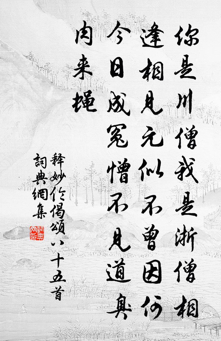 詩詞名句歷史字典書法欣賞書法字典國語詞典說文解字康熙字典古漢語字典標 題 作 者 詩 句 偈頌八十五首作者:釋妙倫 朝代:宋代偈頌八十五首原文你是川僧,我是浙僧。相逢相見,元似不曾。因何今日成冤憎,不見道臭肉來蠅。詩詞問答問:偈頌八十五首的作者是誰?答:釋妙倫問:偈頌八十五首寫於哪個朝代?答:宋代釋妙倫偈頌八十五首書法欣賞偈頌八十五首書法作品詩詞推薦偈頌六十七首釋原妙〔宋代〕歸宗拭卻眼睛,二祖安心斷臂。雲門拶折一足,玄沙{上祝下土}破腳指。遮一夥隨摟搜漢,蚤知有遮船訊息,免頌古一百二十一首釋宗杲〔宋代〕新婦騎驢阿家達,步步相隨不著鞭。歸到畫堂人不識,從今嫩更出門前。紅梅 其六王冕〔元代〕白日遲遲照窗戶,深院不知春幾許?紫簫聲轉香風回,隔簾踏動燕脂雨。過睦州青溪渡楊彝〔唐代〕天闊銜江雨,冥冥上客衣。潭清魚可數,沙晚雁爭飛。川谷留雲氣,鵜鶘傍釣磯。飄零江海客,欹側一帆歸。秋風王安石〔宋代〕揫歛一何饕,天機亦自勞。牆隈小翻動,屋角盛呼號。漠漠驚沙密,紛紛斷柳高。江湖豈在眼,昨夜夢波濤。兩京童謠佚名〔唐代〕不怕上蘭單,惟愁答辨難。無錢求案典,生死任都官。接待釋如淨〔宋代〕飯籮無底乾坤窄,舀出炎炎熱鐵丸。爛斷飢腸重瞥地,佛魔無處辨來端。望永思陵陸游〔宋代〕旰食憂民宴樂疏,太倉幾有九年儲?賈生未解人間事,北闕猶陳痛哭書。霜天雜興陸游〔宋代〕楓業全丹槲葉黃,江城殘角伴斜陽。琴書自足閒中樂,天地能容醉後狂。老死山林初不憾,夢遊河渭獨難忘。谷城見梁檢法書懷八絕句於廣文尉曹處次韻趙蕃〔宋代〕漢詔元從漏網寬,可將數罟作驚瀾。幕中有此賢從事,我亦他時逭免冠。秋懷十首趙蕃〔宋代〕情親骨肉均,未可一一數。君家蓋其人,進也邊城戍。肅儀雖近家,白首猶管庫。好歌歸去來,莫賦感不遇。尾犯張炎〔宋代〕一白受春知。獨愛老來,疏瘦偏宜。古月黃昏,許松竹相依。暈蘚枯槎半折,影浮波、渴龍倒窺。歲華凋謝,水邊送魏簡能東遊二首李涉〔唐代〕獻賦論兵命未通,卻乘羸馬出關東。灞陵原上重回首,十載長安似夢中。燕市悲歌又送君,目隨征雁過寒雲。孤亭東磵楊修〔宋代〕手拖葛屨坐藜床,竹樹蕭然一水傍。枕上白雲船下月,卜鄰東磵勝東岡。郊廟歌辭。享太廟樂章。鈞天舞佚名〔唐代〕承天撫籙,纂聖登皇。遐清萬宇,仰協三光。功成日用,道濟時康。璇圖載永,寶曆斯昌。日月揚暉,煙雲爛色。月華寺(寺鄰岑水場施者皆坑戶也,百年間蓋三焚矣)蘇軾〔宋代〕天公胡為不自憐,結土融石為銅山。萬人探斫富媼泣,只有金帛資豪奸。脫身獻佛意可料,一瓦坐待千金還。月華允傑侄以詩來卒章和予生孫次韻一百首今存四許月卿〔宋代〕玉川破屋手提包遺經,生子添丁意命名。門暗碧雲憂國志,窗明紅日愛君情。柳綠學徒勤左塾,花紅主婦饌前榮。觀徐復州家書畫七首趙蕃〔宋代〕世人競寫襄陽字,政似雲師太白詩。才匪若人寧躐等,自顛自醉只成痴。賦鞏丈鸚鵡三首姜特立〔宋代〕紫燕黃鸝亦言語,或依簾幕或穿花。較量愛重無如汝,合在華堂富貴家。噴玉潭司馬光〔宋代〕千尺崖頭一派清,古今不絕墜崢嶸。長風捲起散岩壑,此日蚊知噴玉名。名句推薦向河梁、回頭萬里,故人長絕。辛棄疾《賀新郎·別茂嘉十二弟》 昨夜星辰昨夜風,畫樓西畔桂堂東。李商隱《無題·昨夜星辰昨夜風》 春日遲遲春草綠,野棠開盡飄香玉。李洞《繡嶺宮詞》 休對故人思故國,且將新火試新茶。詩酒趁年華。蘇軾《望江南·超然台作》 為君之道,必須先存百姓。吳兢《貞觀政要·卷一·論君道》 夢斷刀頭,書開蠆尾,別有相思隨定。史達祖《齊天樂·中秋宿真定驛》 情共天涯秋黯,朱橋鎖深巷。吳文英《解蹀躞·醉雲又兼醒雨》 言無二貴,法不兩適。韓非及後人《韓非子·問辯》 小立紅橋柳半垂,越羅裙颺縷金衣。納蘭性德《山花子·小立紅橋柳半垂》 乍暖還輕冷。張先《青門引·春思》