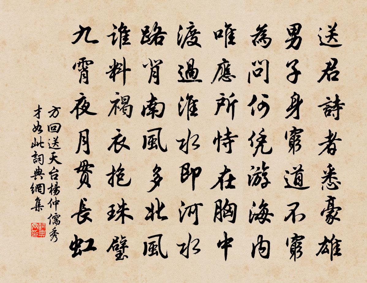 詩詞名句歷史字典書法欣賞書法字典國語詞典說文解字康熙字典古漢語字典標 題 作 者 詩 句 送天台楊仲儒秀才如此作者:方回 朝代:宋代送天台楊仲儒秀才如此原文送君詩者悉豪雄,男子身窮道不窮。為問何憑游海內,唯應所恃在胸中。渡過淮水即河水,路背南風多北風。誰料褐衣抱珠璧,九霄夜月貫長虹。詩詞問答問:送天台楊仲儒秀才如此的作者是誰?答:方回問:送天台楊仲儒秀才如此寫於哪個朝代?答:宋代方回送天台楊仲儒秀才如此書法欣賞送天台楊仲儒秀才如此書法作品詩詞推薦次和正仲詠荷花月露二景舒岳祥〔宋代〕風清月白天垂碧,有恨如羞半斂花。紅袖粉痕晨帶濕,翠盤珠影夜生華。楊枝灑潤菩提雨,薇水流香仙子家。幾度酬岑勛見尋就元丹丘對酒相待以詩見招。李白〔唐代〕黃鶴東南來,寄書寫心曲。倚鬆開其緘,憶我腸斷續。不以千里遙,命駕來相招。中逢元丹丘,登嶺宴碧霄。對酒偈五首釋子淳〔宋代〕日照孤峰翠,月臨溪水寒。祖師玄妙訣,莫向寸心安。謝松野叔贈詩用首句驚舟出瞿塘還有平流安十羅公升〔宋代〕庭中鳥鵲噪,門外雞犬驚。知有錦繡章,來作金石聲。松因屈子恥,菊為淵明清。今我獨何者,照幾新詩明。以椰子香爐花瓶為大人壽項安世〔宋代〕石湖居士虞衡志,椰子之身本棕類。葉間各結三四子,大者能容五升器。初如青纈美少年,漸久漸黃堅且緻。有穰醉落魄·離京口作蘇軾〔宋代〕輕雲微月,二更酒醒船初發。孤城回望蒼煙合。記得歌時,不記歸時節。巾偏扇墜藤床滑,覺來幽夢無人說。此生李季允侍郎舟中戴復古〔宋代〕憶昨楓橋既語離,何期千里又相隨。太湖不見鴟夷子,秋浦同尋杜牧之。燈火船窗深夜話,江山客路早冬詩。人間過何權道幽居不遇李新〔宋代〕水部風流小隱居,別來眼法定何如。霧中不見空峒子,世外空傳珞琭書。今歲紫荊簪未得,後溪黃鮓信無餘。素冠同衛八題陸少府書齋高適〔唐代〕知君薄州縣,好靜無冬春。散帙至棲鳥,明燈留故人。深房臘酒熟,高院梅花新。若是周旋地,當令風義親。菩薩蠻張元乾〔宋代〕甘林玉蕊生香霧。游蜂爭采清晨露。芳意著人濃。微烘曲室中。春來瀛海外。瀋水迎風碎。好事富餘熏。頻分幾縷偈頌一百三十六首釋惟一〔宋代〕今日如是,明日如是。一日復一日,一年復一年。百千萬億年,窮竟只如是。月落烏啼霜滿天,紛紛黃圳飄庭際。春日六絕句楊萬里〔宋代〕春醉非關酒,郊行不問塗。青天何處了,白鳥入空無。壬申年封州自正旦雨至無宵不止鄭剛中〔宋代〕江風侵山雲不乾,迎春送臘雨漫漫。勾萌潛識化工意,泥淖莫嗟行路難。閉衣定無元夜醉,擁衾如對九秋寒。池塘鵲踏枝馮延巳〔唐代〕花外寒雞天欲曙,香印成灰,起坐渾無緒。檐際高桐凝宿霧,捲簾雙鵲驚飛去。屏上羅衣閒繡縷,一向關情,憶遍地遠釋文珦〔宋代〕地遠無人跡,心閒見物情。洞中飛石燕,崖頂住山精。仟木開花異,靈泉吐溜清。幽棲已成趣,不復問浮名。題旅舍壁陸游〔宋代〕老子殘年未易量,出門隨處得彷徉。窗欞日淡僧房暖,灶突煙青旅甑香。濁酒可求敲野店,舊題猶在拂頹牆。閒來句王銍〔宋代〕杜宇啼時花正開。慘慘風林叫竹雞,冥冥山路曉光微。盡在疏枝冷蕊中。一枝清峭臨荒岸。白日不照物王安石〔宋代〕白日不照物,浮雲在寥廓。風濤吹黃昏,屋瓦更紛泊。行觀蔡河上,負土私力弱。隋堤散萬家,亂若春蠶箔。仍聞和顏長官百詠城市朱繼芳〔宋代〕蕪城懷古最愁人,劫火燒殘得此身。舞榭歌台何足道,秦宮漢苑尚流塵。汴上觀(一本有河冰二字)吳融〔唐代〕九曲河冰半段來,嚴霜結出勁風裁。非時已認蟬飄翼,到海須憂蚌失胎。千里風清聞戛玉,幾人東下憶奔雷。殷勤名句推薦醉舞梁園夜,行歌泗水春杜甫《寄李十二白二十韻》 童子柳陰眠正著,一牛吃過柳陰西。楊萬里《桑茶坑道中》 南陵水面漫悠悠,風緊雲輕欲變秋。杜牧《南陵道中 / 寄遠》 口而誦,心而惟。朝於斯,夕於斯。王應麟《三字經·全文》 無端和淚拭胭脂,惹教雙翅垂張泌《蝴蝶兒·蝴蝶兒》 黃雲連白草,萬里有無間。王鎡《塞上曲》 君子進德修業。忠信所以進德也。修辭立其誠,所以居業也。佚名《易傳·文言傳·乾文言》 未怪平陽客,雙淚落、笛中哀曲周邦彥《大酺·春雨》 莫道讒言如浪深,莫言遷客似沙沉。劉禹錫《浪淘沙九首》 曲闌深處重相見,勻淚偎人顫。納蘭性德《虞美人·曲闌深處重相見》