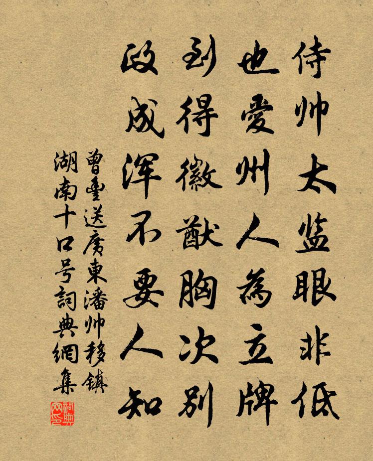 詩詞名句歷史字典書法欣賞書法字典國語詞典說文解字康熙字典古漢語字典標 題 作 者 詩 句 送廣東潘帥移鎮湖南十口號作者:曾豐 朝代:宋代送廣東潘帥移鎮湖南十口號原文侍帥太監眼非低,也愛州人為立牌。到得徽猷胸次別,政成渾不要人知。詩詞問答問:送廣東潘帥移鎮湖南十口號的作者是誰?答:曾豐問:送廣東潘帥移鎮湖南十口號寫於哪個朝代?答:宋代曾豐送廣東潘帥移鎮湖南十口號書法欣賞送廣東潘帥移鎮湖南十口號書法作品詩詞推薦次韻何陸二別駕同游靈山閣三首徐元傑〔宋代〕聞說精藍頗壯哉,天教傑棟起崔嵬。檐前山色呈螺髻,檻外溪光獻玉杯。對景自應雙眼豁,憂時應得笑顏開。喚回贈常庵江羽士徐清叟〔宋代〕九曲溪頭活計,三生石上精魂,沓沓間云何處,空山明月啼猿。送陸堯夫倅襄陽張嵲〔宋代〕我本江漢客,十年官到京。君為三吳士,欻有南雍行。風波眇沿泝,水陸幸俱平。是邦雖毀頓,生聚今尚成。矧君過鼎澧胡寅〔宋代〕沅澧春風拂馬鞭,客愁何事四無邊。於今榛棘三州地,自昔坻京百姓天。安得鳴雞連比屋,空餘歸雁落平川。一觴山行二絕黎廷瑞〔宋代〕野老相過一笑迎,黃難白酒愧深情。山空日落早歸去,昨夜隔籬聞虎聲。次章房陵韻四首陳造〔宋代〕老驥挺高骨,彌耳塵中馳。鄰女嫁不售,泣向流黃機。與子落窮山,坐無適時姿。濠梁莞一笑,游鱗噞風漪。和劉誼翁留題惠安二首舒坦〔宋代〕十里松竹翠插天,暗溪嫩草半芊綿。笙歌自滿蕭郎宅,琴鶴空隨賀老船。未分舊遊雲寂寞,遙知歸夢蝶聯翩。故山次韻子瞻和淵明飲酒二十首蘇轍〔宋代〕我友二三子,兼有仕未仕。青松出林秀,豈獨私與己。斂然不求人,而我自罍恥。臨風忽長鳴,誰信日千里。江行寄黃州錄事劉進之同年孫應時〔宋代〕騎曹新上雪堂西,千里淮南望眼迷。正我尋雲並滄海,思君步月過黃泥。清時鼓角無驚夢,勝日樽罍有共攜。人物閒步至鞠場值小雪陸游〔宋代〕倒盡床頭酒半罌,笑呼筇杖共閒行。梅花照水為誰瘦,雪片倚風如許輕。孟德遇冬思射獵,廣文垂老謝才名。歸來夜夢至何許岩壑深窈石上苔痕隱起如小篆有僧方岳〔宋代〕大楊風日春,小范林壑秋。去予幾何年,各已如雲浮。誰歌黃金縷,共醉白玉舟。夢中到蓬萊,名字留岩幽。寧知除夜元日連登煙霏樓葉適〔宋代〕摧荷禿柳不勝春,脈脈荒堤數過人。我若有材以速化,應鈄地巧答天真。群花盛開二首何澹〔宋代〕向陽花木易培栽,略借春風已自開。多謝青宮能長養,一枝先壓紫霞杯。謝景英送鄭景元篇末見屬次韻樓鑰〔宋代〕張羅清似翟公門,門外都無野雀喧。可但風流追鮑謝,直教高論到羲軒。絕憐父子為知己,時把文章得細論。個裡翠孤至渚宮寄座主相公曹鄴〔唐代〕萬里一孤舟,春行夏方到。骨肉盡單羸,沉憂滿懷抱。羈孤相對泣,性命不相保。開戶山鼠驚,蟲聲亂秋草。白菌春晚羅公升〔宋代〕人在幽窗柳在闌,樓頭杜宇一聲殘。夢魂驚斷梨花月,寂寞五更風雨寒。答武陵田太守王昌齡〔唐代〕仗劍行千里,微軀敢一言。曾為大梁客,不負信陵恩。風入松(江景)吳禮之〔宋代〕苹汀蓼岸荻花洲。占斷清秋。五湖景物供心眼,幾曾有、一點閒愁。夢裡翩翩胡蝶,覺來葉葉漁舟。謝郎隨分總優古詩贈興宗司馬光〔宋代〕窮達有常分,得喪難豫言。古今浩茫茫,倚伏安可原。軒掌彼自榮,興俗同崩奔。錙銖校重輕, * 殊涼溫。君子夜坐有感范成大〔宋代〕靜夜家家閉戶眠,滿城風雨驟寒天。號呼賣卜誰家子,想欠明朝糶米錢!名句推薦射人先射馬,擒賊先擒王。杜甫《前出塞九首·其六》 疊嶂西馳,萬馬迴旋,眾山欲東。辛棄疾《沁園春·靈山齋庵賦時築偃湖未成》 更深月色半人家,北斗闌乾南斗斜。劉方平《月夜》 驚回千里夢,已三更。起來獨自繞階行。岳飛《小重山·昨夜寒蛩不住鳴》 山暝聞猿愁,滄江急夜流。孟浩然《宿桐廬江寄廣陵舊遊》 花意爭春,先出歲寒枝。辛棄疾《江神子·賦梅寄余叔良》 世界微塵里,吾寧愛與憎。李商隱《北青蘿》 雨余溪水掠堤平,閒看村童謝晚晴。陸游《觀村童戲溪上》 執一者至貴也,至貴者無敵。呂不韋《呂氏春秋·覽·離俗覽》 中庸其至矣乎!民鮮能久矣。子思《中庸·第三章》