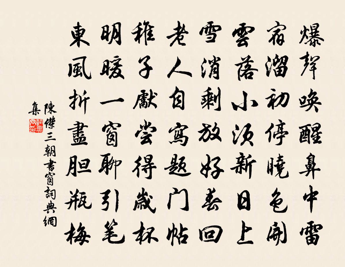 詩詞名句歷史字典書法欣賞書法字典國語詞典說文解字康熙字典古漢語字典標 題 作 者 詩 句 三朝書窗作者:陳杰 朝代:宋代三朝書窗原文爆聲喚醒鼻中雷,宿溜初停曉色開。雲落小須新日上,雪消剩放好春回。老人自寫題門帖,稚子先嘗得歲杯。明暖一窗聊引筆,東風折盡膽瓶梅。詩詞問答問:三朝書窗的作者是誰?答:陳杰問:三朝書窗寫於哪個朝代?答:宋代陳杰三朝書窗書法欣賞三朝書窗書法作品詩詞推薦送陳行之寺丞守南劍二首楊萬里〔宋代〕我召公先倒,公歸我亦行。三年如夢爾,一笑可憐生。野店綠山去,春風並轡輕。先愁饒水上,話別若為情。野步吳可〔宋代〕密竹藏啼鳥,荒村起白煙。人行秋色里,家在夕陽邊。和吳龍圖韻五首二色芙蓉文同〔宋代〕蜀國芙蓉名二色,重陽前後始盈枝。畫調粉筆分妝處,繡引紅針間刺時。落晚自憐窺露沼,忍寒誰念倚霜籬。主人送稅官仇副使詩十首熊禾〔宋代〕課餘自喔詩,詩罷還教子。時時視橐余,質鬻市薪米。鄭公家戴敏〔宋代〕門牆多古意,耕釣作生涯。菽米散魚子,蓮根拔虎牙。弄孫時擲果,留客旋煎茶。頗動詩人興,滿園蕎麥花。登閣李士元〔唐代〕亂後獨來登大閣,憑闌舉目盡傷心。長堤過雨人行少,廢苑經秋草自深。破落侯家通永巷,蕭條宮樹接疏林。總輸頌古二十一首釋正覺〔宋代〕容顏甚奇妙,光明照十方。我適曾供養,今復還親覲。黃鶴樓前共語時,白苹紅蓼對江湄。衷腸已訴無人會,惟有送王東鄉歸天台劉過〔宋代〕枚數人才難倒指,有如公者又東歸。班行失士國輕重,道路不言心是非。載酒青山隨處飲,談詩玉塵為誰揮。歸期雁盪寶冠寺趙師秀〔宋代〕行向石欄立,清寒不可雲。流來橋下水,半是洞中雲。欲住逢年盡,因吟過夜分。盪陰當絕頂,一雁未曾聞。耕雲峰汪樹琪〔清代〕誰驅黃犢逐雲行,片片芙蓉欲種成。布穀春風吹不到,故叫山樂代催耕。千葉石榴鄧深〔宋代〕誰家巧歸為花謀,針絲殘零細意收。不管生紅難熨貼,從教百皺綴枝頭。曉赴秘書省有感張耒〔宋代〕桃李欲開時,長安春正好。晴空倚閶闔,朝日散馳道。雲收龍蛇榜,爛爛金碧曉。清都不容塵,虎士守灑掃。家無曉枕聞雨范成大〔宋代〕暗淡更殘景,低迷病酒懷。剔燈寒作伴,添被厚如埋。膽冷都無夢,心空卻似齊。地爐煎粥沸,聽作雨鳴階。留無邪字袁甫〔宋代〕此駿產渥窪,神奇莫浪夸。相期千里志,贈子字無邪。秋晚訪李處士所居皮日休〔唐代〕門前襄水碧潺潺,靜釣歸來不掩關。書閣鼠穿廚簏破,竹園霜後桔槔閒。兒童不許驚幽鳥,藥草須教上假山。莫為題疏山一覽亭曾豐〔宋代〕孤絕招邀杜道過,支筇不足更捫蘿。旁無斷岸乾坤大,上有餘天日月多。道限與空歸不二,色塵隨幻入無何。虛中頌古二十五首釋崇岳〔宋代〕出得出不得,攧落精靈窟。何處不風流,祖師無妙訣。酬萬年張郎中見寄姚合〔唐代〕貢籍常同府,周行今一時。諫曹誠已忝,京邑豈相宜。黑髮年來盡,滄江歸去遲。何時得攜手,林下靜吟詩。孤嶼亭鄭俠〔宋代〕峰巒何迤邐,天際相依倚。如何是孤嶼,獨立澄明裹。依韻和酬孫公素中允寫懷見貽強至〔宋代〕車馬門前住罕逢,春坊內允獨相從。領垂素髮驚潘岳,器負青雲愛仲容。身世百年今有愧,功名萬事近尤慵。不緣名句推薦青青子衿,悠悠我心。佚名《子衿》 以子之矛,陷子之盾韓非及後人《韓非子·難一》 垂楊拂綠水,搖艷東風年。李白《折楊柳》 近來攀折苦,應為別離多王之渙《送別》 玉樓金闕慵歸去,且插梅花醉洛陽朱敦儒《鷓鴣天·西都作》 恰似春風相欺得,夜來吹折數枝花。杜甫《絕句漫興九首·其二》 是節東籬菊,紛披為誰秀。杜甫《九日寄岑參》 雲盡月如練,水涼風似秋。歐陽詹《荊南夏夜水樓懷昭丘直上人云夢李莘》 扁舟去作江南客,旅雁孤雲。朱敦儒《採桑子·彭浪磯》 山光悅鳥性,潭影空人心。常建《題破山寺後禪院》