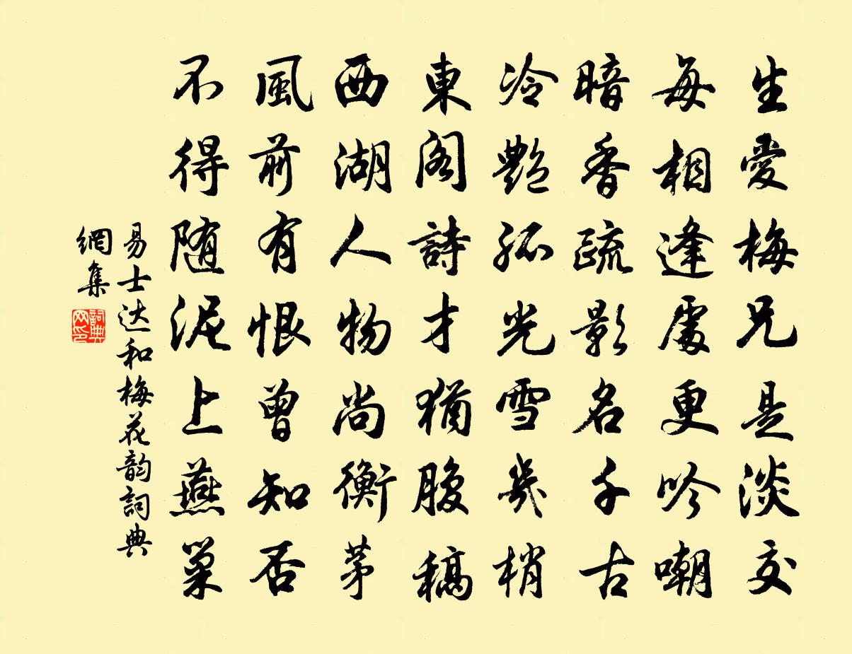 詩詞名句歷史字典書法欣賞書法字典國語詞典說文解字康熙字典古漢語字典標 題 作 者 詩 句 和梅花韻作者:易士達 朝代:宋代和梅花韻原文生愛梅兄是淡交,每相逢處更吟嘲。暗香疏影名千古,冷艷孤光雪幾梢。東閣詩才猶腹稿,西湖人物尚衡茅。風前有恨曾知否,不得隨泥上燕巢。詩詞問答問:和梅花韻的作者是誰?答:易士達問:和梅花韻寫於哪個朝代?答:宋代易士達和梅花韻書法欣賞和梅花韻書法作品詩詞推薦和西園胡季履見寄曹彥約〔宋代〕衣冠葉葉著師儒,創見皇家異代無。前事盛哉申國呂,近時繼者武夷胡。累朝經學堪貽厥,三世名家列友於。莫道寺齋睡起二首黃庭堅〔宋代〕小黠大痴螳捕蟬,有餘不足夔憐蚿。退食歸來北窗夢,一江風月桃李船。讀道藏葛密〔宋代〕仙莖屢隕三危露,真館常開四照花。鵲渚曉煙飛玉洞,琅池秋水接星槎。賦得謁帝承明廬詩江總〔隋代〕霧開仁壽殿。雲繞承明廬。輪停紺幰引。馬度紅塵余。香貂拜黻袞。花綬拂玄除。謁帝升清漢。何殊入紫虛。眾樂亭馮浩〔宋代〕嘗聞眾樂亭,未窺眾樂景。今蒙貺新詩,若得暫觀省。萬象盈紙來,孤風隨筆騁。丹青慚近功,造化與遙領。因識山居雜詩九十首曹勛〔宋代〕真隱古招提,長林如磔蝟。雖有群山峰,所欠一支水。草木乏秀潤,岩竇燥肌理。安能借僧錫,卓處泉涌沸。農謠方岳〔宋代〕雨過一村桑柘煙,林梢日暮鳥聲妍。青裙老姥遙相語,今歲春寒蠶未眠。樂府雜擬黃彥平〔宋代〕忘機對芳草,一目青浮浮。榮枯四時行,寂寞萬事休。樹諼見國風,採菊聞靈修。空殘飛蓬首,詎返王遜游。韓子病中聞雁有感艾性夫〔宋代〕我病無眠守夜闌,汝來何暮尚雲端。去鄉萬里關河隔,帶月一聲風露寒。口腹累人菰米飯,弟兄何處荻花灘。營門奉贈蕭二十使君杜甫〔唐代〕昔在嚴公幕,俱為蜀使臣。艱危參大府,前後間清塵。起草鳴先路,乘槎動要津。王鳧聊暫出,蕭雉只相馴。終始嘉泰三年皇后冊寶十三首佚名〔宋代〕金石具舉,典禮茂明。淑慎其止,遹觀厥成。瑤琚微動,同替翼行。行光娥極,德邁嬪京。次韻晁子與王灼〔宋代〕清豀西岸作鶉居,敢怨投閒百不如。喜得君家好兄弟,相逢如對古人書。久雨劉克莊〔宋代〕晴旭常難保,春寒未易禁。鋒交馬旋濘,室毀燕巢林。民望兵如雨,人言潦屬陰。何當抉雲霧,放出太陽臨。暮坐中庭楊萬里〔宋代〕蚊子因涼減,蟬聲入暮多。有愁無處著,不飲欲如何。三句頌隨波逐浪道禪師〔宋代〕辯口利舌間,高低總不虧。還知應病藥,診候在臨時。玉華山張峋〔宋代〕玉華山誰窮遠近,百里迴旋勢方盡。削成蒼玉倚青天,氣象軒軒獨奇俊。黃河哮顑摧崑崙,一峰飄落如龍蹲。白雲思歸二首戴復古〔宋代〕吟詩不換校書郎,但欲封侯管醉鄉。疏懶無成嵇叔夜,清狂似達賀知章。安貧不怕黃金盡,既老從教白髮長。百計元祜元年二月八日,朝退,獨在起居院讀《漢蘇軾〔宋代〕寂寞申公謝客時,自言已見穆生機。綰臧下吏明堂廢,又作龍鍾病免歸。即事十首劉克莊〔宋代〕瓜果跽拳祝,{左日右侯}羅撲賣聲。粵人重巧夕,燈火到天明。又和劉景文韻蘇軾〔宋代〕牡丹松檜一時栽,付與春風自在開。試問壁間題字客,幾人不為看花來。名句推薦近來何處有吾愁,何處還知吾樂。辛棄疾《念奴嬌·賦雨岩》 風摧寒棕響,月入霜閨悲。李白《獨不見》 寄相思,寒雨燈窗,芙蓉舊院。吳文英《宴清都·秋感》 無言暗將紅淚彈闌珊,香銷輕夢還納蘭性德《河傳·春淺》 翠華想像空山里,玉殿虛無野寺中。杜甫《詠懷古蹟五首·其四》 天山雪雲常不開,千峰萬嶺雪崔嵬。岑參《天山雪歌送蕭治歸京》 賞心樂事共誰論?花下銷魂,月下銷魂。唐寅《一剪梅·雨打梨花深閉門》 庭前時有東風入,楊柳千條盡向西。劉方平《代春怨》 劍花寒,夜坐歸心壯,又是他鄉。張可久《滿庭芳·客中九日》 無端聽畫角,枕畔紅冰薄。納蘭性德《菩薩蠻·朔風吹散三更雪》