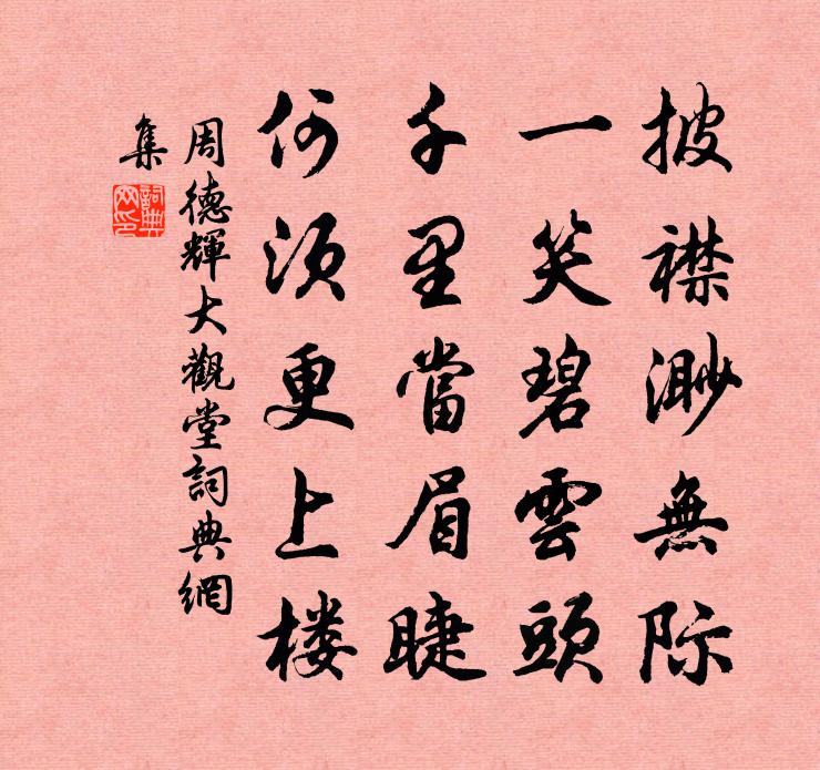 詩詞名句歷史字典書法欣賞書法字典國語詞典說文解字康熙字典古漢語字典標 題 作 者 詩 句 大觀堂作者:周德輝 朝代:宋代大觀堂原文披襟渺無際,一笑碧雲頭。千里當眉睫,何須更上樓。詩詞問答問:大觀堂的作者是誰?答:周德輝問:大觀堂寫於哪個朝代?答:宋代周德輝大觀堂書法欣賞大觀堂書法作品詩詞推薦彭門偶題薛能〔唐代〕淮王西舍固非夫,柳惲偏州未是都。直到春秋諸列國,擁旄才子也應無。贈劉仲堪王禹偁〔宋代〕劉生頗少秀,為學識根柢。丘軻有堂奧,試腳到階砌。楊墨恣荒榛,揮手欲芟薙。攜文訪謫居,趣向非權勢。對挹見梁檢法書懷八絕句於廣文尉曹處次韻趙蕃〔宋代〕醉眠欹側似乘舠,颯颯溪風吹鬢毛。頗念乘流覓歸路,兀然驚起遇灘高。偈頌二十三首釋雲岫〔宋代〕崑崙之水易發,少林之春難芳。一臂勿斷,九年頓忘。雷暈紋於象齒,花釀蜜於蜂房。派列枝分兮子孫繁碎,烏非春遊東潭盧綸〔唐代〕移舟試望家,漾漾似天涯。日暮滿潭雪,白鷗和柳花。陳叔盥兩惠詩以一首謝陳藻〔宋代〕休要逢人誦六經,紅泉往事已凋零。向來未壞恭王壁,到處閒搖普化鈴。幾歲寒窗頭也白,兩篇新什眼空青。還鄉詠筍用昌黎韻趙蕃〔宋代〕山居何所用,種竹並楹軒。聽雨宵忘寐,搖風日破煩。春來仍引蔓,雨後競添孫。迸砌思移石,妨池欲廢盆。堤防禪人並化主寫真求贊釋正覺〔宋代〕形衰柳蒲,心老江湖。魚潛波路靜,鶴夢月巢孤。不損色香三昧手,粉黏雙股理華須。蝶戀花(稼軒坐間作,首句用丘六書中語)楊炎正〔宋代〕點檢笙歌多釀酒。不放東風,獨自迷楊柳。院院翠陰停永晝。曲欄隋處堪垂手。昨日解酲今夕又。消得情懷,長被訴衷情王益〔宋代〕燒殘絳蠟淚成痕。街鼓報黃昏。碧雲又阻來信,廊上月侵門。愁永夜,拂香裀。待誰溫。夢蘭憔悴,擲果淒涼,兩催宗文樹雞柵杜甫〔唐代〕吾衰怯行邁,旅次展崩迫。愈風傳烏雞,秋卵方漫吃。自春生成者,隨母向百翮。驅趁制不禁,喧呼山腰宅。課奴宋之問徐鈞〔宋代〕百醜只能博寸榮,趨權恃勢苦營營。早知觸憲終歸死,何似閒吟過一生。鴛鴦祖無擇〔宋代〕水宿雲飛無定期,雄雌兩兩鎮相隨。到頭不會天何意,卻使人生有別離。齒脫姜特立〔宋代〕發白壯志凋,齒豁生意少。寒暑幾八旬,咀噍歲月久。請君視追蠡,血氣豈長好。吾祖仕進初,兩齒僅能有。此翁讀道藏蘇軾〔宋代〕嗟余亦何幸,偶此琳宮居。宮中復何有?戢戢千函書。盛以丹錦囊,冒以青霞裾。王喬掌關龠,蚩尤守其盧。乘閒早起覽物成詠文同〔宋代〕移枕出幽幌,披衣步前楹。秋容草木靜,曉氣煙雲輕。蟬噪宿露滴,雁飛朝霞明。塵心幸未動,聊此納余清。好事近朱敦儒〔宋代〕綠泛一甌雲,留住欲飛胡蝶。相對夜深花下,洗蕭蕭風月。從容言笑醉還醒,爭忍便輕別。只願主人留客,更重斟宮詞楊皇后〔宋代〕遙夜焚香禮□□,桂花業裹展文茵。長空月浸星河影,鸚鵡驚寒頻喚人。西山雨中獨宿寄粹之李彌遜〔宋代〕窈窕山房水樣清,定回燈影暗還明。對床不見逃禪晉,竹雨聲中夢不成。口占示成父趙蕃〔宋代〕雨暴落何方,空成掣電光。淒涼風陡變,黯黮月微妨。就取征衣蓋,共談三徑荒。蟬連幾徹曉,有恨故悢悢。名句推薦別來不寄一行書。尋常相見了,猶道不如初。晁沖之《臨江仙·憶昔西池池上飲》 夕陽鳥外,秋風原上,目斷四天垂。柳永《少年游·長安古道馬遲遲》 善處事者,但就是非可否,審定章程,而不必利於己。王永彬《圍爐夜話·第九則》 雁字無多,寫得相思幾許。周密《掃花游·九日懷歸》 九州生氣恃風雷,萬馬齊喑究可哀。龔自珍《己亥雜詩·其二百二十》 秋冬雪月,千里一色;蘇軾《放鶴亭記》 禁菸不到粵人國,上冢亦攜龐老家。趙鼎《寒食》 一片春愁待酒澆。江上舟搖,樓上簾招。蔣捷《一剪梅·舟過吳江》 長江一帆遠,落日五湖春。劉長卿《餞別王十一南遊》 不識廬山真面目,只緣身在此山中。蘇軾《題西林壁》