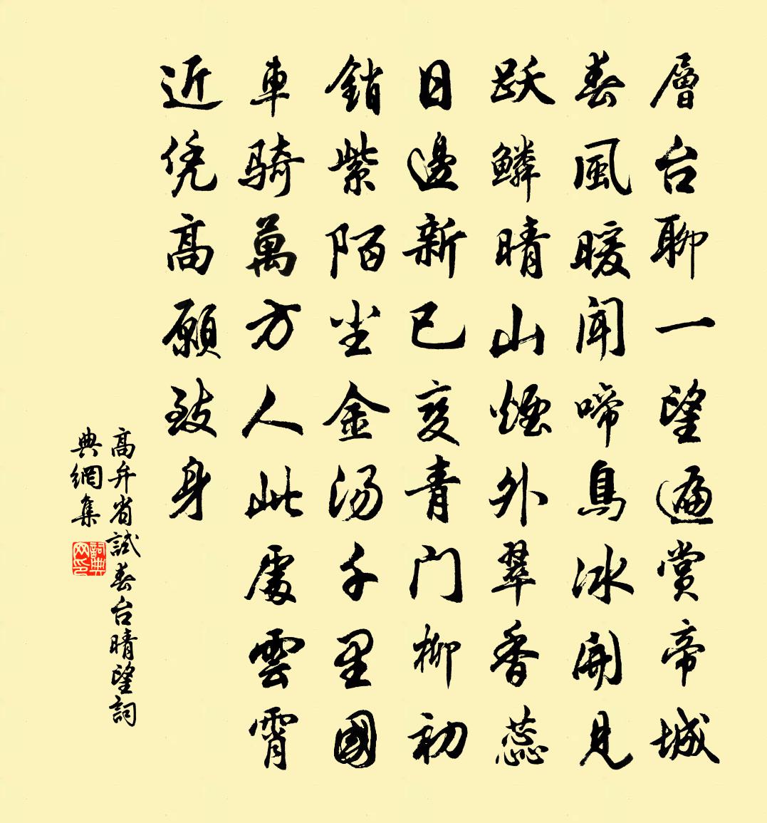 詩詞名句歷史字典書法欣賞書法字典國語詞典說文解字康熙字典古漢語字典標 題 作 者 詩 句 省試春台晴望作者:高弁 朝代:唐代省試春台晴望原文層台聊一望,遍賞帝城春。風暖聞啼鳥,冰開見躍鱗。晴山煙外翠,香蕊日邊新。已變青門柳,初銷紫陌塵。金湯千里國,車騎萬方人。此處雲霄近,憑高願致身。詩詞問答問:省試春台晴望的作者是誰?答:高弁問:省試春台晴望寫於哪個朝代?答:唐代問:省試春台晴望是什麼體裁?答:五排高弁省試春台晴望書法欣賞省試春台晴望書法作品注釋全唐詩:卷368-21詩詞推薦三法自然歌晃逈〔宋代〕心本不愆自然戎,何用科條防毀敗。心本不動自然定,何用勤勞止自兢。心本不迷自然慧,何用參尋叩倫類。即今和敬禪師茶偈鄭清之〔宋代〕睡蛇纏繞黑甜時,棒喝全提落鈍機。管取一甌先看到,三更日出有誰知。次韻和秀上人游南五台司空圖〔唐代〕中峰曾到處,題記沒蒼苔。振錫傳深谷,翻經想舊台。危松臨砌偃,驚鹿驀溪來。內殿御詩切,身回心未回。呂大監餉鮆魚十尾梅堯臣〔宋代〕日暖楊花四散開,江邊鮆魚無數來。伊魴洛鯉不堪憶,丙穴漾陂何可咍。賀監休思鏡湖去,應知李白跨鯨回。趙濟民生日陳起〔宋代〕今歲呈祥殊勝昔,六花端為壽筵開。小詩聊寓千秋意,不得相陪法喜來。晏元獻公輓辭三首歐陽修〔宋代〕富貴優遊五十年,始終明哲保身全。一時聞望朝廷重,餘事文章海外傳。舊館池台閒水石,悲笳風日慘山川。解官送水部張郎中彥回宰洛陽鄭谷〔唐代〕何遜蘭休握,陶潛柳正垂。官清真塞詔,事簡好吟詩。春漏懷丹闕,涼船泛碧伊。已虛西閣位,朝夕鳳書追。水龍吟黃霽宇〔宋代〕麗華花一握青絲花,金珠粟花粟香環里花。春窺綺閣,新妝風舞,銖衣如碎。翠鳳蒼虬,騎來下界,蝶驚蜂避。甚偈釋智策〔宋代〕著意忘懷,掘地深埋。空洞無象,髑髏妄想。譬如兩鏡相照,中間早已立象。直饒東澗水流西澗水,南山燒炭北山吏部舊語佚名〔唐代〕長名以前,選人屬侍郎。長名以後,侍郎屬選人。楚宮春慢仲殊〔宋代〕輕盈絳雪。乍團聚同心,千點珠結。畫館繡幄低飛,融融香徹。笑里精神放縱,斷未許、年華偷歇。信任芳春都不偶成葉茵〔宋代〕留得春風趁馬蹄,日長無事綠楊堤。菜花籬落誰家酒,緩轡長歌過小溪。偈頌一百五十首釋心月〔宋代〕我有一語,在在處處。提起分開,放下捏聚。兩手持來,一手分付。江西曾有言,以此個為主。成父居於普寧寺鐘樓之下辟以為齋舊名坎止近趙蕃〔宋代〕危岑百尺高,下有溪流深。高深日相激,合此無盡音。依韻和公儀龍圖招諸公觀舞及畫三首梅堯臣〔宋代〕陰森園圃牆東地,攜挈兒童樹下吟。更約天邊鳳皇侶,閱書觀畫味尤深。會故人集崔侍郎園池強至〔宋代〕貳卿園沼壓關西,上相篇章絕景宜。舊日宮牆流水過,至今苑地畫圖知。孤花春去猶臨岸,野蔓晴來欲占籬。荀令過大孤山余靖〔宋代〕有形天地分,設險山河壯。孤山鎮南服,峨峨楚之望。中立亡所倚,屹然怪其狀。石嵾入春空,翠柱搘秋浪。片時衡陽龐居士庵釋智愚〔宋代〕居士當年錯用心,渾家不睦到如今。摝籬柄短無人買,空自蕭蕭風滿林。贈吳德秀隱士用來韻李復〔宋代〕不計無成與有成,但能償足百年心。喜營美釀多栽秫,廣蓄奇書盡散金。三代遺文鐘鼎古,五湖秋意畫圖深。超然天柱峰李左史〔宋代〕巉巉千丈插煙空,始見天南一柱峰。絕頂霧開擎日月,半岩雲暝噫雷風。名句推薦樂殊貴賤,禮別尊卑。周興嗣《千字文·全文》 江南三月聽鶯天,買酒莫論錢。吳錫麒《少年游·江南三月聽鶯天》 紫陌紅塵拂面來,無人不道看花回。劉禹錫《元和十年自朗州至京戲贈看花諸君子 / 玄都觀桃花》 重賞之下,必有勇夫。畢沅《續資治通鑑·宋紀·宋紀十七》 四顧山光接水光,憑欄十里芰荷香。黃庭堅《鄂州南樓書事》 嚴妝欲罷囀黃鸝,飛上萬年枝。和凝《喜遷鶯·曉月墜》 心斷新豐酒,銷愁斗幾千。李商隱《風雨》 韶華不為少年留,恨悠悠,幾時休?秦觀《江城子·西城楊柳弄春柔》 長袖善舞,多錢善賈。韓非及後人《韓非子·五蠹》 同欲者相憎,同憂者相親。劉向《戰國策·中山·犀首立五王》