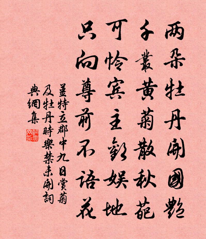 詩詞名句歷史字典書法欣賞書法字典國語詞典說文解字康熙字典古漢語字典標 題 作 者 詩 句 郡中九日賞菊及牡丹時樂禁未開作者:姜特立 朝代:宋代原文兩朵牡丹開國艷,千叢黃1/1菊散秋葩。可憐賓主歡娛地,只向尊前不語花。詩詞問答問:《郡中九日賞菊及牡丹時樂禁未開》的作者是誰?答:姜特立問:該詩寫於哪個朝代?答:宋代書法欣賞郡中九日賞菊及牡丹時樂禁未開書法作品詩詞推薦壽范漕吳泳〔宋代〕粲粲桐花昨夜風,吹香還到鹿園中。前生出處黃山谷,後代風流范蜀公。灑落一襟涵霽月,精神滿面貫晴虹。直須元宵雨十六日晴二首李洪〔宋代〕每恨元宵雨,收燈遽喜晴。喧闐雖倦逐,勃窣漫徒行。入夜寒無賴,隨人月有情。旅懷忘晤賞,擁鼻有詩成。題畫釋文珦〔宋代〕蒲長何已折,秋水碧相涵。日照沙洲暖,鴛鴦睡正酣。和司徒侍中壬子寒食會壓沙寺詩二首強至〔宋代〕四照梨花一色中,他時珍賞有雌雄。高牙就景開芳宴,皓齒停歌誦正風。樂極光陰窮日御,詩成造化奪春工。佳辰戊午生朝和居厚弟五絕劉克莊〔宋代〕靈龜曳尾防鑽殼,老蚌潛光怕剖珠。史筆久無兩龔傳,畫家曾有二疏圖。句陶弼〔宋代〕五十溪州五寨城,廣宣恩詔諭蠻情。燕戴復古〔宋代〕聞說烏衣國,低連海上樹。春來避霜雪,秋去長兒孫。華屋語如訴,故巢多不存。雙飛惱幽獨,紅袖有啼痕。自贊釋慧性〔宋代〕橫按吹毛,全提正令。毀佛謗法,因邪打正。有進裂轉麵皮,三下衲僧乞命。已亥雜詩 137龔自珍〔清代〕故人有子尚饘粥,抱君等身大著作。劉向而後此大宗,豈同陳晁竟目錄。次韻邢懷正通判游蔣山周必大〔宋代〕仙人薄蓬萊,乘槎度河滸。舊觀桑田變,今訪鐘山古。駕言出東門,恍若之帝所。朝曦霽青霜,楓葉落紅雨。亭亭山水堂軸唐寅〔明代〕松濤謖謖響秋風,雲影巒光凈太空。何事幽人常獨立,只緣詩意滿胸中。堤上柳陳允平〔宋代〕暗黃搖曳六橋雲,萬戶千門一日春。休把柔條都折盡,明朝多少出城人。風中柳令/謝池春佚名〔宋代〕愛鬢雲長,惜眉山,尋乍相見,一時眠起。為伊尚驗,未欲將言相戲。早樽前、會人深意。霎時間阻,眼兒早巴巴秋柳四首·其二王士禎〔清代〕娟娟涼露欲為霜,萬縷千條拂玉塘。浦里青荷中婦鏡,江乾黃竹女兒箱。空憐板渚隋堤水,不見琅琊大道王。若過偶成趙汝鐩〔宋代〕青雲得志士,頤指快所欲。萬事付杯酒,粉黛貯金屋。嗟我骨相窮,不受富貴逐。嗜欲人所同,有時未免欲。青奴花心動·柳吳文英〔宋代〕十里東風,裊垂楊、長似舞時腰瘦。翠館朱樓,紫陌青門,處處燕鶯晴晝。乍看搖曳金絲細,春淺映、鵝黃如酒。漳州陽亭言事寄於使君方乾〔唐代〕謝守登城對遠峰,金英泛泛滿金鐘。樓頭風景 * 月,床下水雲千萬重。紅旆朝昏雖許近,清才今古定難逢。鯉魚窳尊絕句錢文子〔宋代〕招邀風月須坡叟,管領江山屬漫郎。更築危亭依巨石,顧從二子老滄浪。過秦樓鄧有功〔宋代〕燕蹴花飛紅,鶯花遷新綠,花幾陣晚來花風急。謝家池館,金谷園林,還又把春虛擲。年時恨雨愁雲,物換星移,題天竺岩棲山房釋斯植〔宋代〕一室寄雲隈,憑欄日幾回。無風山自雨,有主燕還來。野徑通樵遠,岩花向晚開。舊時題數壁,今已半蒼苔。名句推薦楊枝飄泊,桃根嬌小,獨自個思量。項鴻祚《太常引·客中聞歌》 日落謝家池館,柳絲金縷斷。韋莊《歸國遙·春欲晚》 置酒望白雲,商飆起寒梧。李白《登單父陶少府半月台》 微微風簇浪,散作滿河星。查慎行《舟夜書所見》 飯疏食飲水,曲肱而枕之,樂亦在其中矣。不義而富且貴,於我如浮雲。孔子弟子《論語·述而篇》 黃鸝囀處誰同聽,白菊開時且剩過。司空圖《白菊雜書四首》 白水滿春塘,旅雁每迥翔。沈約《詠湖中雁》 若得山花插滿頭,莫問奴歸處。嚴蕊《卜運算元·不是愛風塵》 煙霏雲斂;其容清明,天高日晶;歐陽修《秋聲賦》 仁人之事者,必務求興天下之利,除天下之害。墨子《墨子·16章 兼愛(下)》
